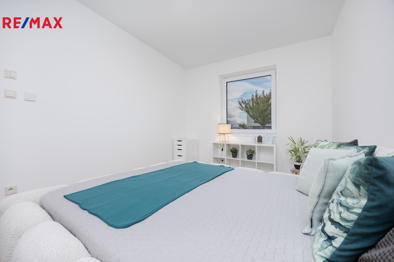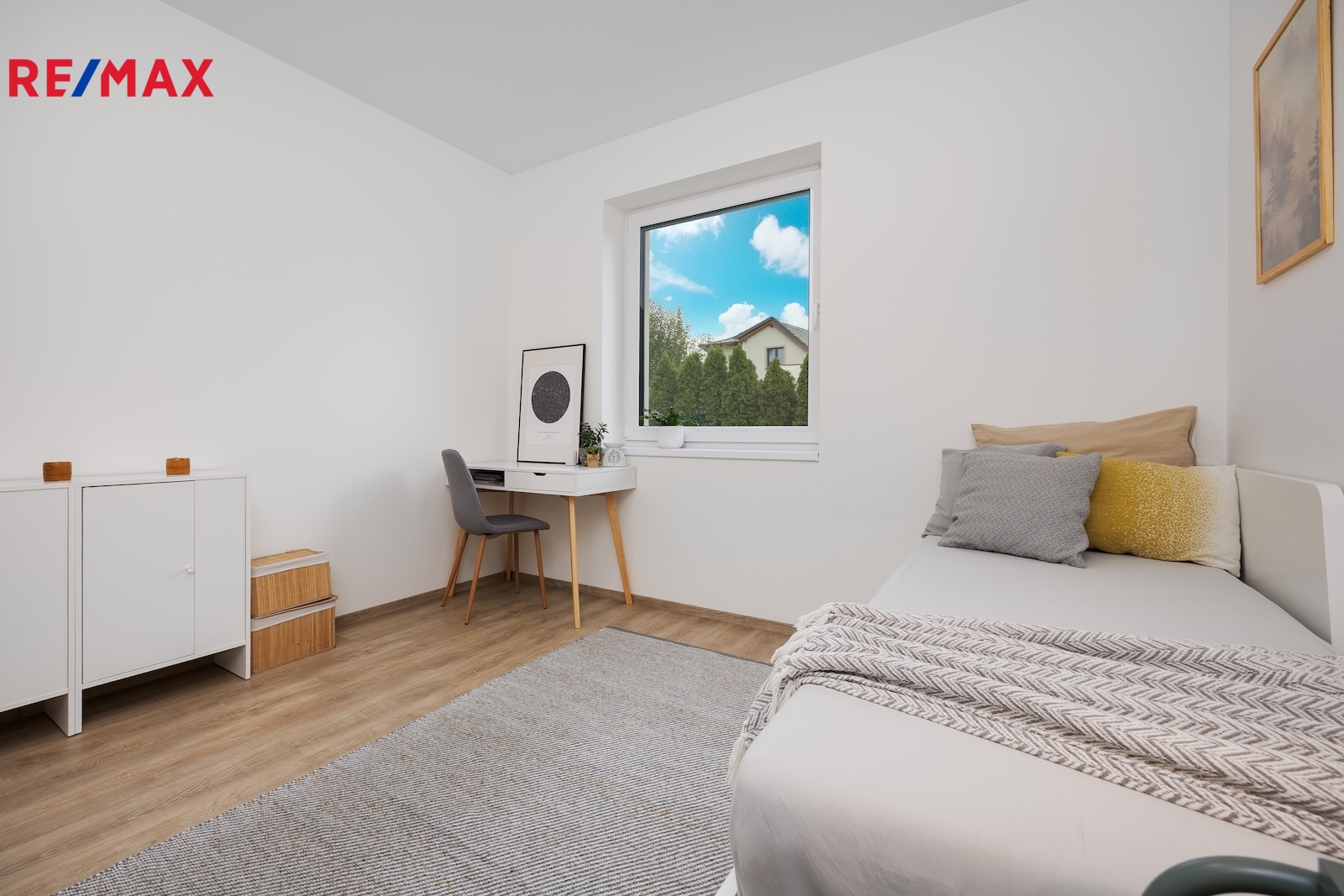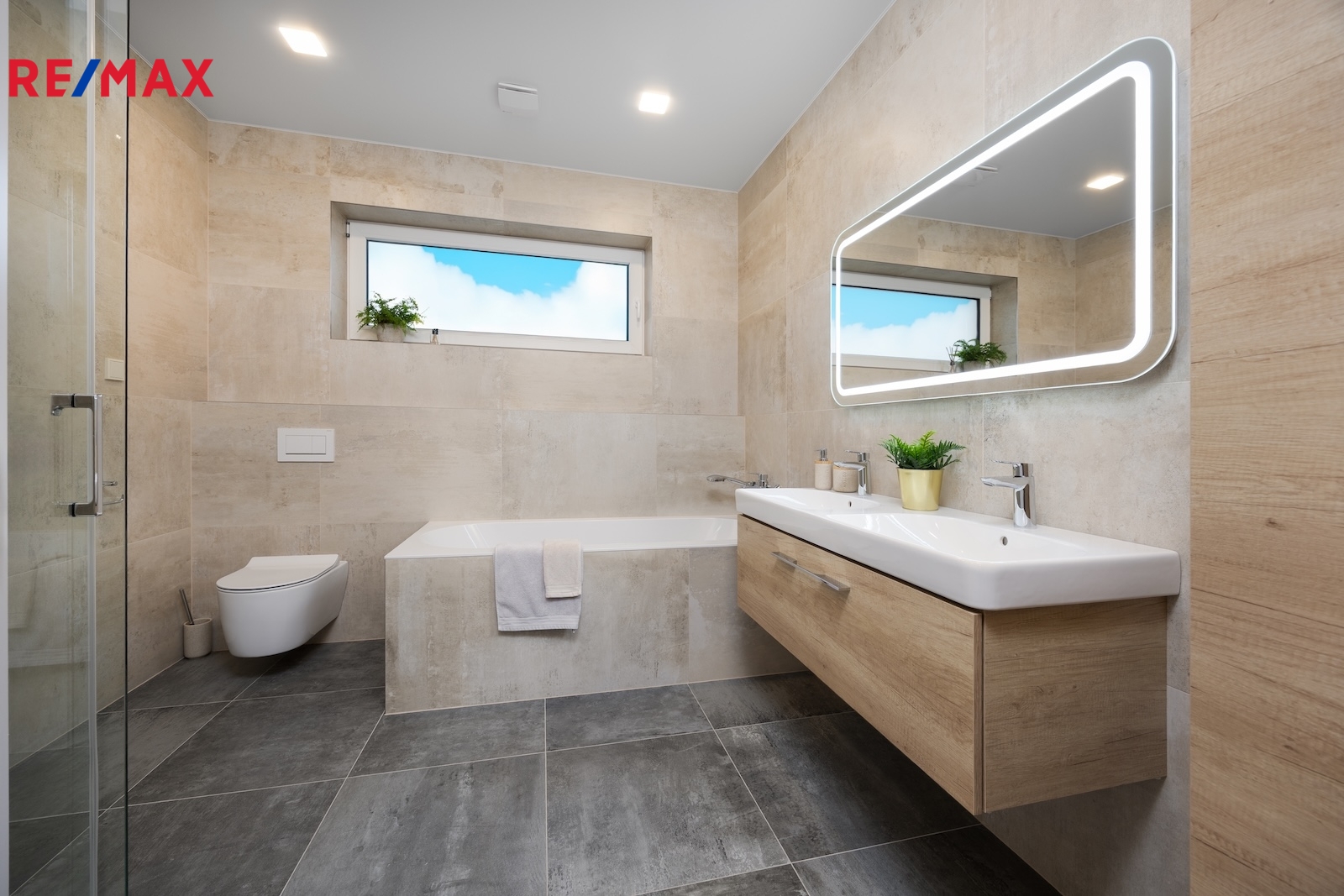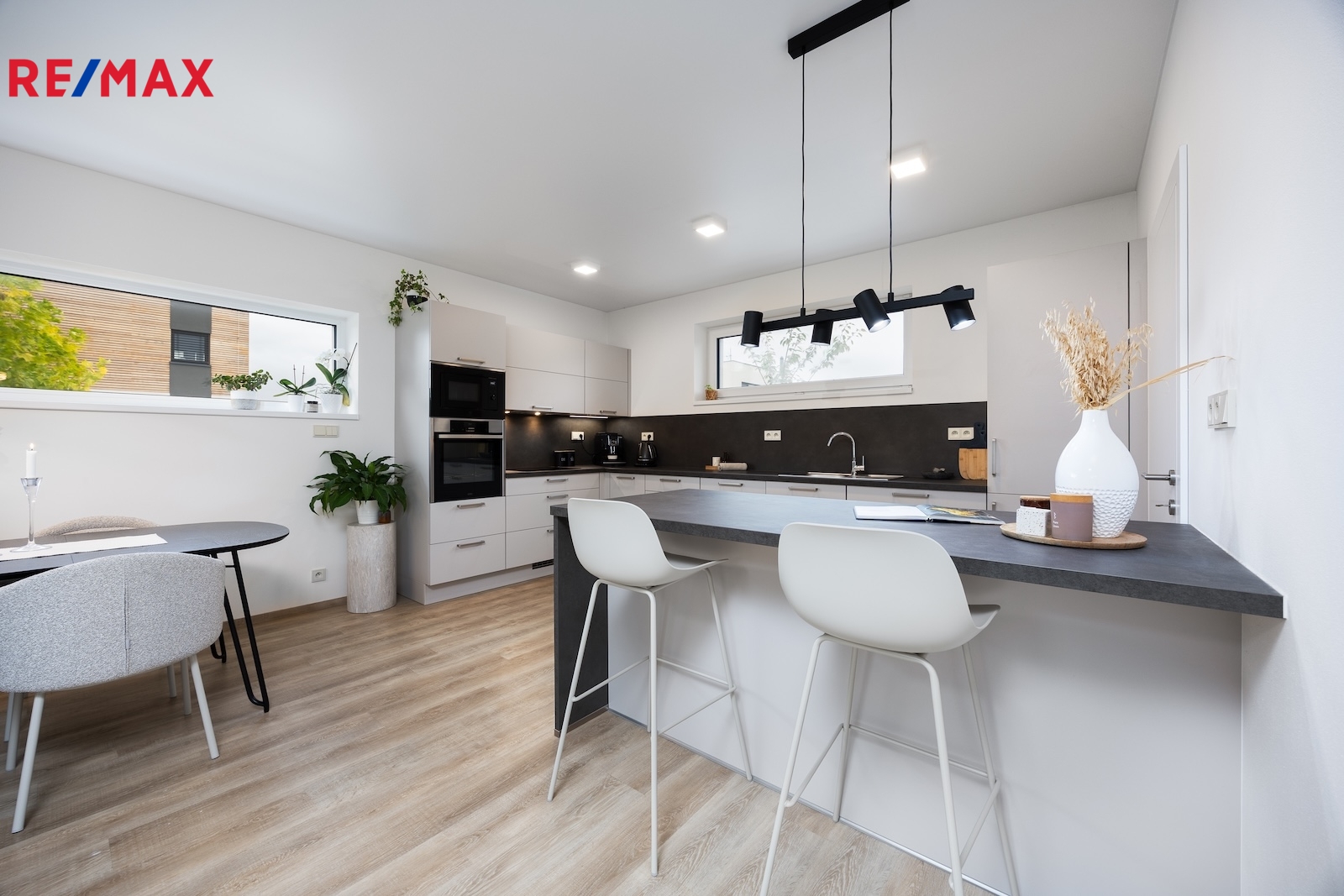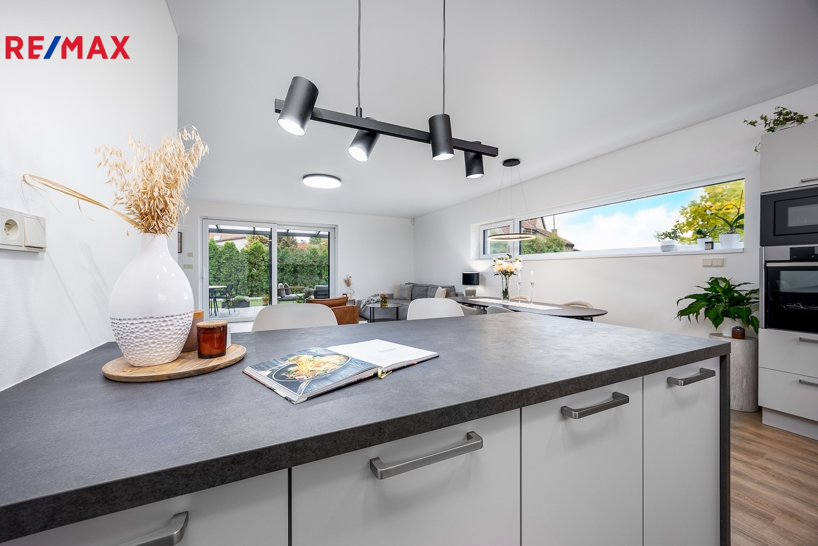 Dominantou domu je světlý obývací pokoj s kuchyní a přímým vstupem na terasu. K dispozici jsou tři samostatné ložnice, koupelna s vanou i sprchovým koutem, dvě samostatné toalety, praktická spíž a technická místnost. Dům je vybaven moderními technologiemi – teplovodním podlahovým vytápěním poháněným tepelným čerpadlem vzduch–voda, klimatizací, fotovoltaikou, venkovními žaluziemi a chytrou domácností s dálkovým ovládáním vstupu, topení i alarmu. Samozřejmostí je kamerový systém, brána na dálkové ovládání a vestavěné úložné prostory. Díky energeticky úspornému provozu se aktuální náklady na elektřinu a vytápění pohybují kolem 2 700 Kč měsíčně.