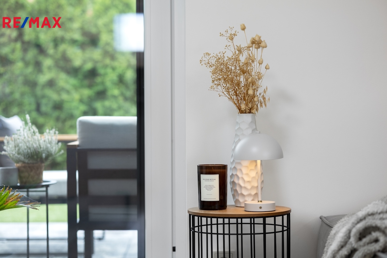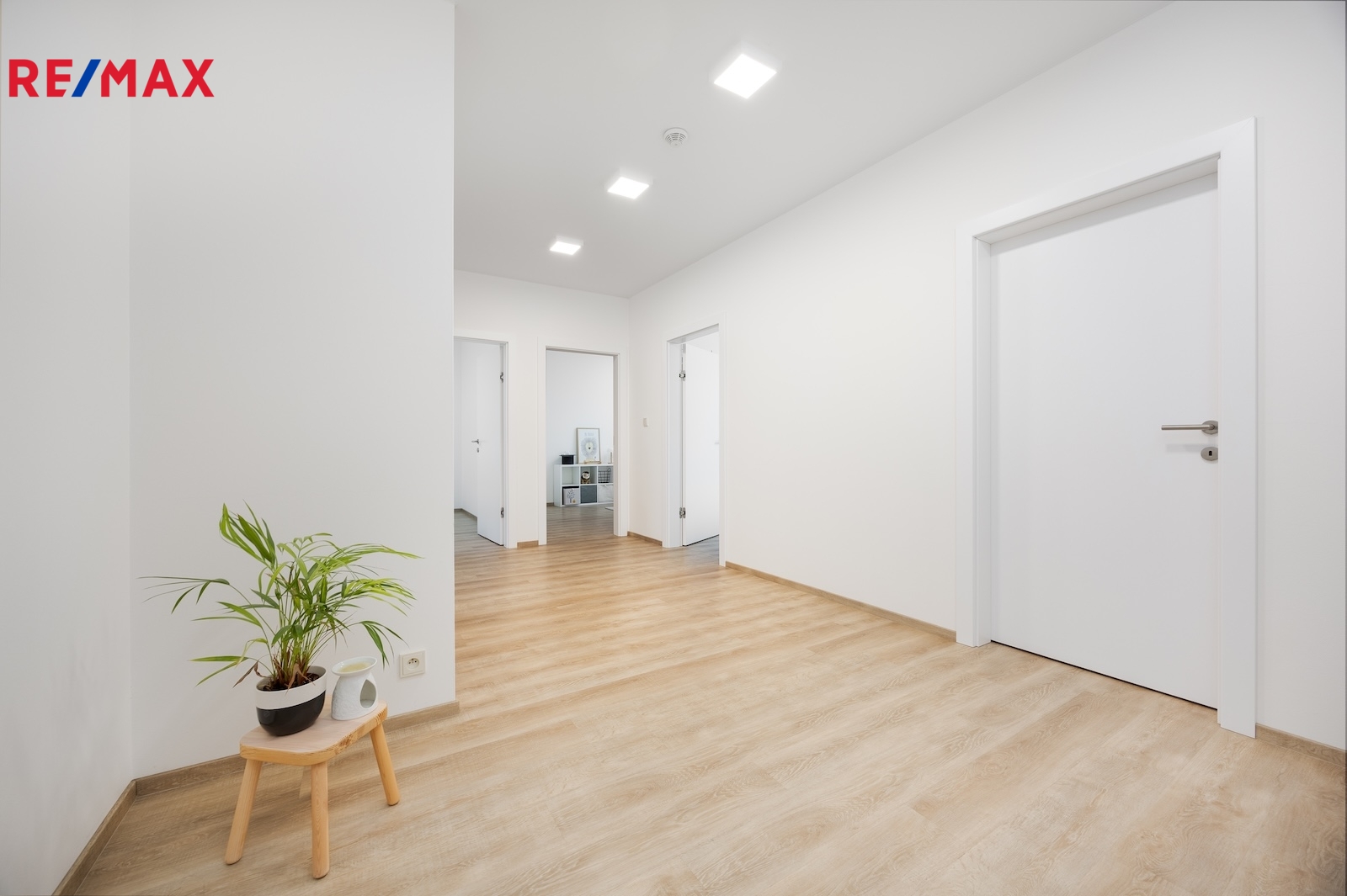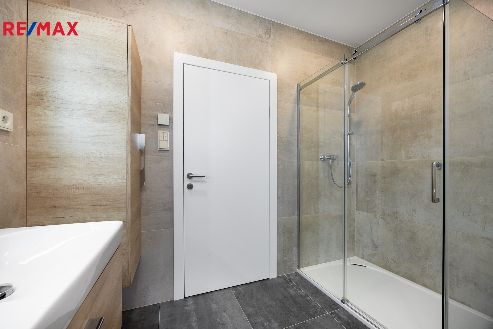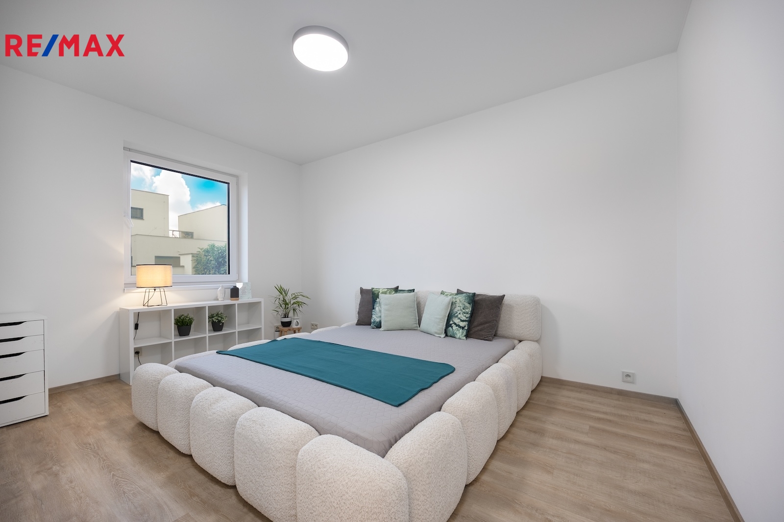 Dominantou domu je světlý obývací pokoj s kuchyní a přímým vstupem na terasu. K dispozici jsou tři samostatné ložnice, koupelna s vanou i sprchovým koutem, dvě samostatné toalety, praktická spíž a technická místnost. Dům je vybaven moderními technologiemi – teplovodním podlahovým vytápěním poháněným tepelným čerpadlem vzduch–voda, klimatizací, fotovoltaikou, venkovními žaluziemi a chytrou domácností s dálkovým ovládáním vstupu, topení i alarmu. Samozřejmostí je kamerový systém, brána na dálkové ovládání a vestavěné úložné prostory. Díky energeticky úspornému provozu se aktuální náklady na elektřinu a vytápění pohybují kolem 2 700 Kč měsíčně.