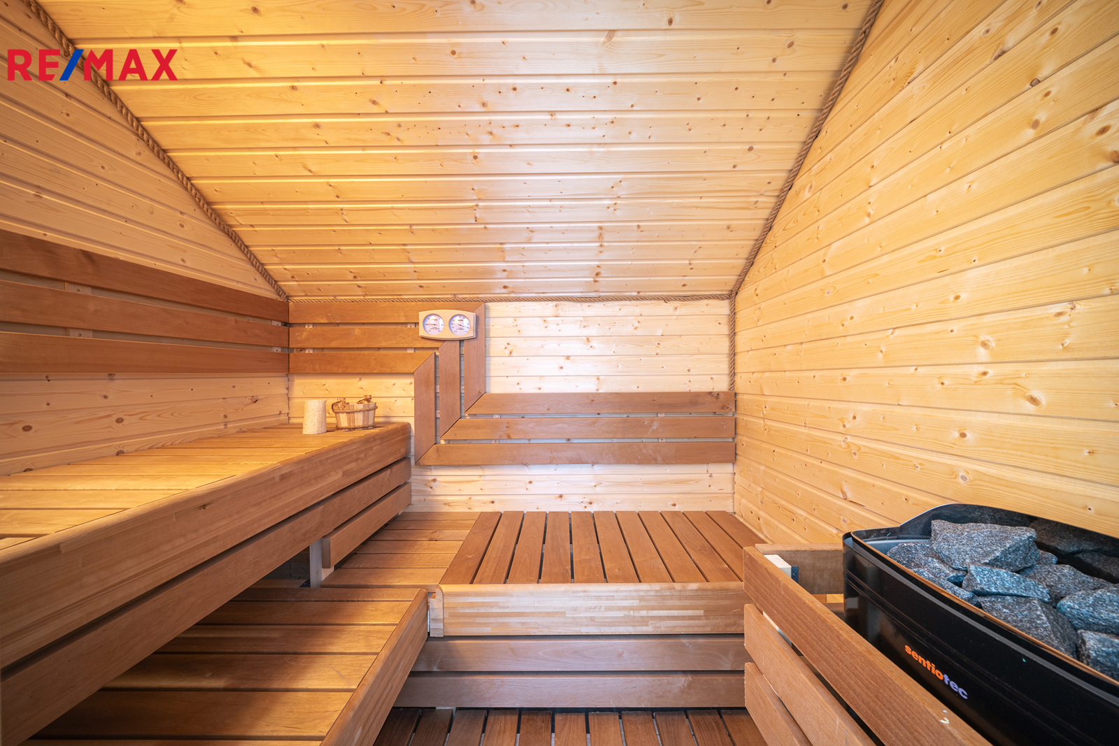 - Centrální hala se saunou, relaxačním koutem a vstupem na druhou terasu