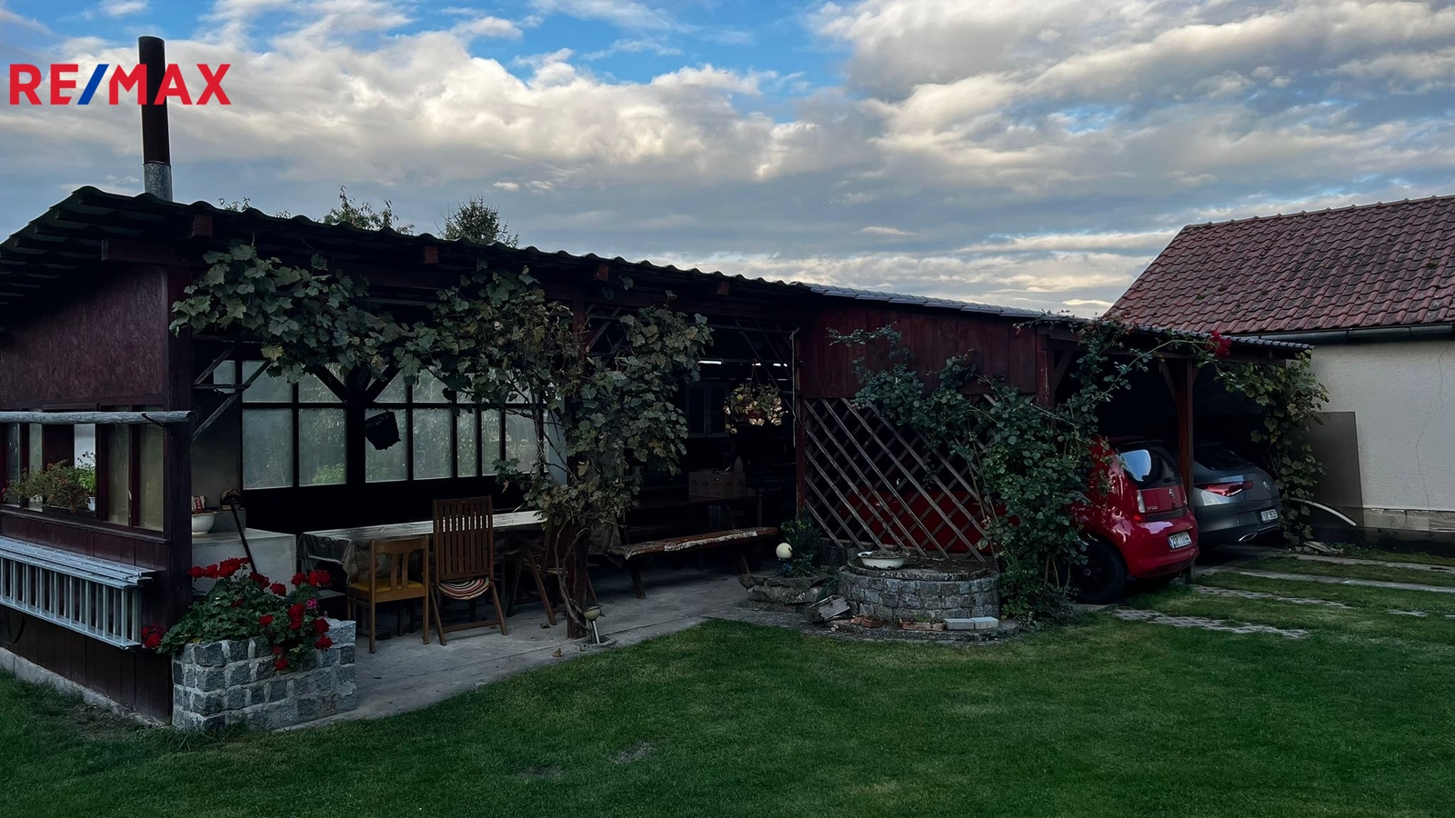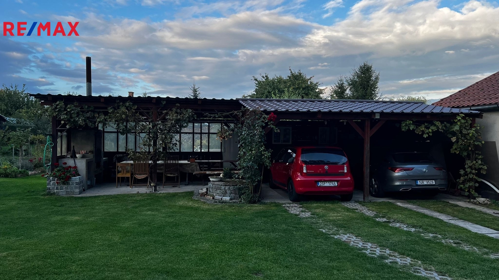 Vraty, navazujícími na pravou část domu se vchází na dvůr zakončený krytým stáním pro dva vozy a pergolou s krbem a posezením s venkovní kuchyní, která je plně vybavená a sezónně velmi využívána. Plynule navazující zahrada je rozdělena na odpočinkovou část s bazénem a část užitkovou ukončenou skleníkem. Celý pozemek, i když je obklopen dalšími parcelami, má druhý samostatný přístup vraty v zadní části, což případně umožnuje rozdělení zahrady na další stavební pozemek.