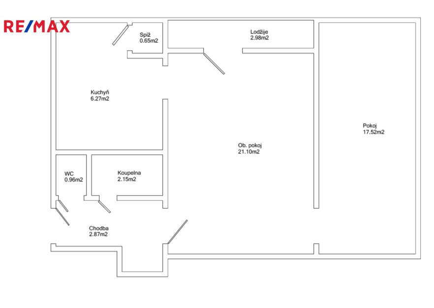 Vstupními dveřmi se přichází do hlavní chodby (2,87 m²), po levé straně se nachází samostatné WC (0,96 m²), a koupelna (2,15 m²) s vanou. Rovně z chodby jsou za sebou dva pokoje (obývací 21,10 m² a ložnice 17,52 m²), v obývacím pokoji se nachází vstup na lodžii (2,98 m²) a do kuchyně (6,27 m²) s praktickou spíží (0,65 m²).