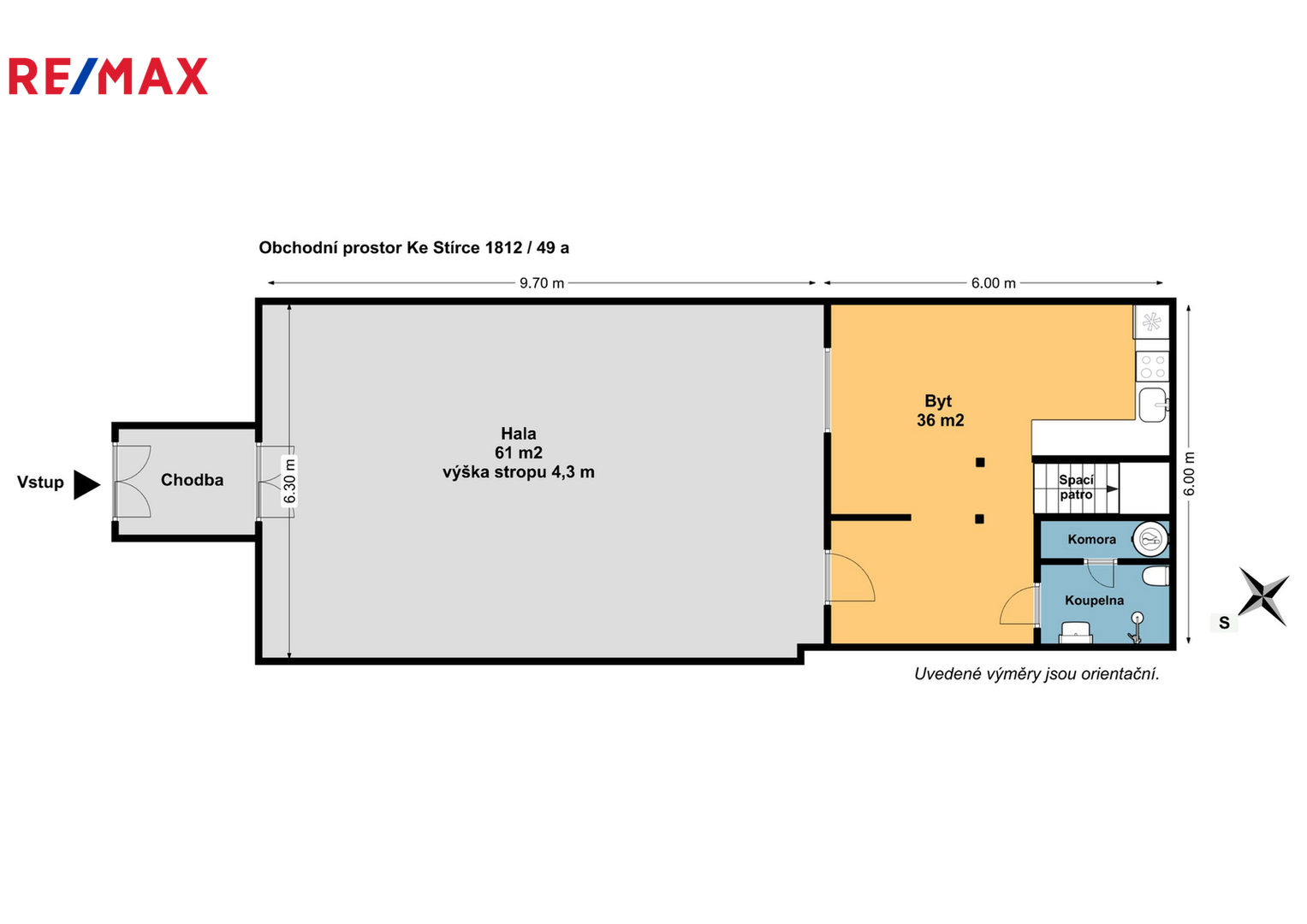 Výměra: 61m² hala, 36 m² byt 1KK, 4m² vstupní chodba. Výška stropu haly 4,3m.