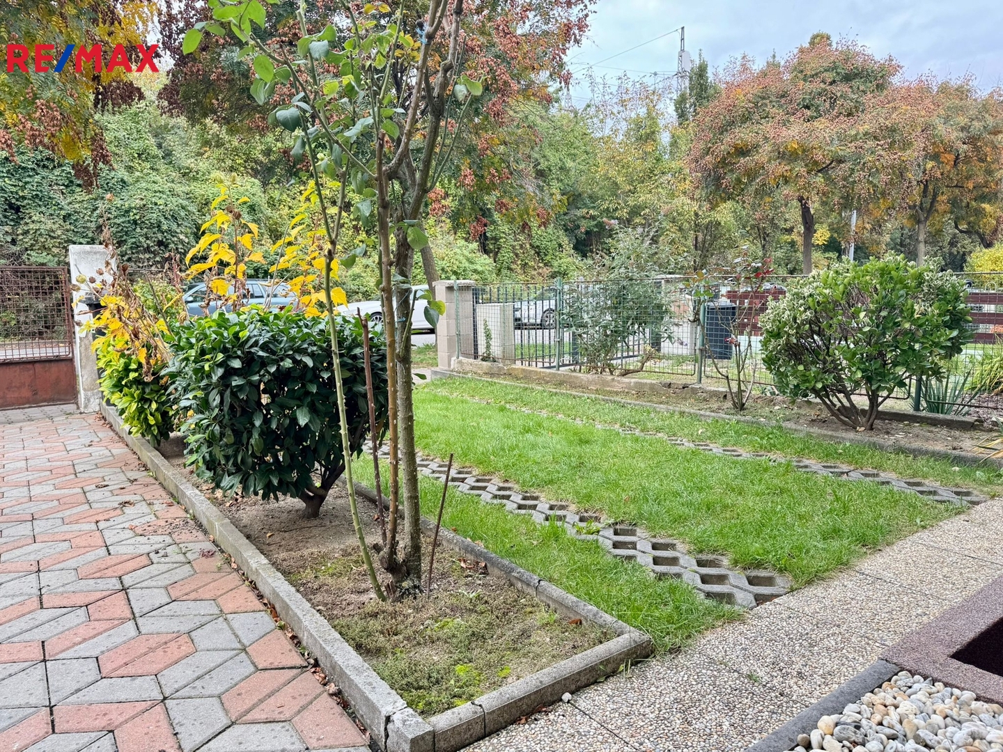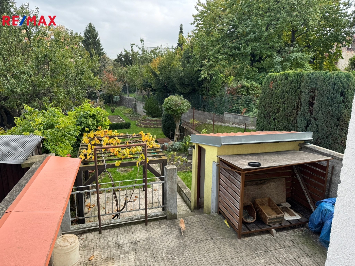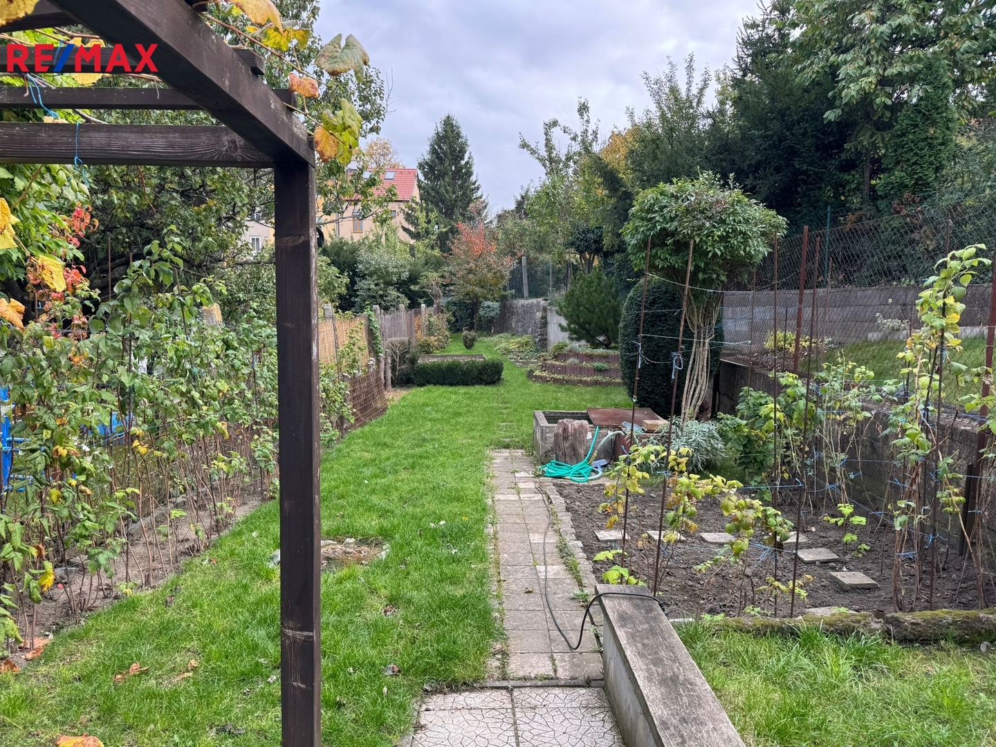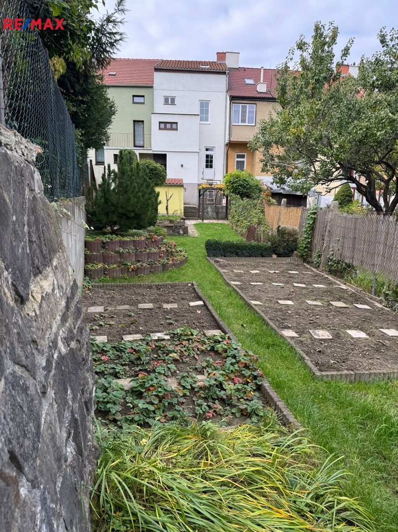 Navazující zahrada ve vnitrobloku rodinných domů je oplocená, její součástí je dvůr s pergolou a posezením a zahradní domek. Zahrada je částečně travnatá s okrasnými prvky a částečně využívaná jako užitková se záhony.