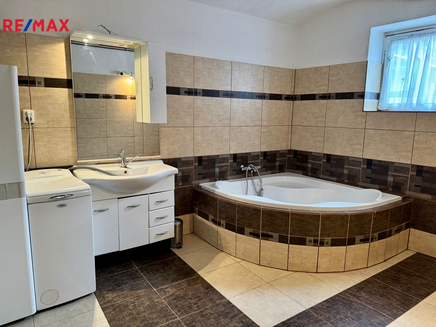 - velká koupelna s rohovou vanou, místem pro pračku, v koupelně je rovněž kondenzační kotel se zásobníkem na teplou vodu, který vytápí celý dům,