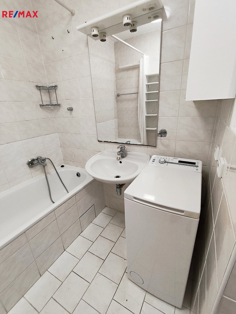 Koupelna je osazena vanou, umyvadlem a pračkou.