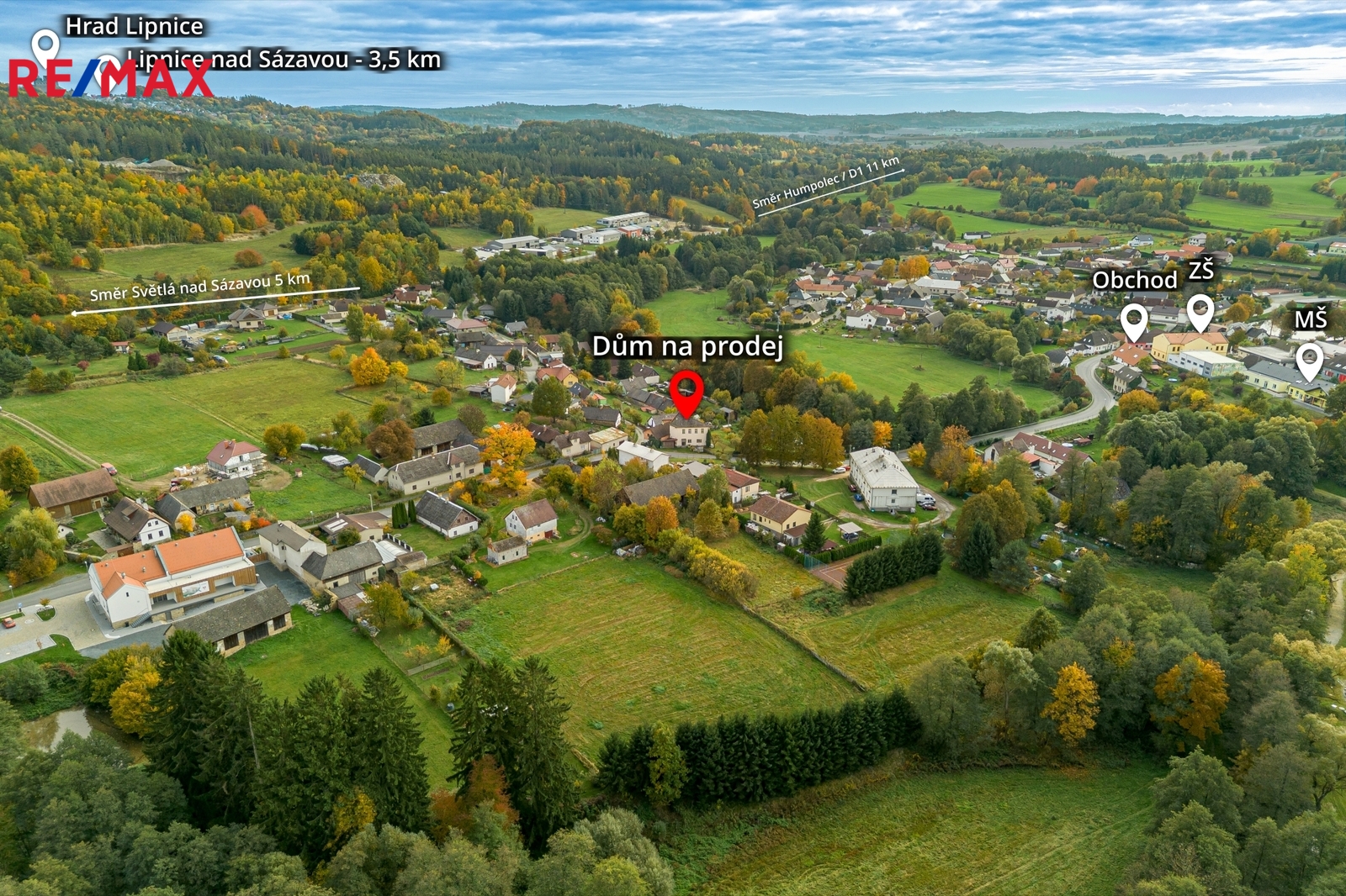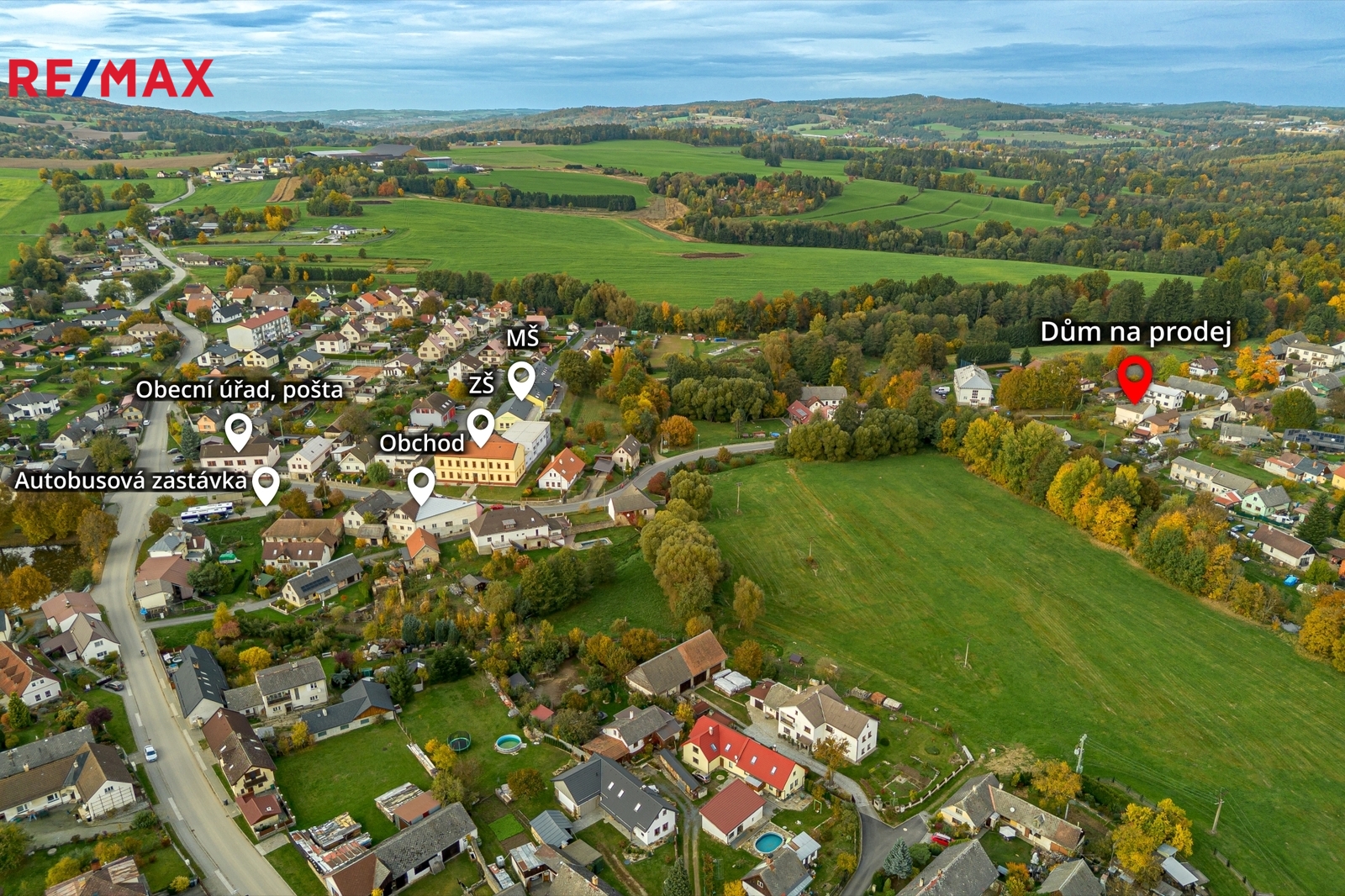 Veškerá občanská vybavenost do 5 minut pěšky – základní a mateřská škola, obchod, pošta, obecní úřad, autobusová zastávka