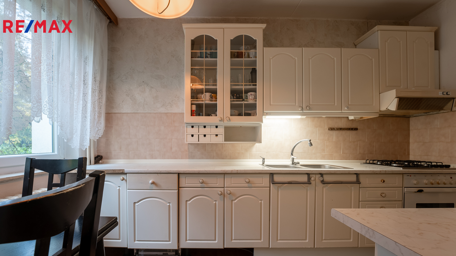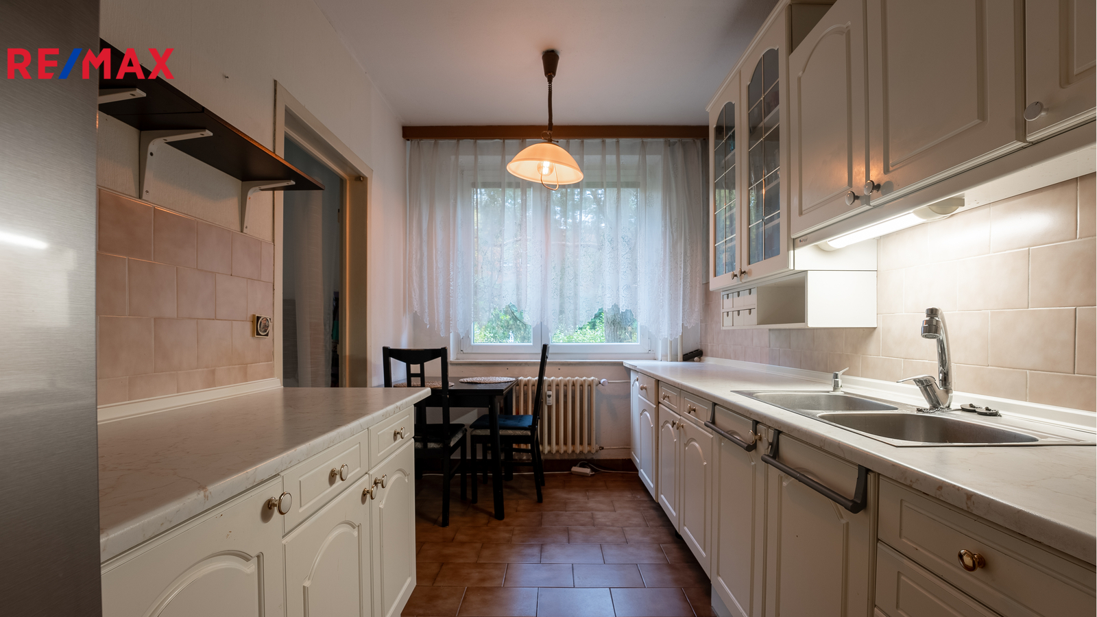 - Kuchyň s jídelním koutem a zachovalou, plně funkční kuchyňskou linkou s myčkou
