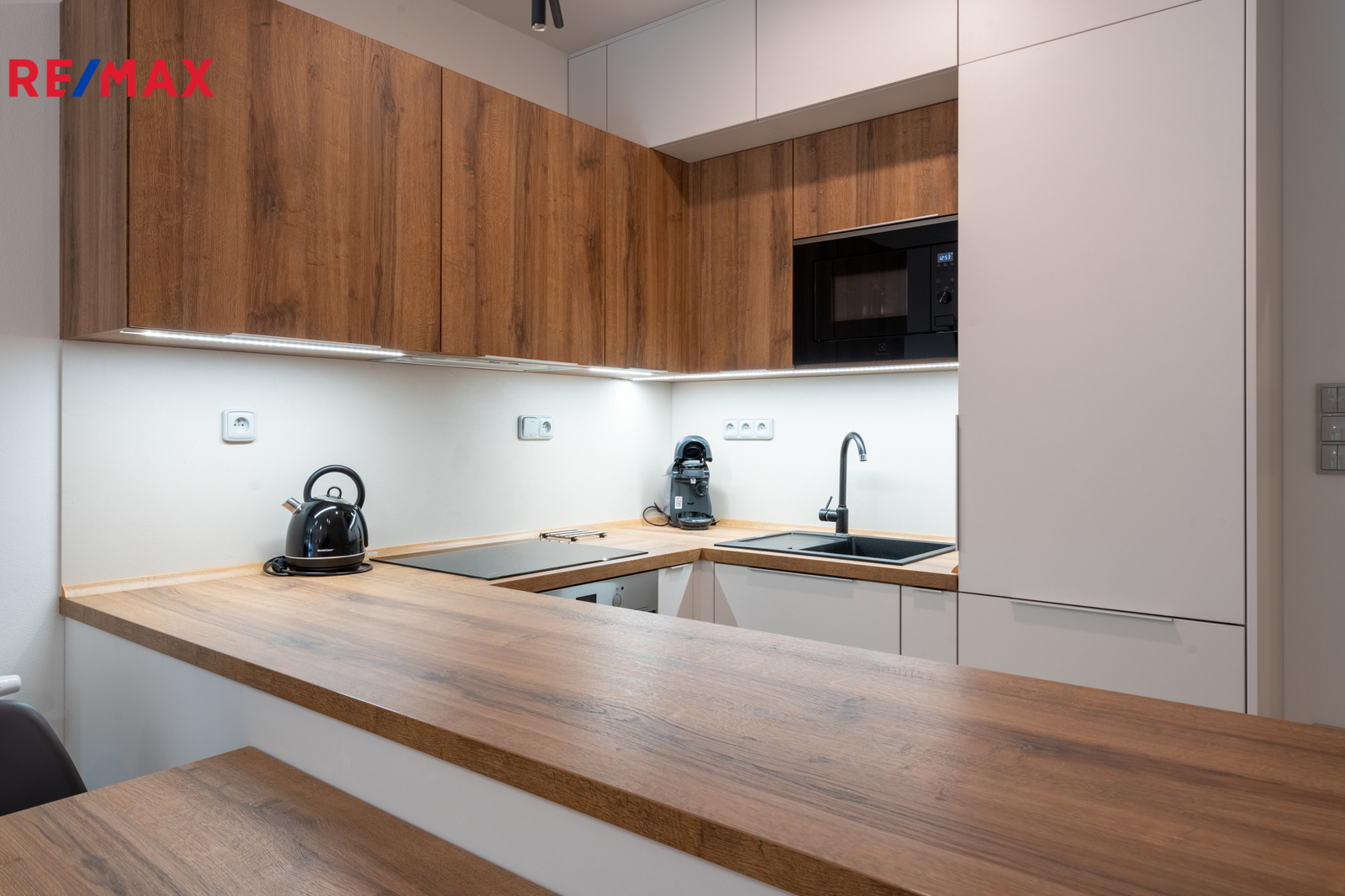 Apartmán je dispozičně řešen jako 1+kk a nabízí příjemně vzdušný prostor. Najdete zde praktický kuchyňský kout s jídelní částí, na který navazuje obývací prostor se spaním. Dominantou celého interiéru je velké prosklení s přímým vstupem na terasu a výhledem do okolí.