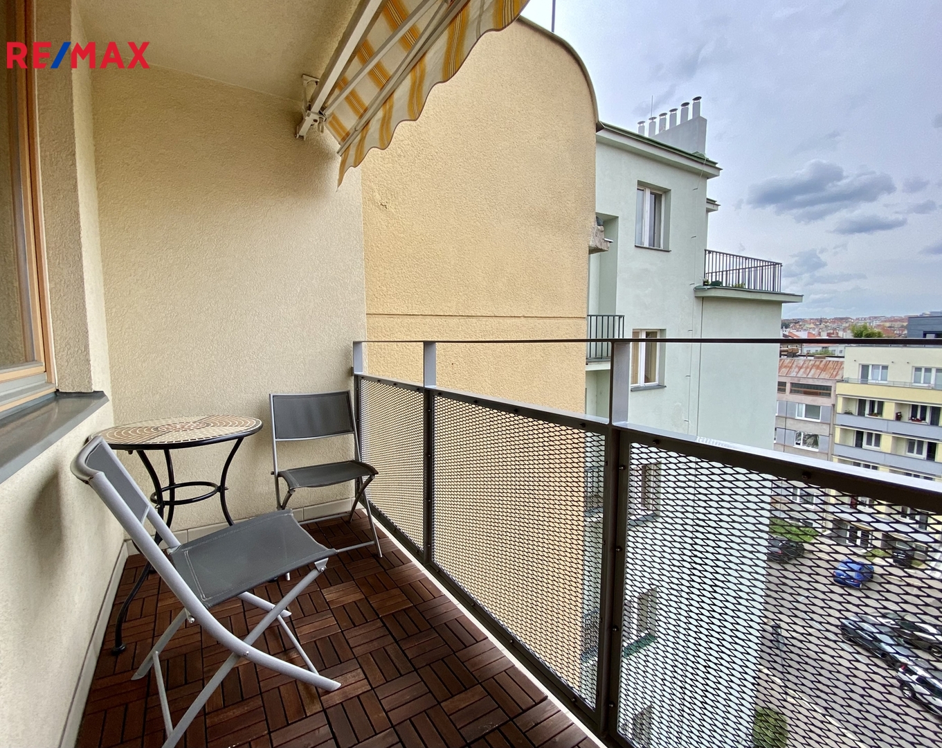 Lodžie je přístupná z obývacího pokoje a je z ní hezký výhled na část Vršovic a Nuslí. Orientace bytu je velice příznivá, na dvě světové strany. Lodžie s obývacím pokojem a dvěma ložnicemi mají orientaci na západ a kuchyň s jídelnou a třetí ložnicí mají výhled do dvora východním směrem.