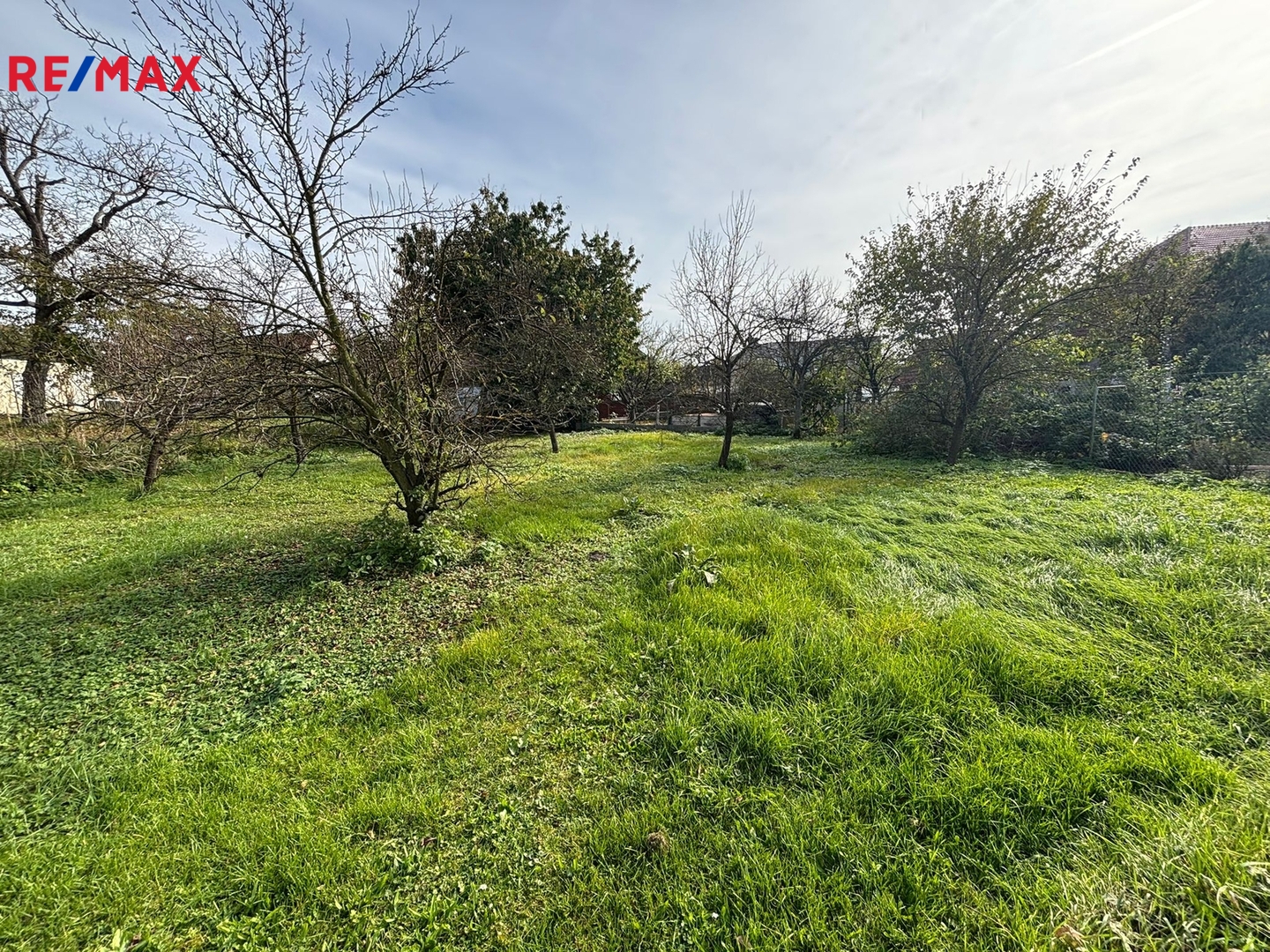 Oplocená zahrada je na rovině, osázená ovocnými stromy a poskytuje dostatek soukromí i prostoru pro odpočinek či rodinné posezení.