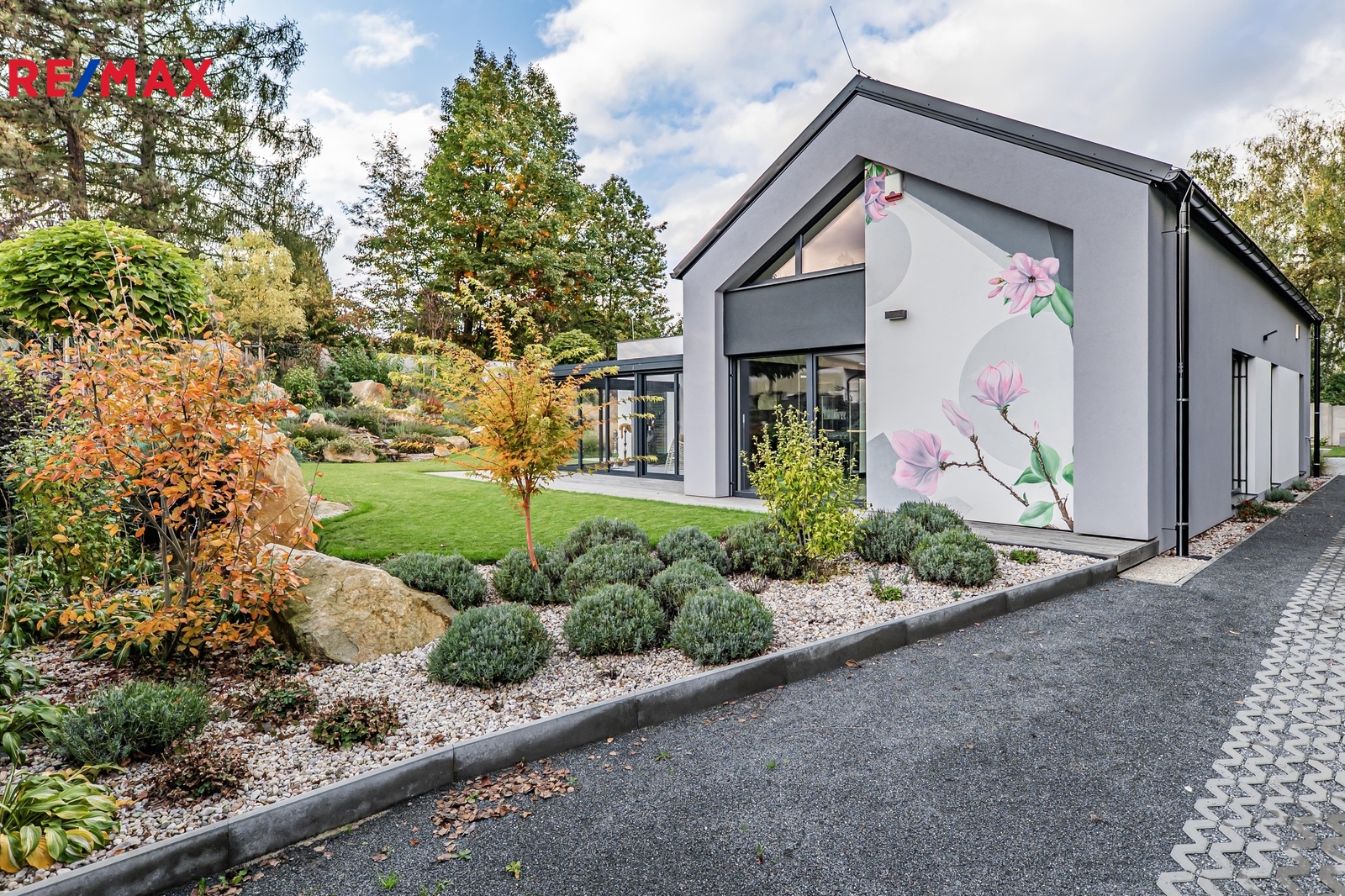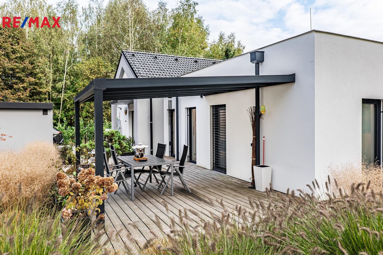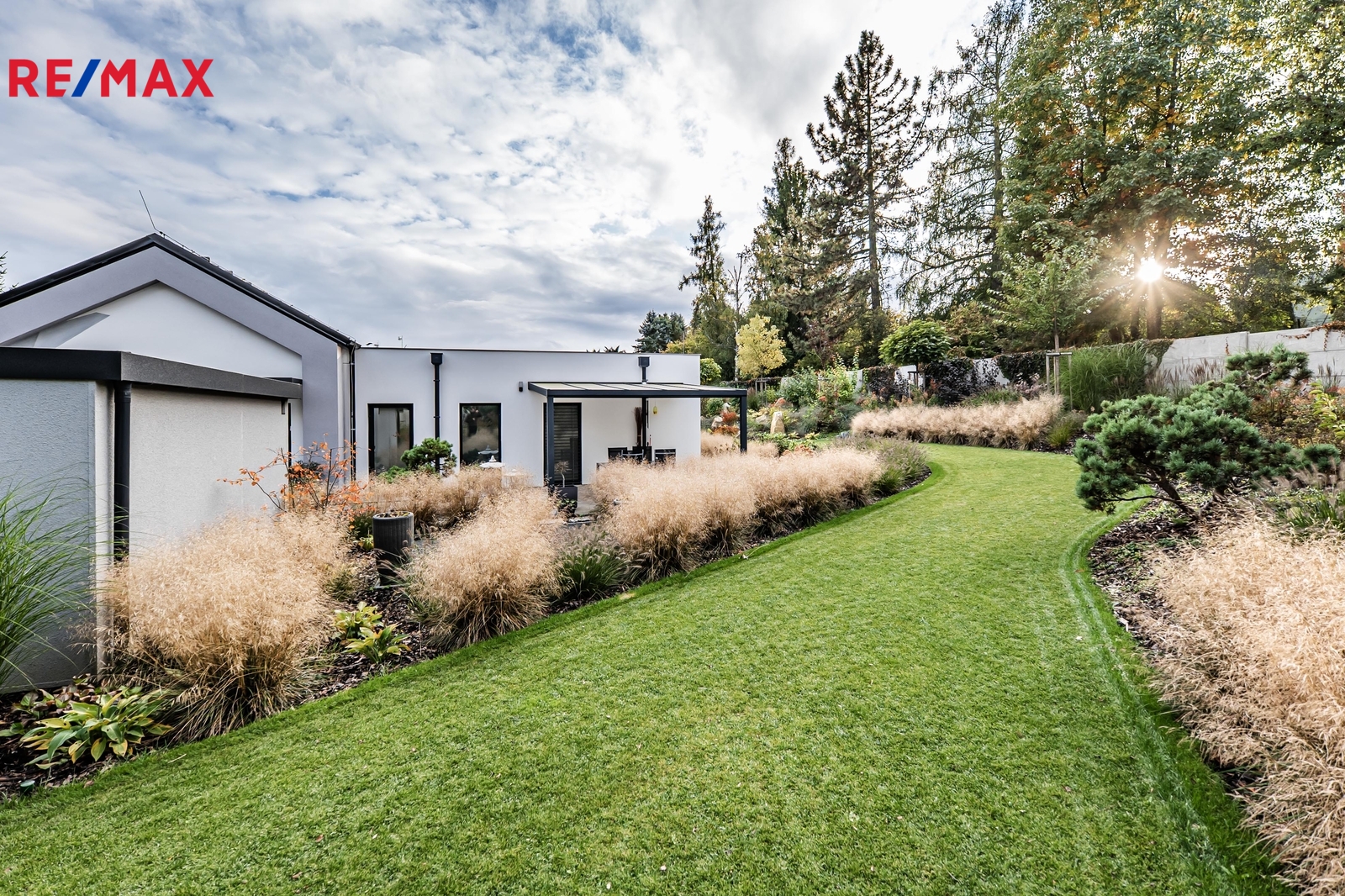 Architektonicky řešená zahrada s vodním prvkem – kaskádou a večerním nasvícením. Automatická zavlažovací soustava napojená na vlastní vrt. Dřevěná terasa po obvodu domu plynule propojuje interiér s exteriérem. Samostatně stojící garáž pro dvě vozidla. Celá koncepce domu a zahrady je navržena jako bezúdržbová.