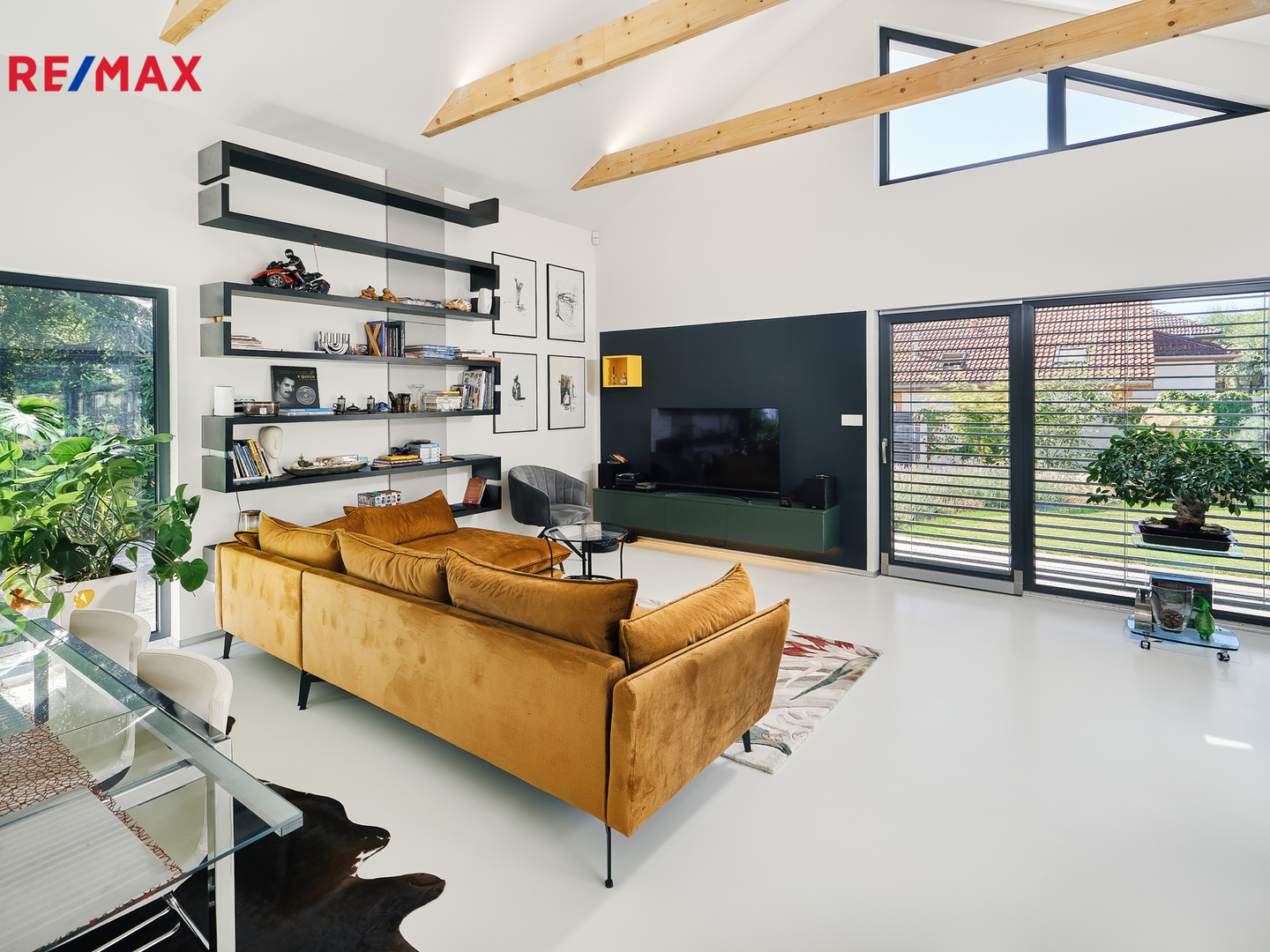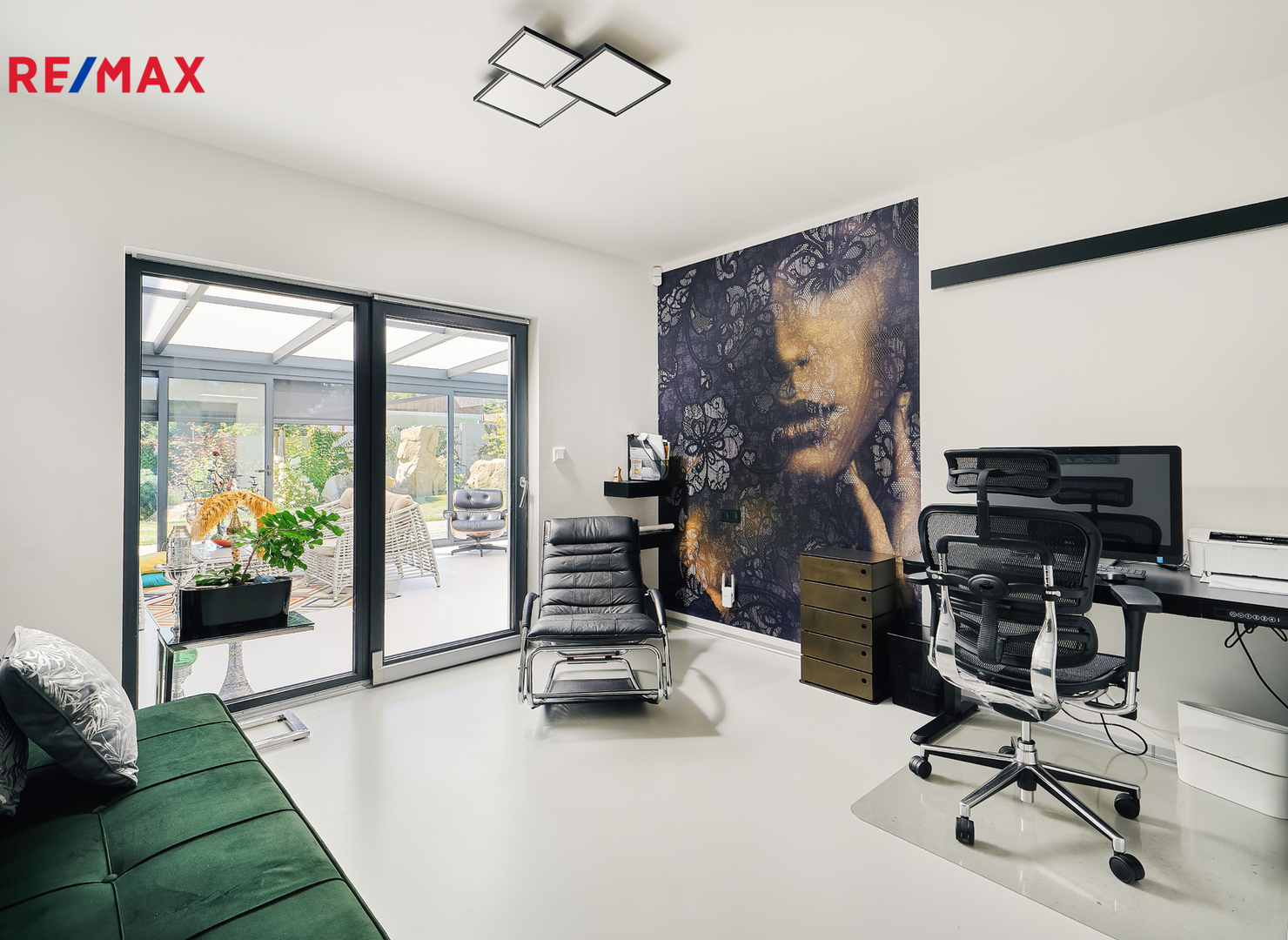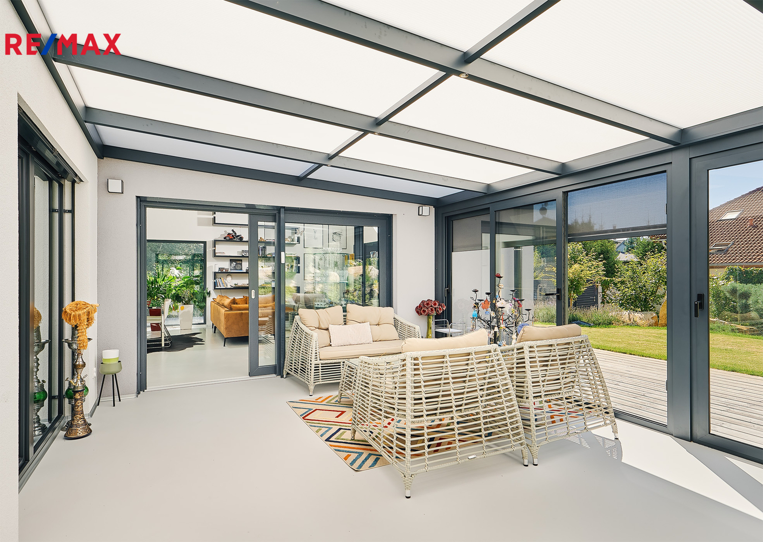 Zimní zahrada (24 m²) – plnohodnotný obytný prostor pro relaxaci, práci i celoroční využití. Vybavena stíněním ISOTRA na dálkové ovládání.