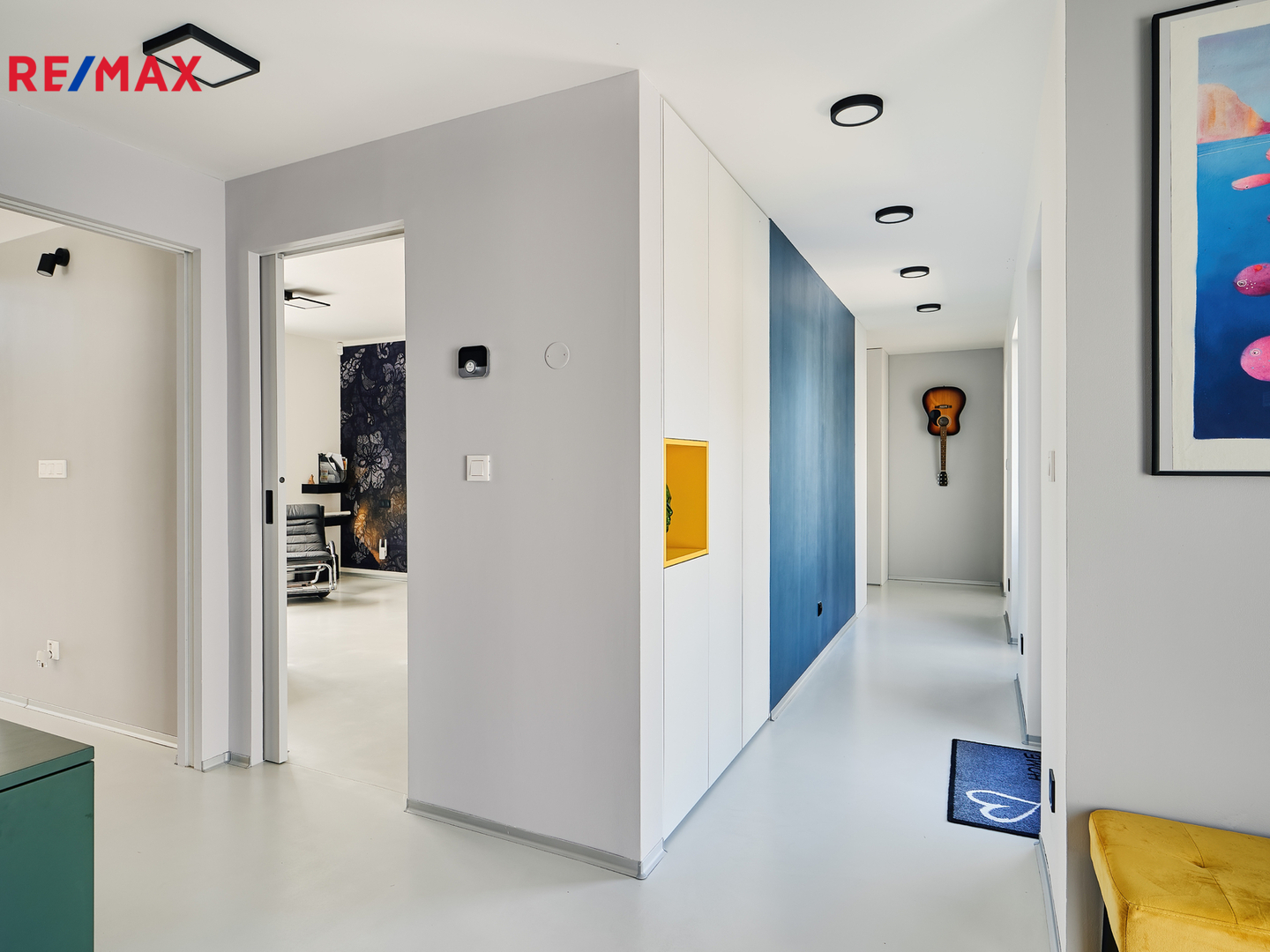 Kuchyň, vstupní chodba a obývací pokoj s nábytkem na míru značky Hanák.