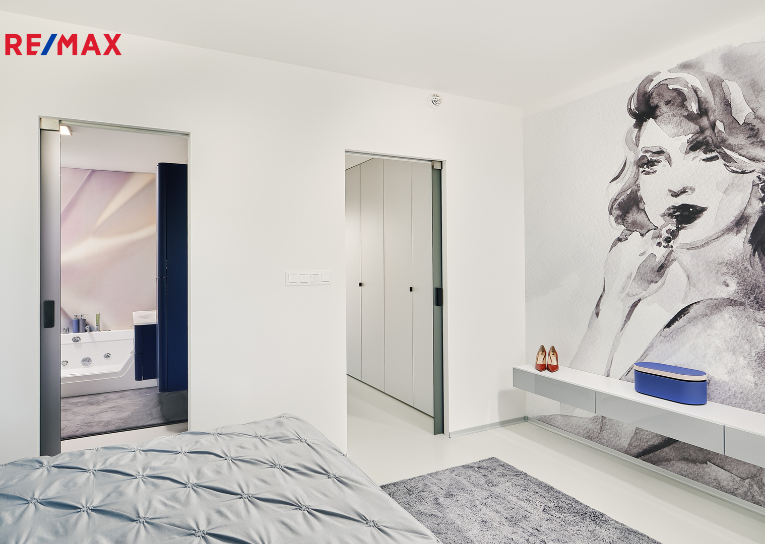 V ložnici a koupelnách jsou použity kvalitní glamour tapety a betonové stěrky s estetickým i praktickým efektem.