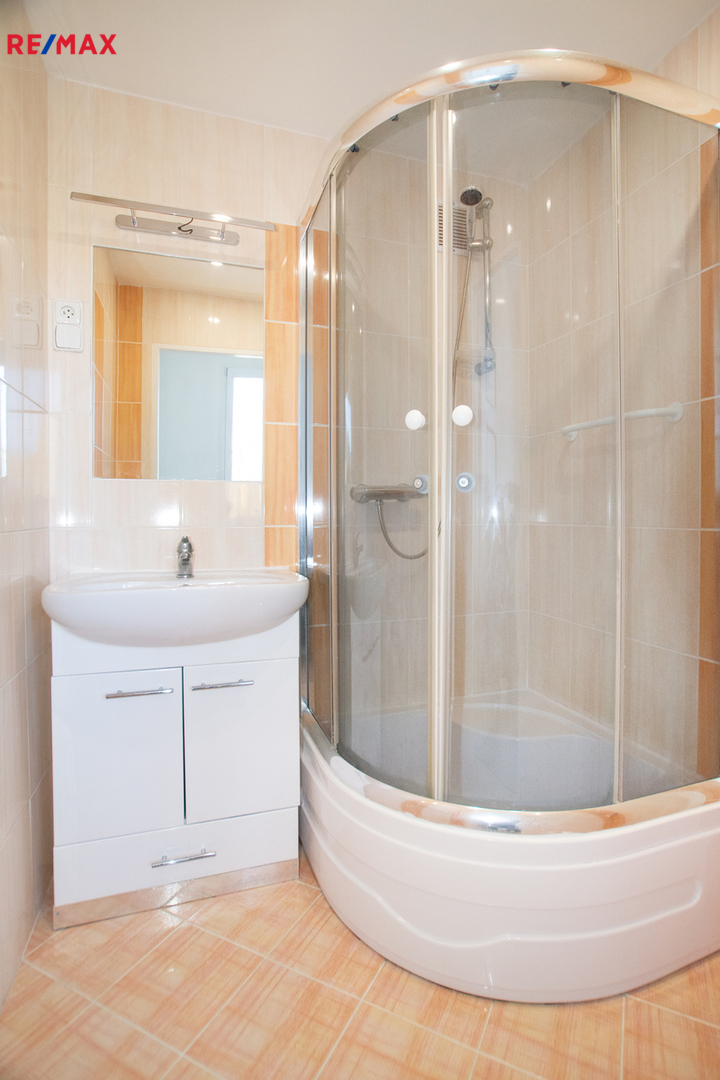 Koupelna se sprchovým koutem má vlastní vstup stejně, jako WC, které má dveře z chodby. Na té je i kumbál na věci, boty atd.