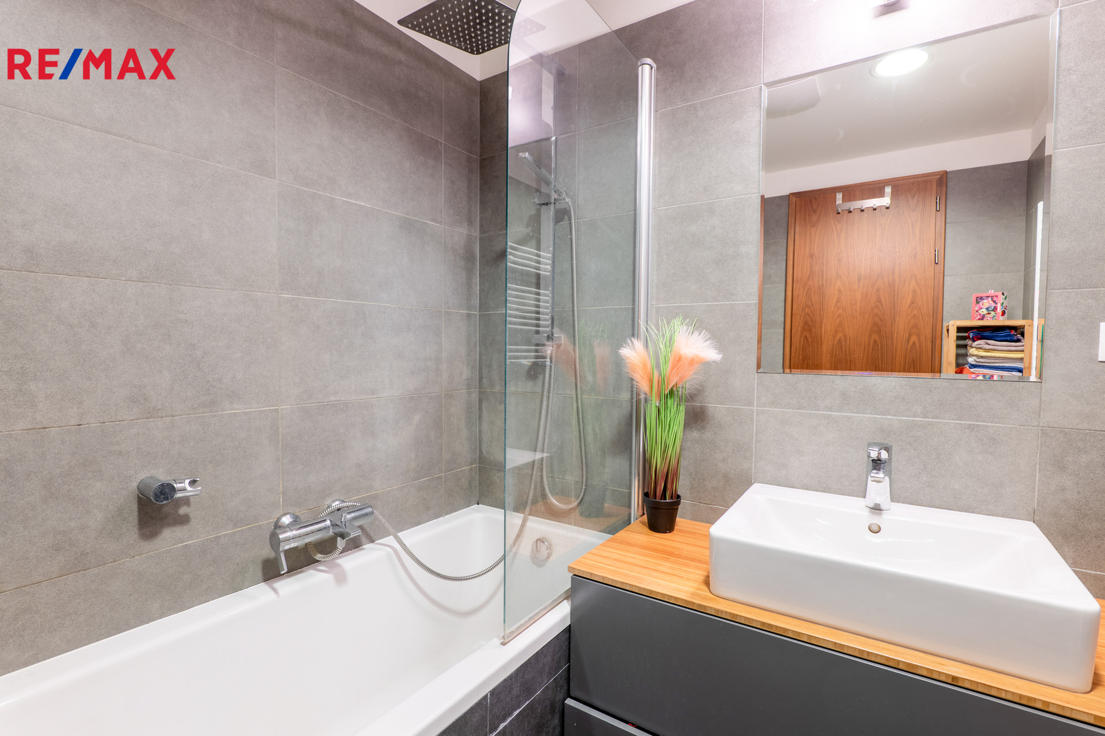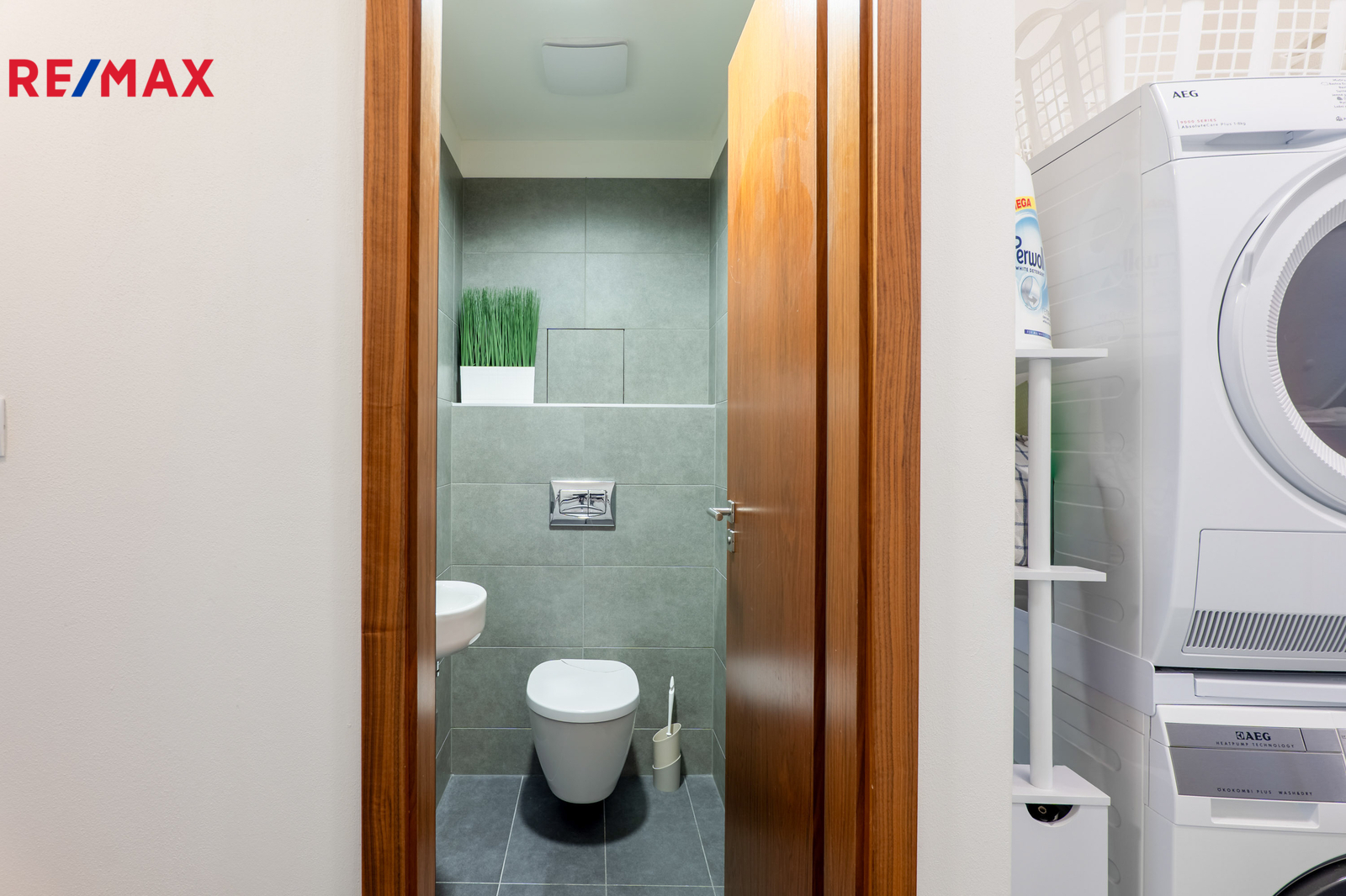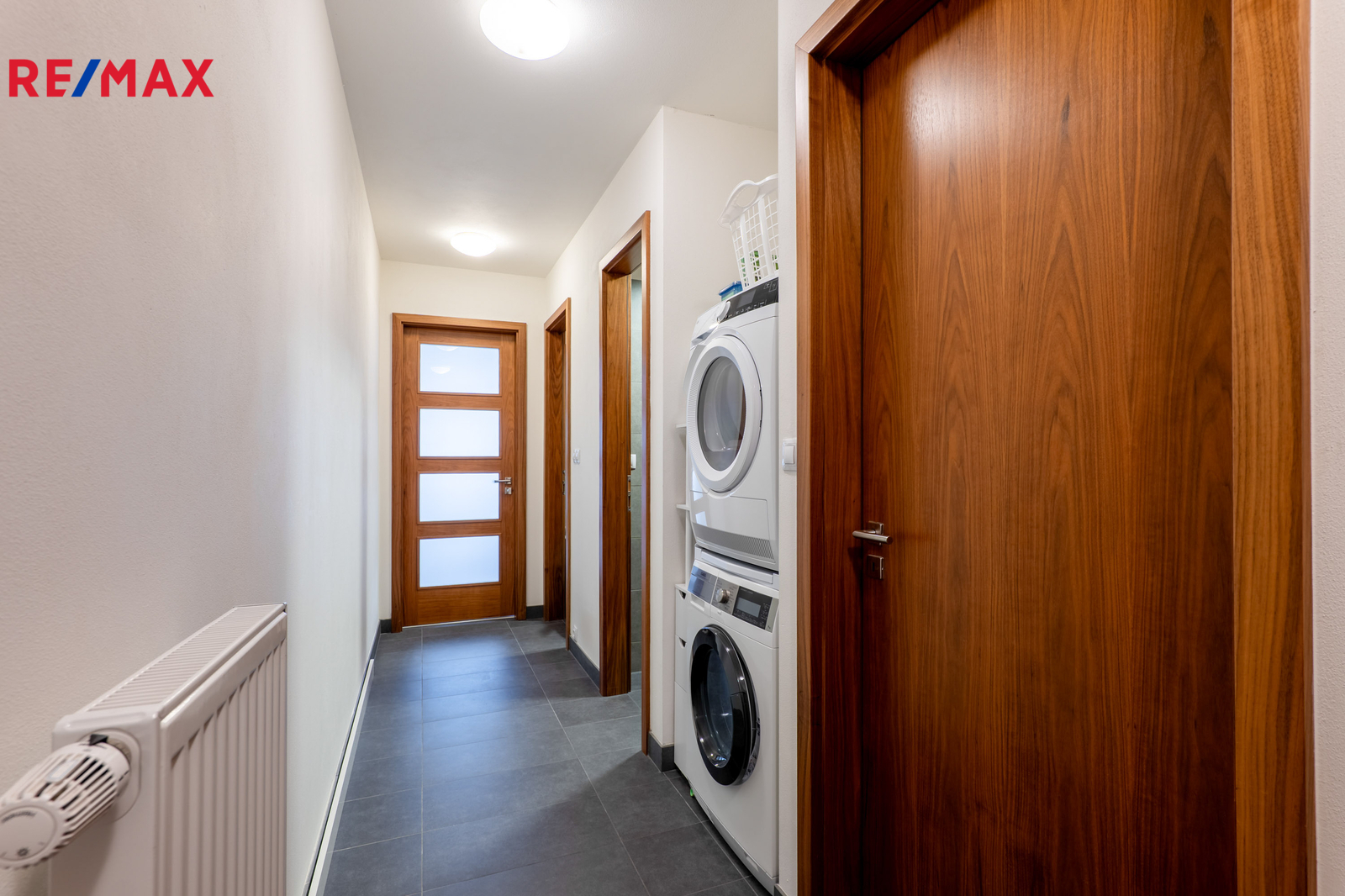 •	Prostorná předsíň s vestavěným botníkem a diskrétně umístěným prostorem pro pračku se sušičkou, zachovávajícím elegantní vzhled bytu