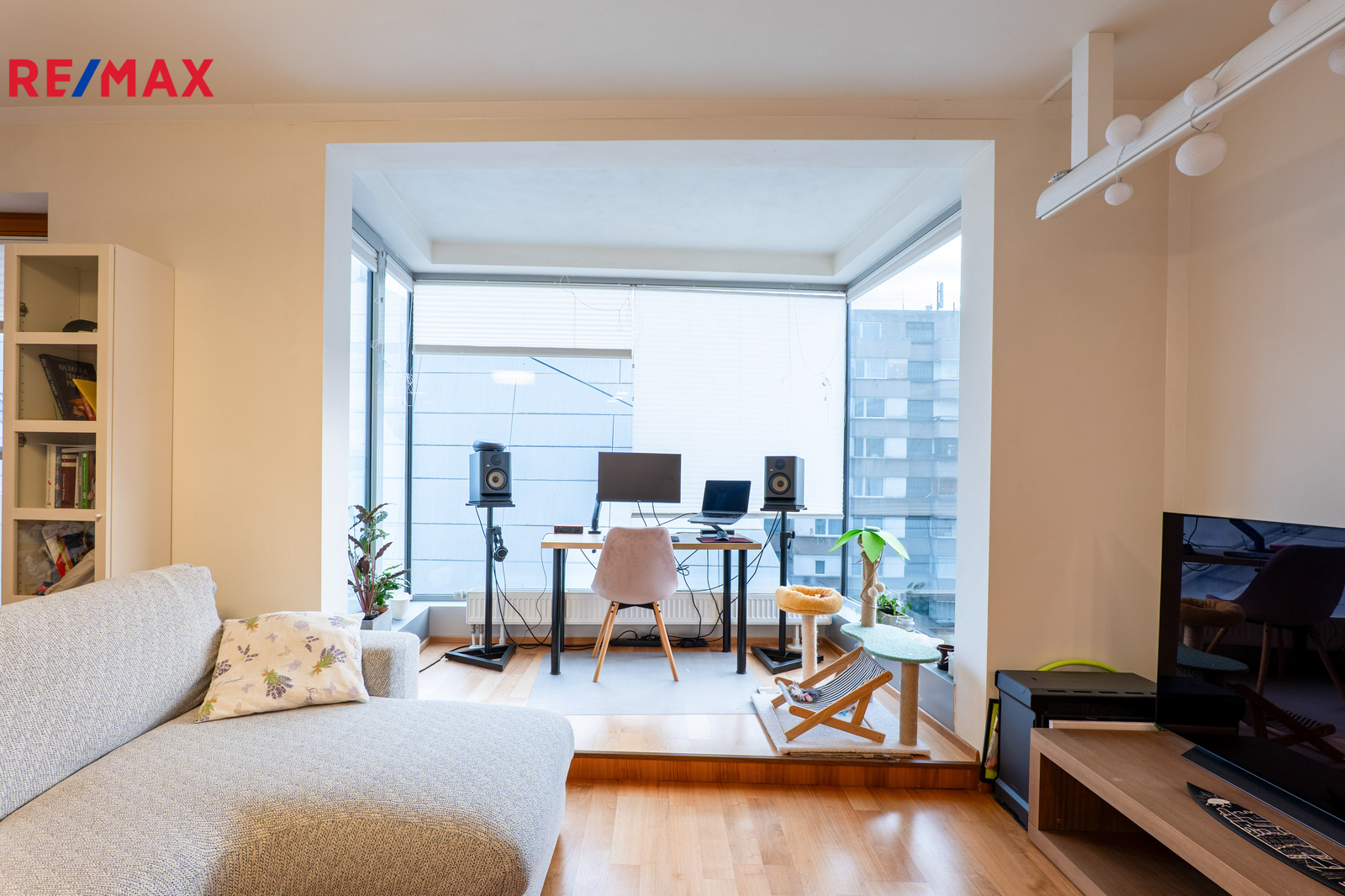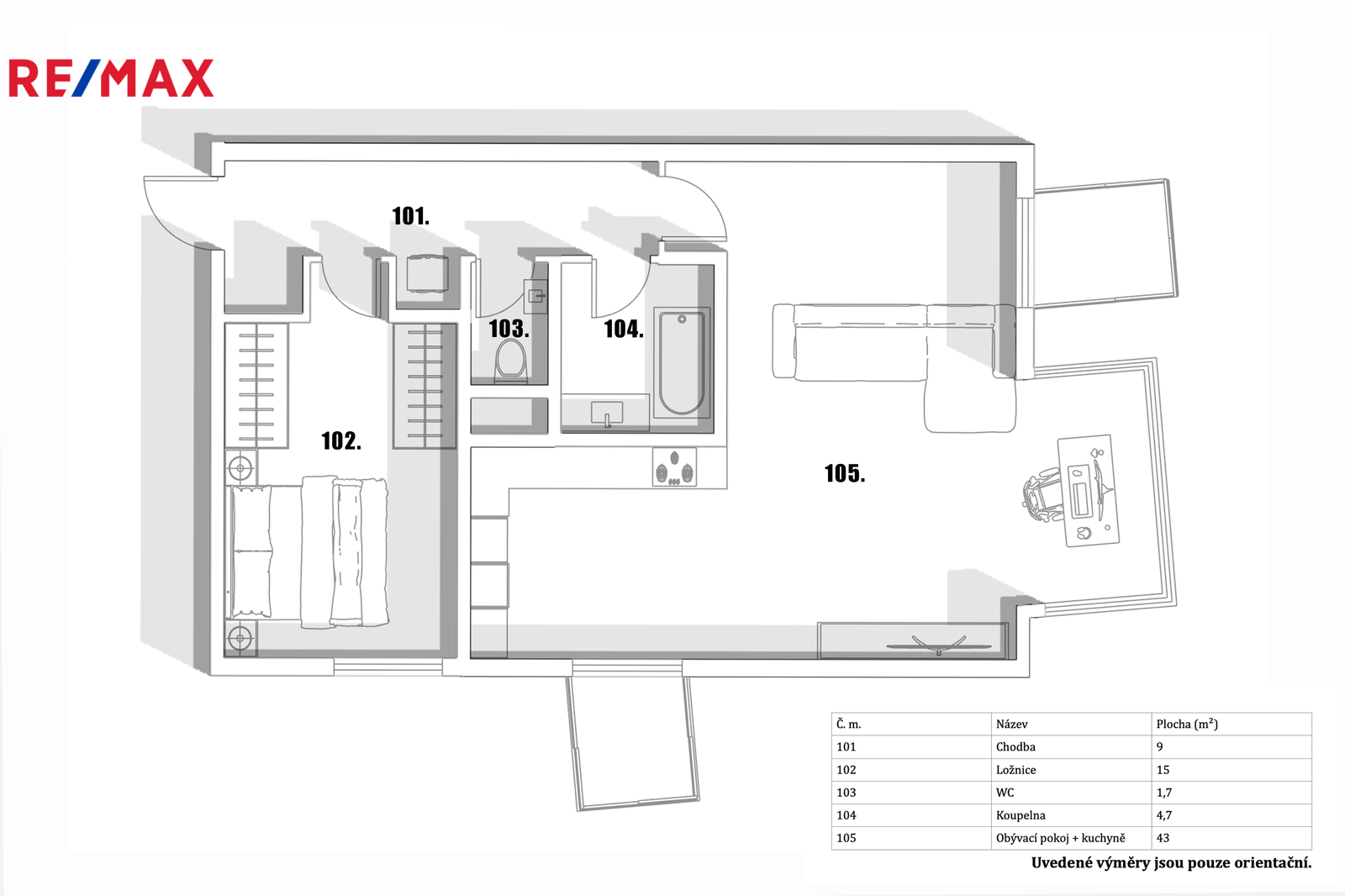 •	Prostorný obývací pokoj s kuchyňským koutem a vstupem na dva balkony (jih a západ) pro maximální denní světlo a relaxaci s výhledem