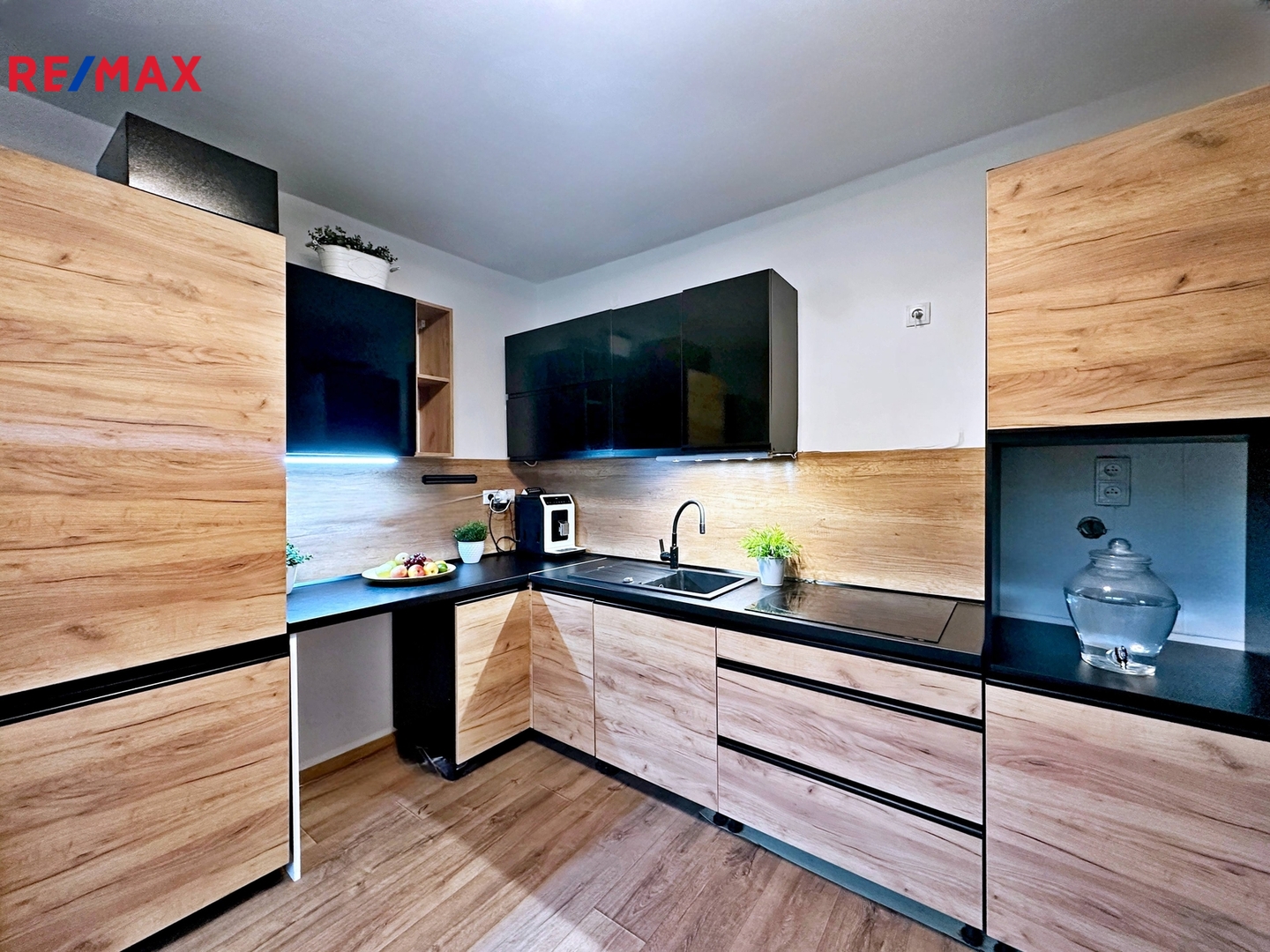 Nově zrekonstruovanou moderní kuchyni (10,20 m²) s elegantní kuchyňskou linkou a vestavěnými spotřebiči, s přímým vstupem na slunnou lodžii (4,62 m²).