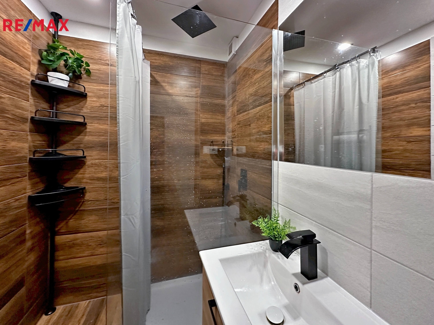 Stylovou nově zrekonstruovanou koupelnu (3,02 m²) se sprchovým koutem a samostatné WC (0,96 m²).