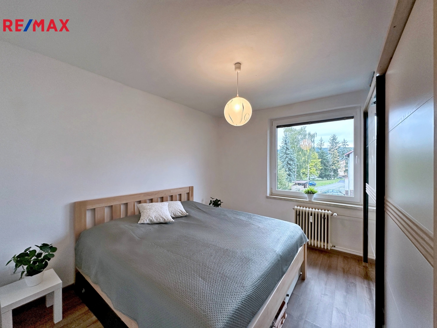 Prostornou ložnici (12,07 m²) s příjemnou atmosférou pro odpočinek.