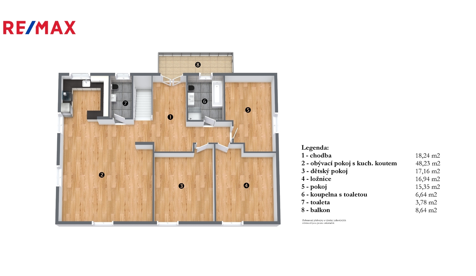 - koupelna s vanou, sprchovým koutem a WC a jedno samostatné WC