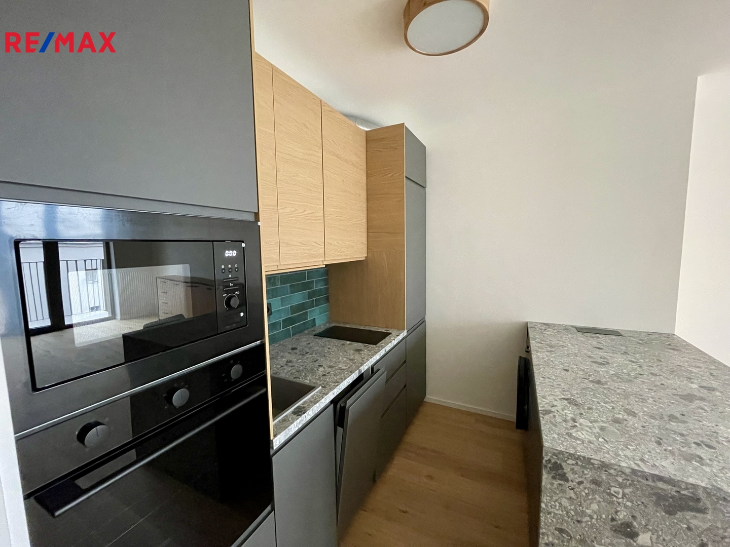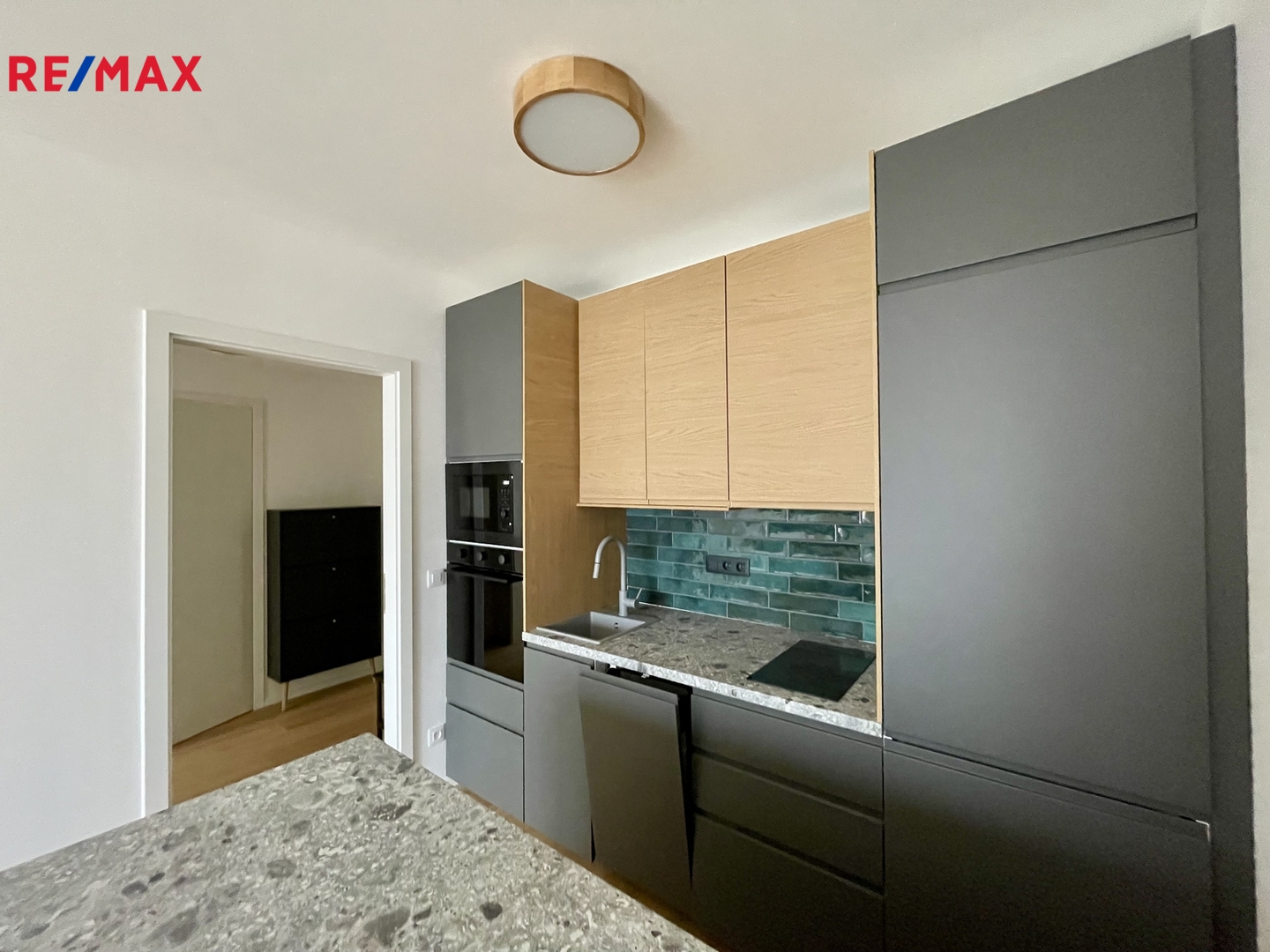 Součástí bytu je moderní kuchyňská linka se všemi vestavěnými spotřebiči – lednicí, troubou, mikrovlnkou, indukční varnou deskou, digestoří, myčkou i pračkou. Interiér je částečně vybavený a působí útulně a svěže.