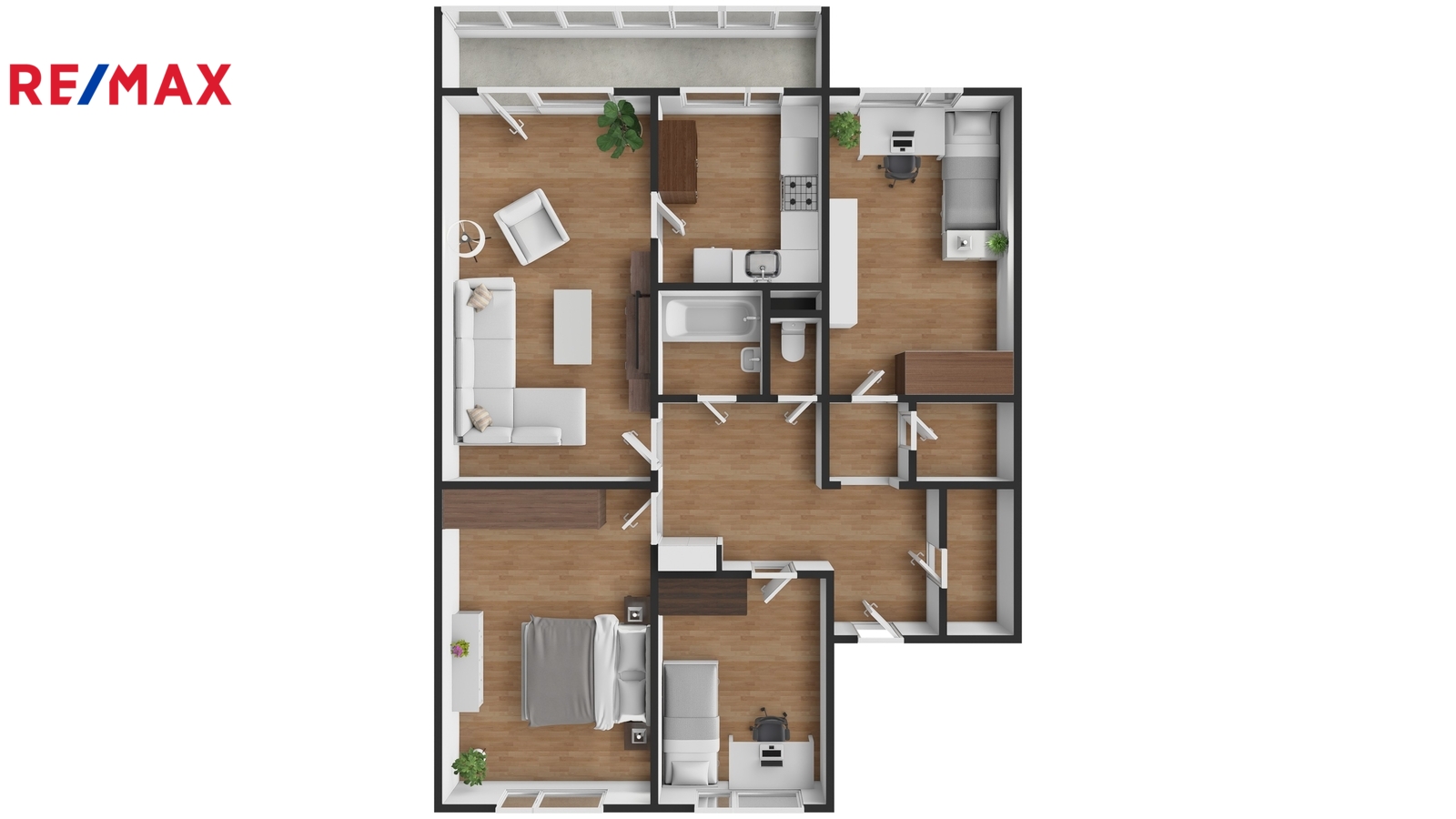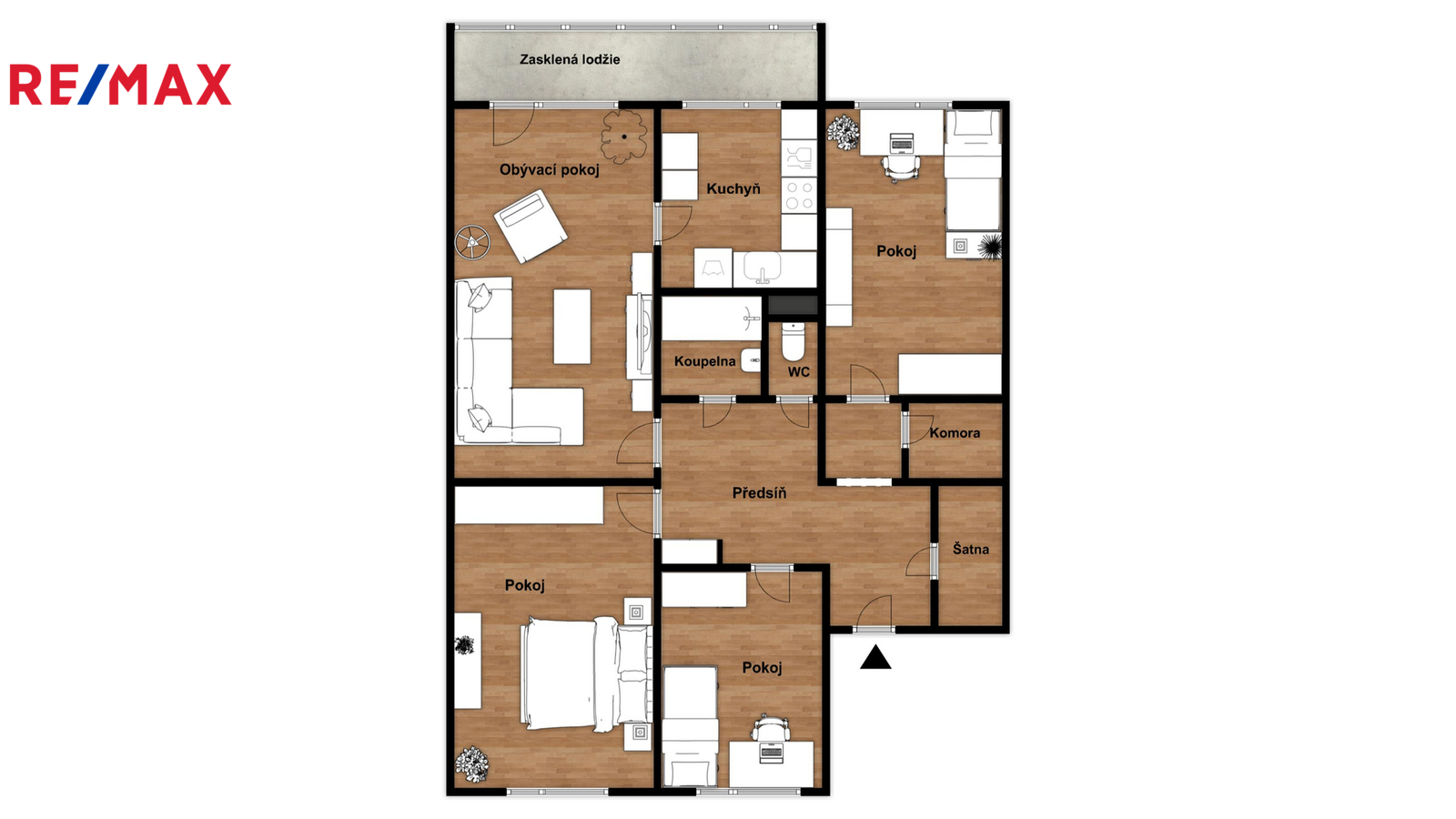 Centrem bytu je prostorná centrální chodba, odkud je samostatný vstup do všech pokojů. Hned u vchodu jsou 2 komory, využitelné jako šatna nebo pro uložení všeho potřebného. Dalčí úložné prostory jsou ve sklepě.