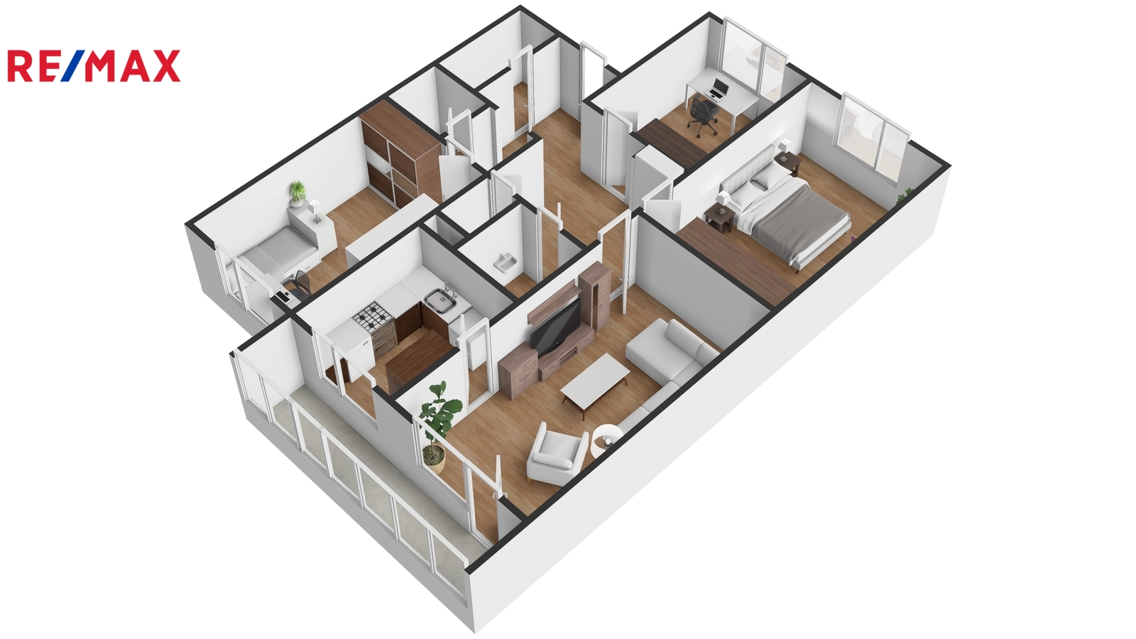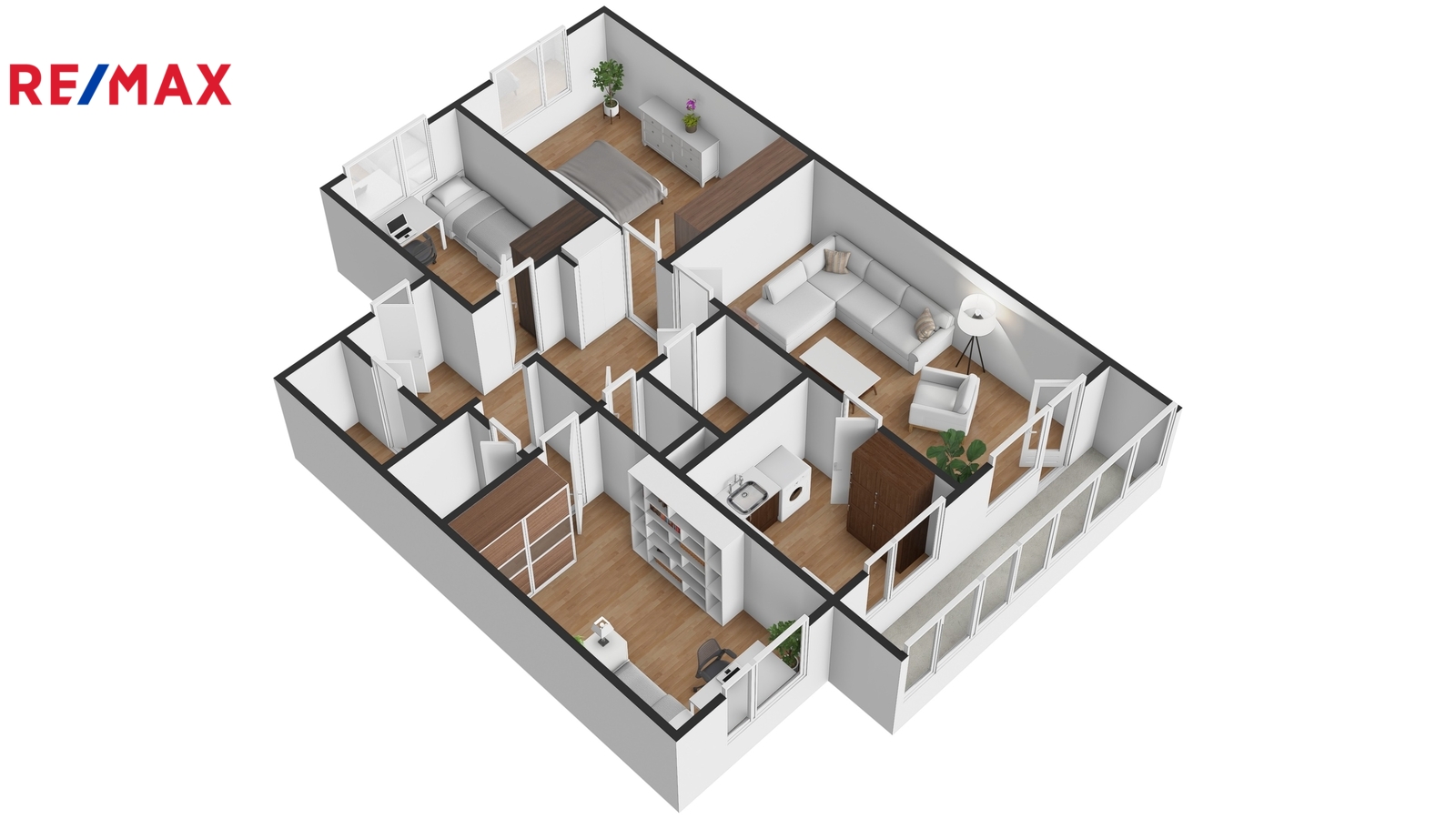 Velká, kompletně prosklená lodžie o ploše více jak 6 m² propojuje obývací pokoj a kuchyni a je orientována na západ, s možností posezení na odpoledním sluníčku. Okna z ložnice a dětského pokoje jsou situována do parku, což přispívá k příjemnému bydlení.