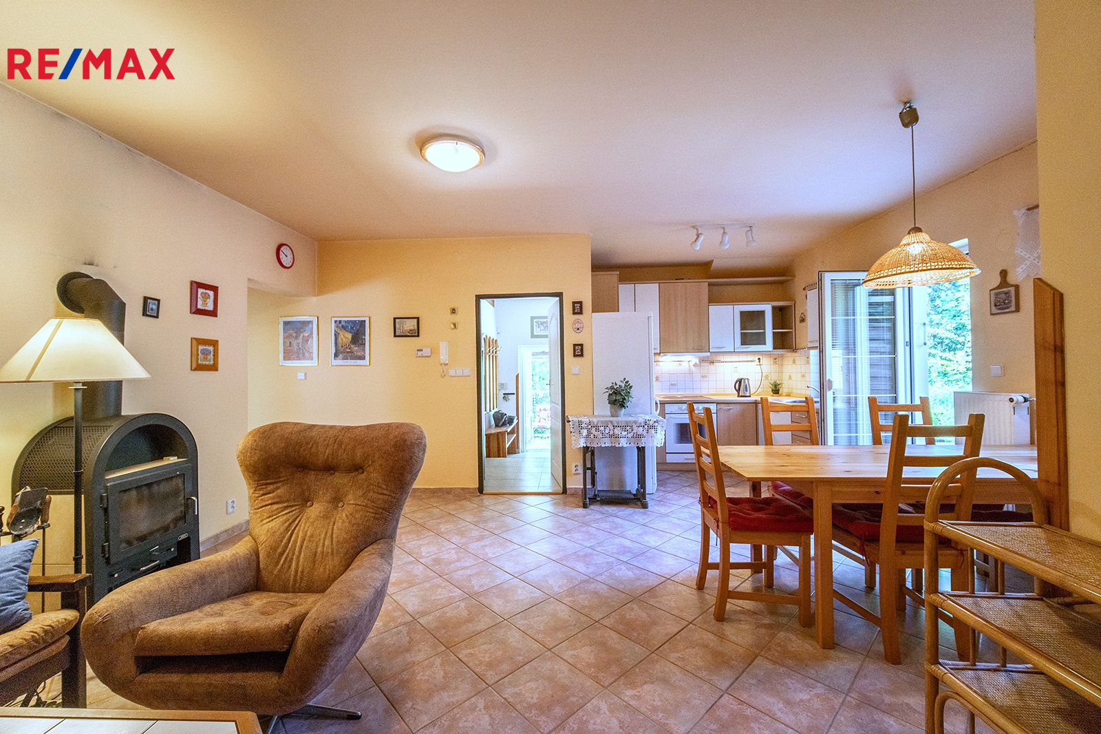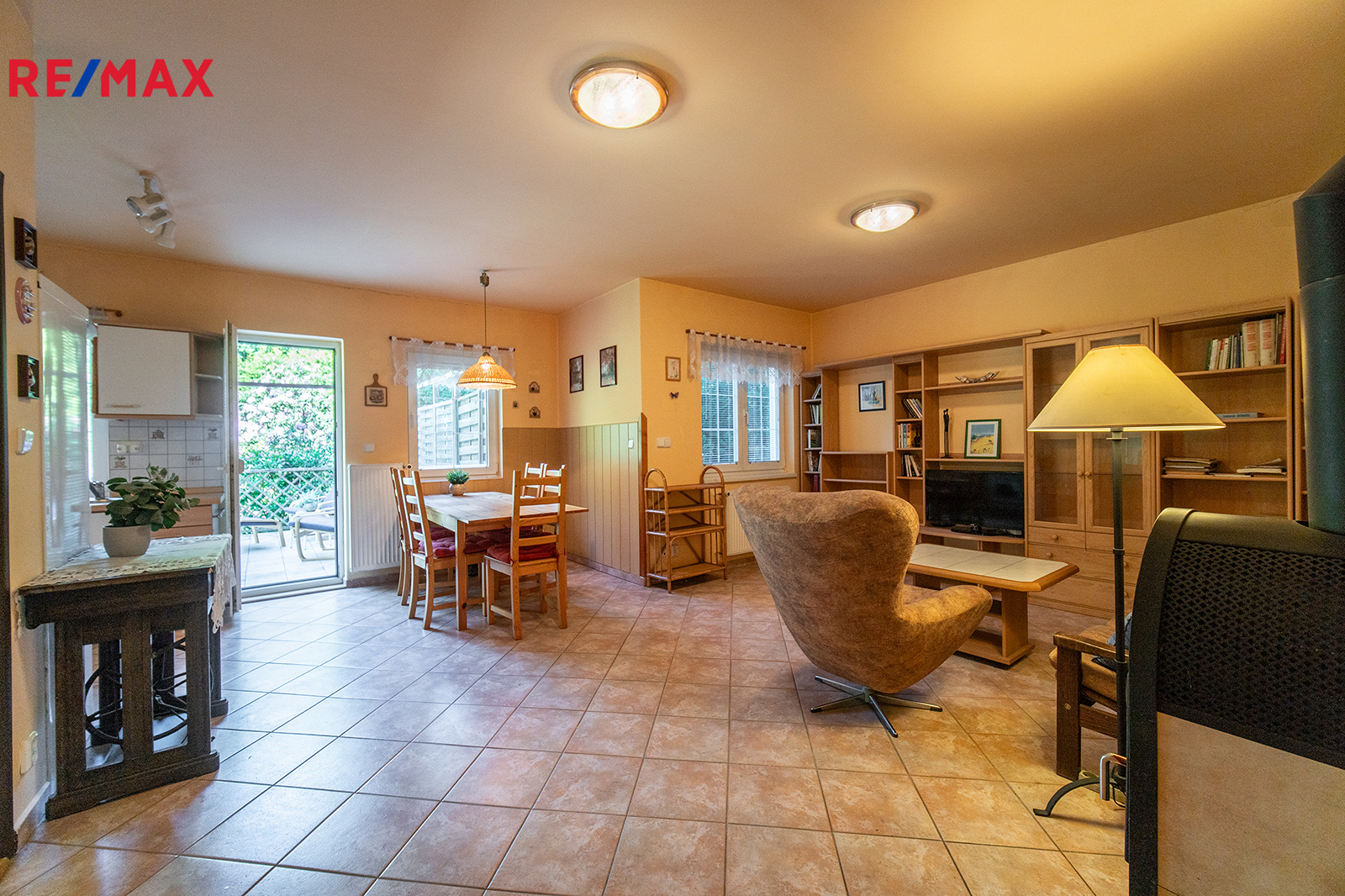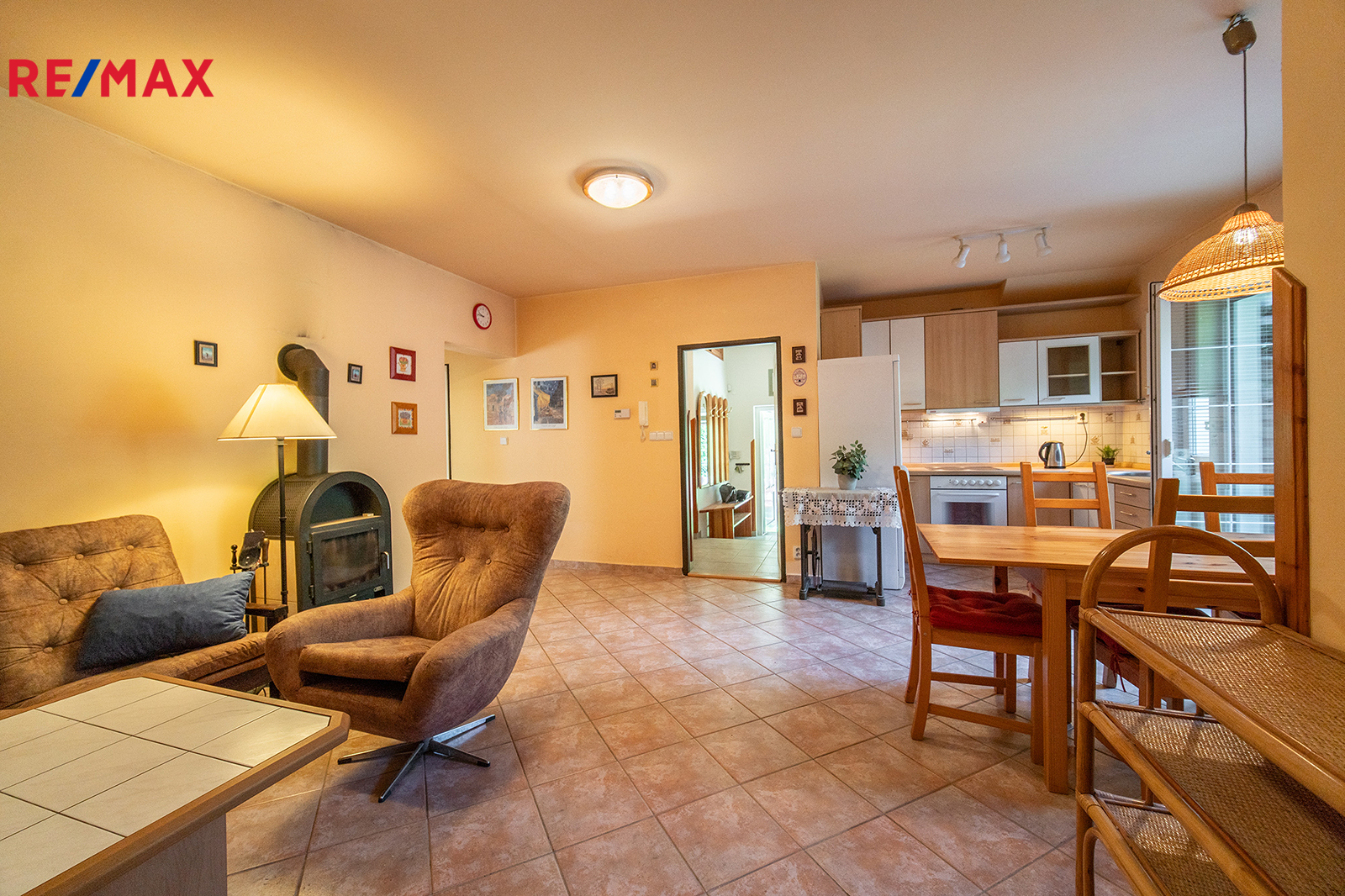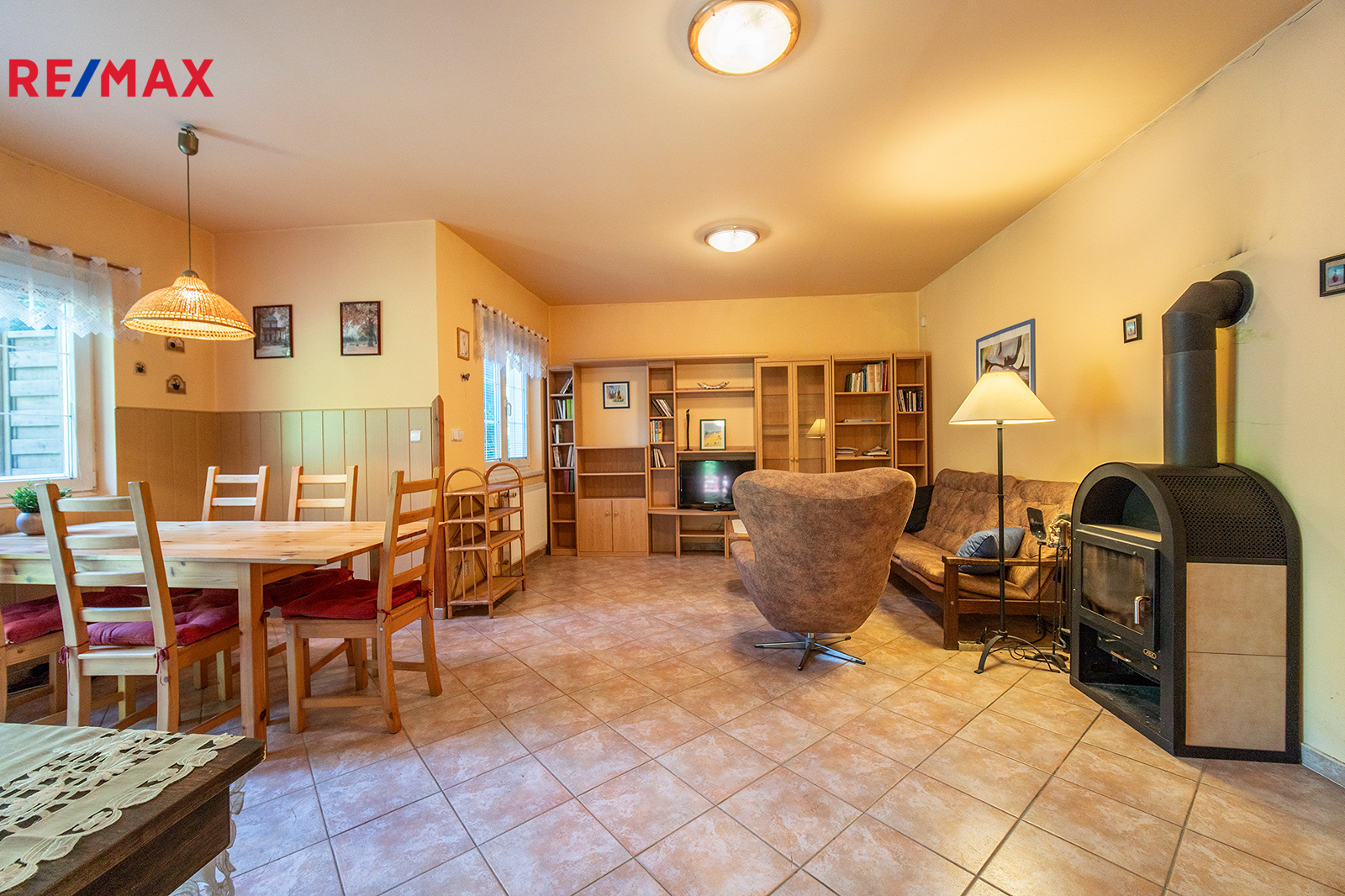 A čím Vás dům rozhodně zaujme? Srdce domu tvoří prostorný obývací pokoj s kuchyní, kde můžete trávit pohodově společný čas s rodinou u plápolajícího ohně v krbových kamnech. Nebo v létě vyjít z obývacího pokoje na venkovní terasu, která nabízí příjemné posezení na večerním slunci.