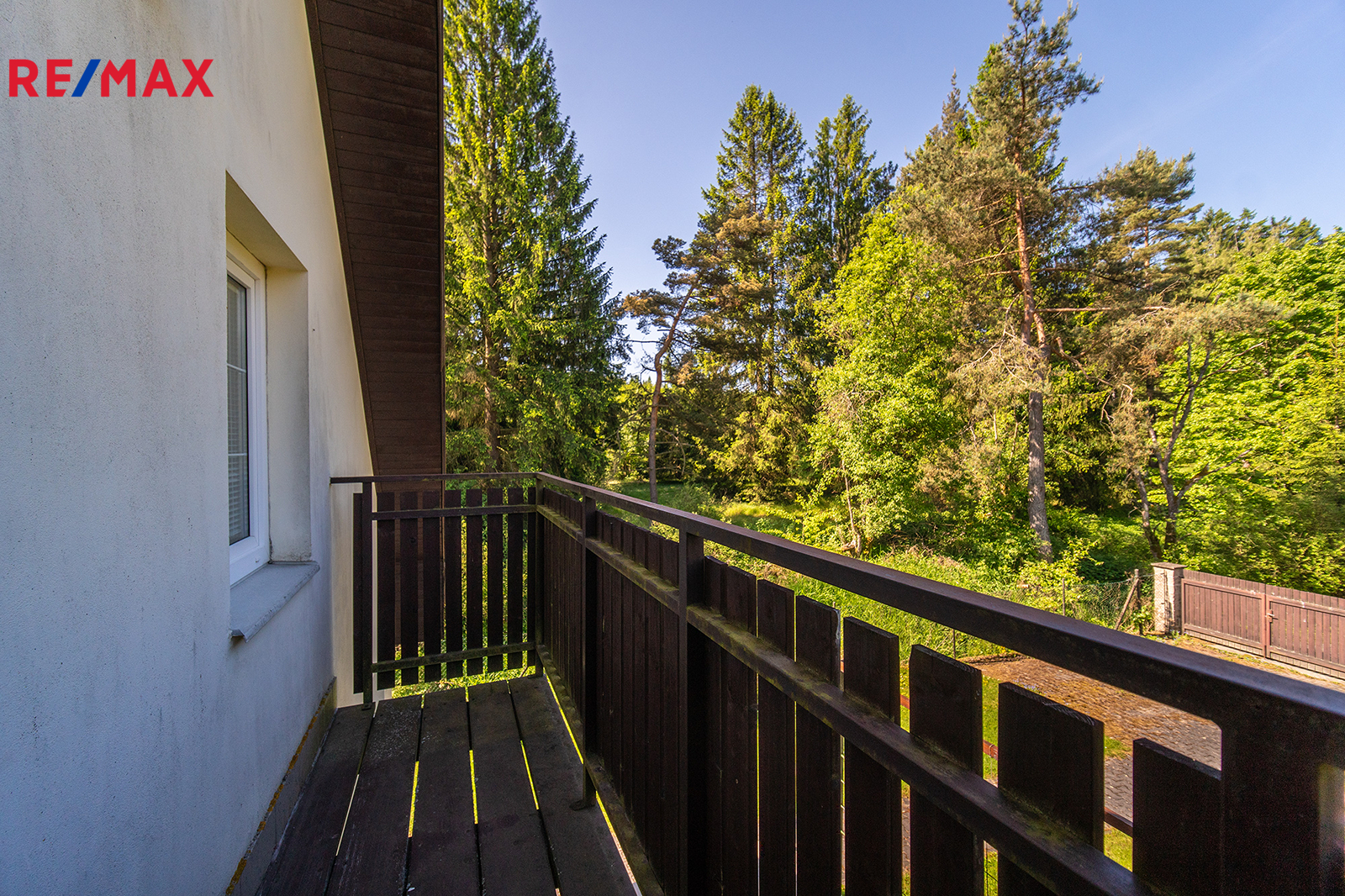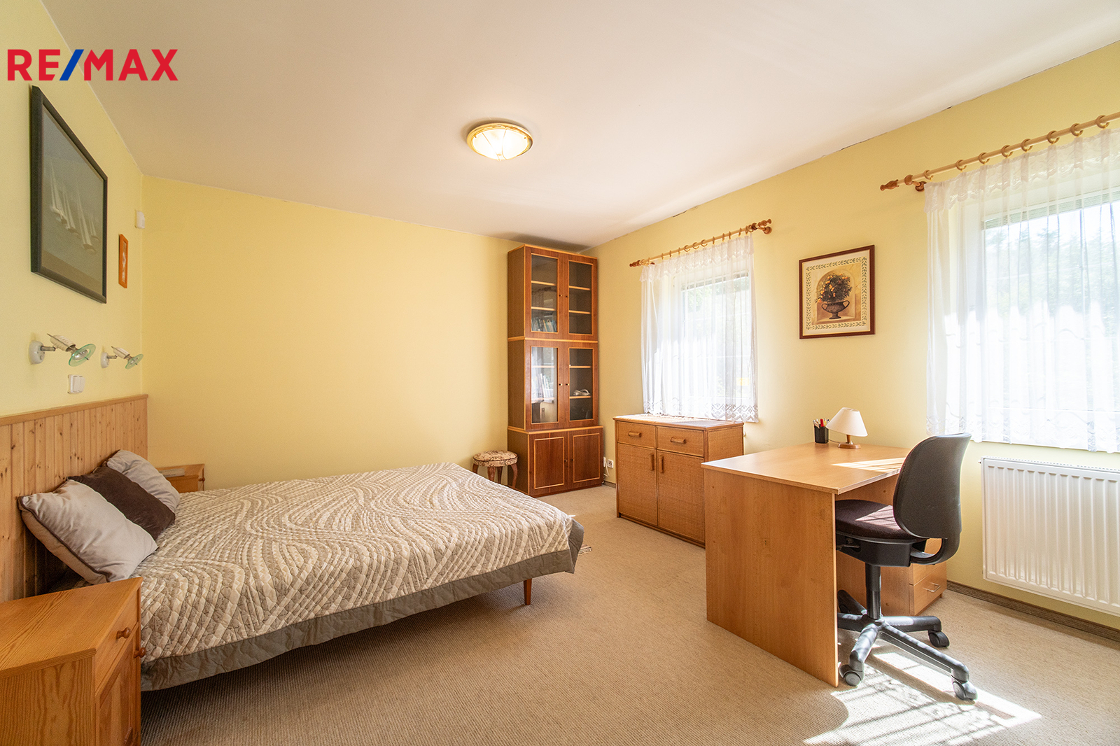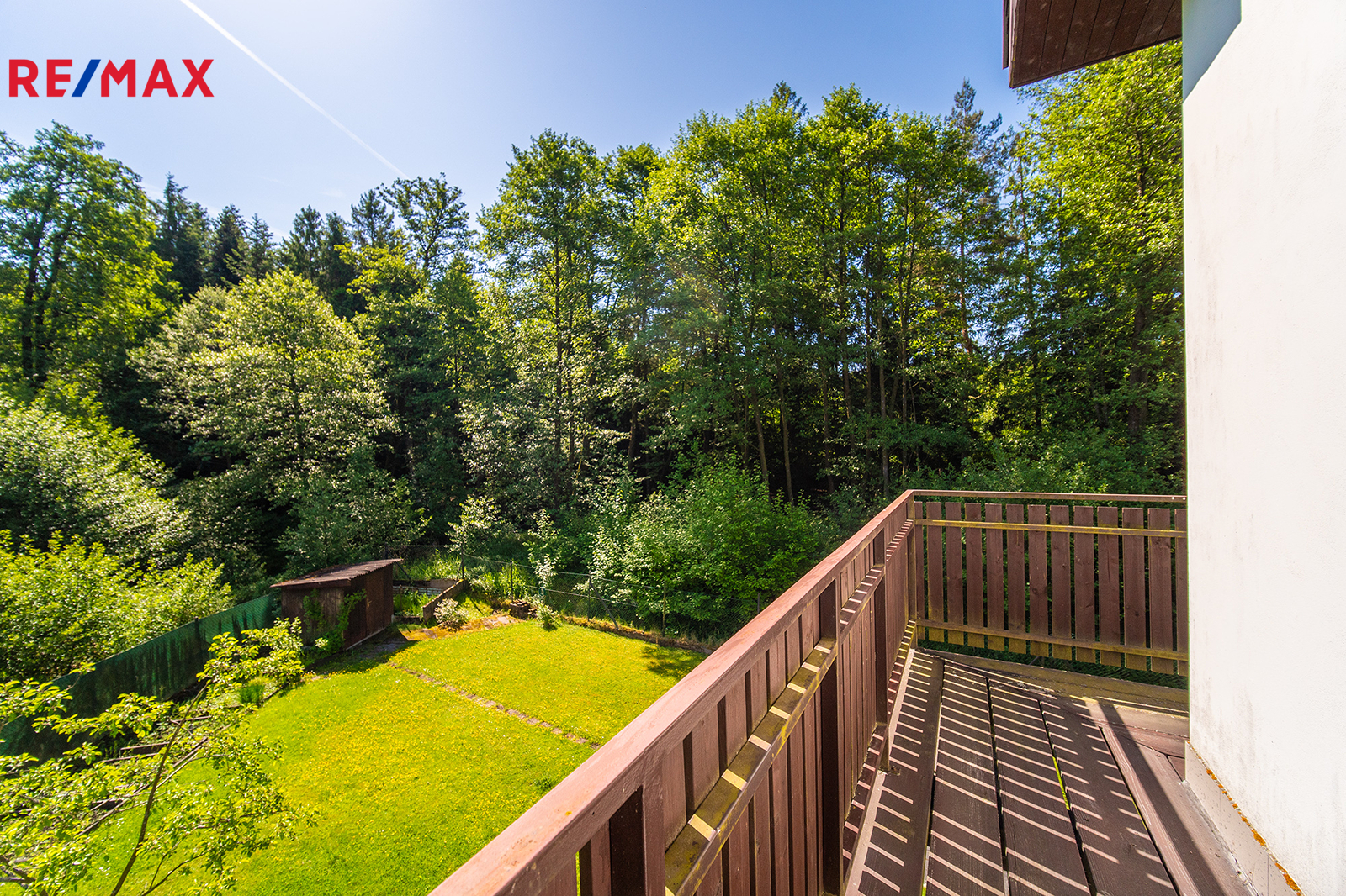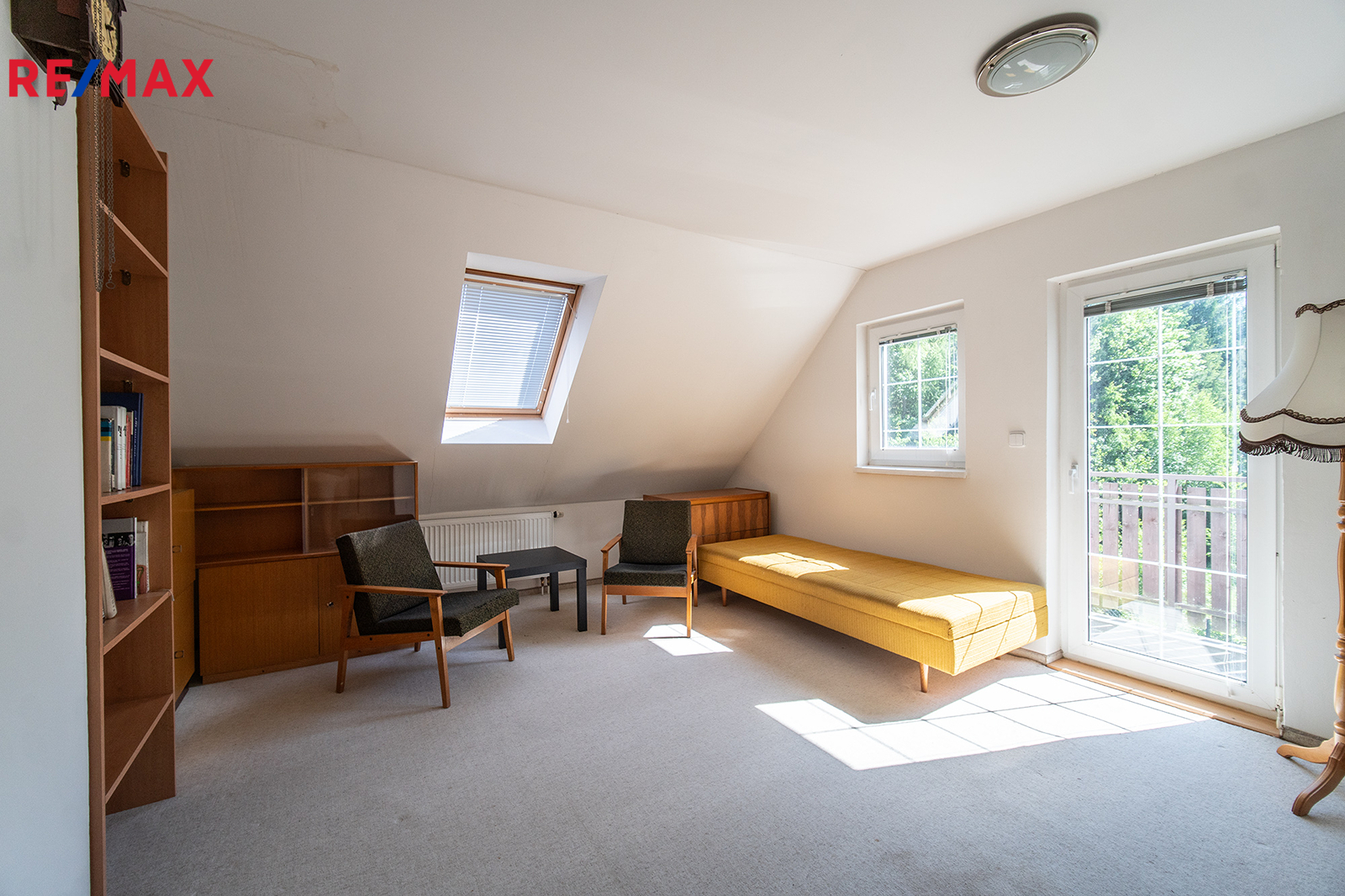 V přízemí se pak nachází další pokoj (ložnice/pracovna), koupelna, toaleta a praktická spíž. V 1.patře najdete další dva pokoje s toaletou a koupelnou. Z obou pokojů v 1.patře se dá vyjít na balkóny s výhledem do zahrady a okolní přírody. K dispozici je ještě velká půda využitelná jako úložný prostor a nebo se nabízí po úpravě možné využití jako další obytný prostor. Dům je částečně podsklepen a sklep se dá využít pro uskladnění ovoce a zeleniny.