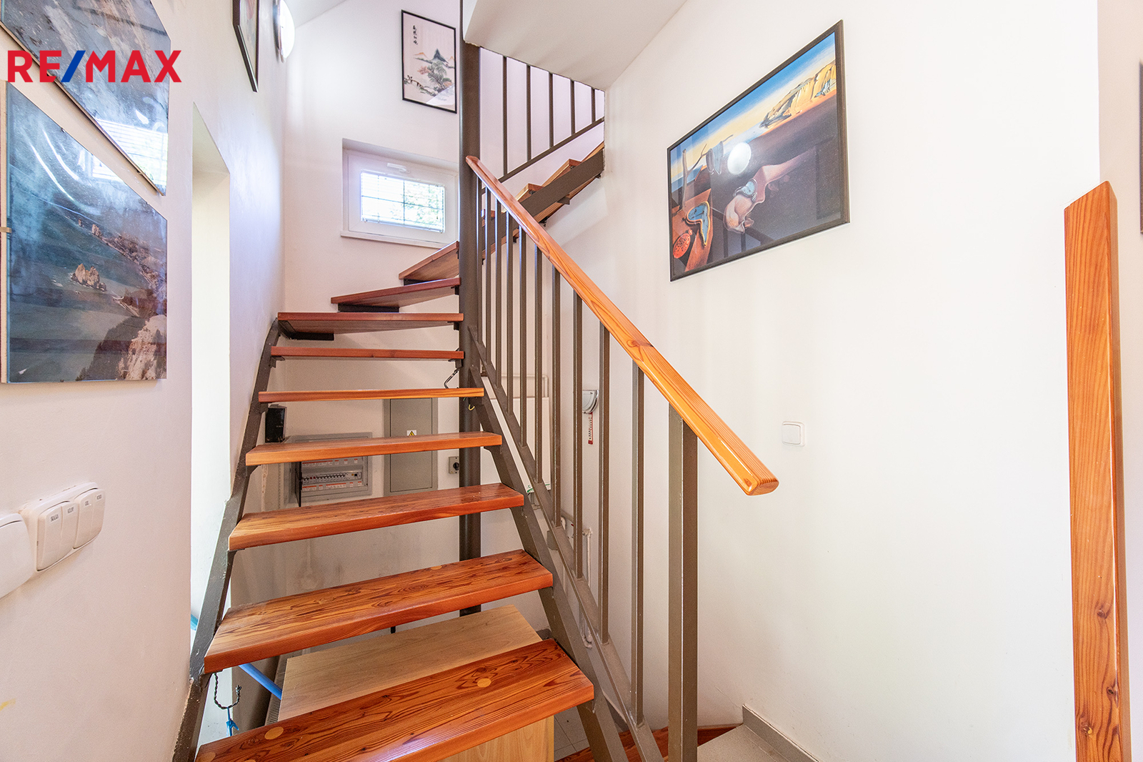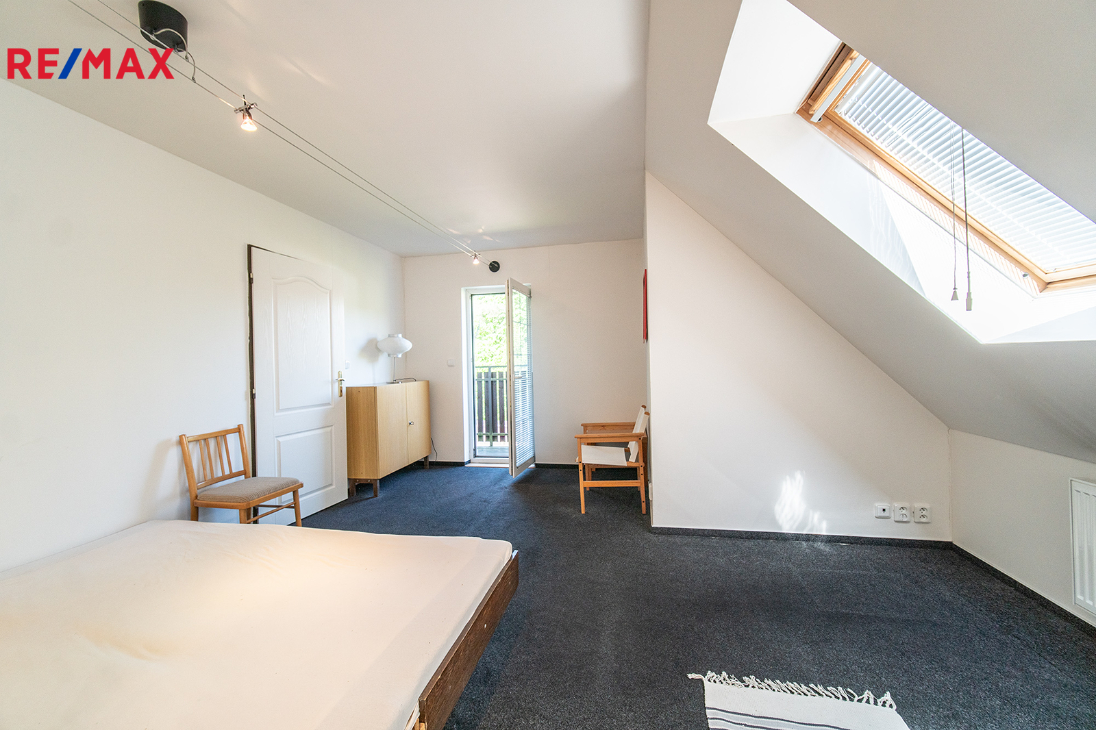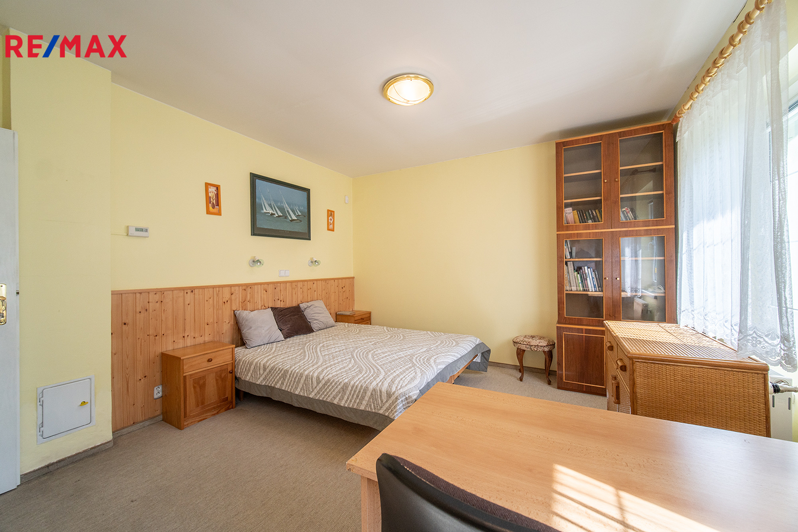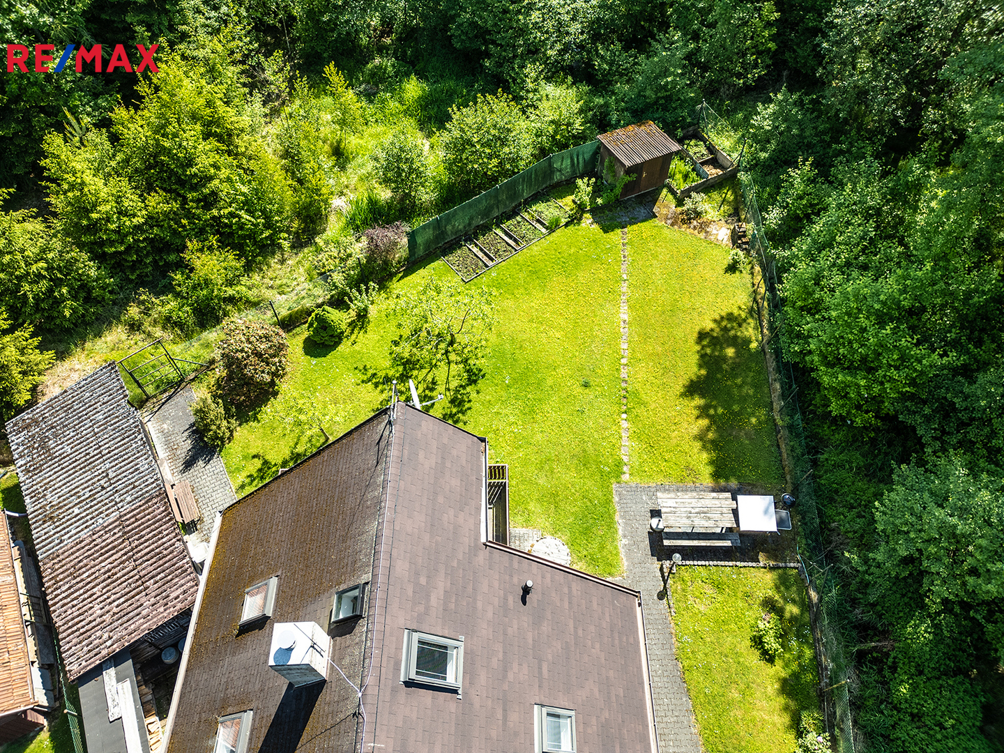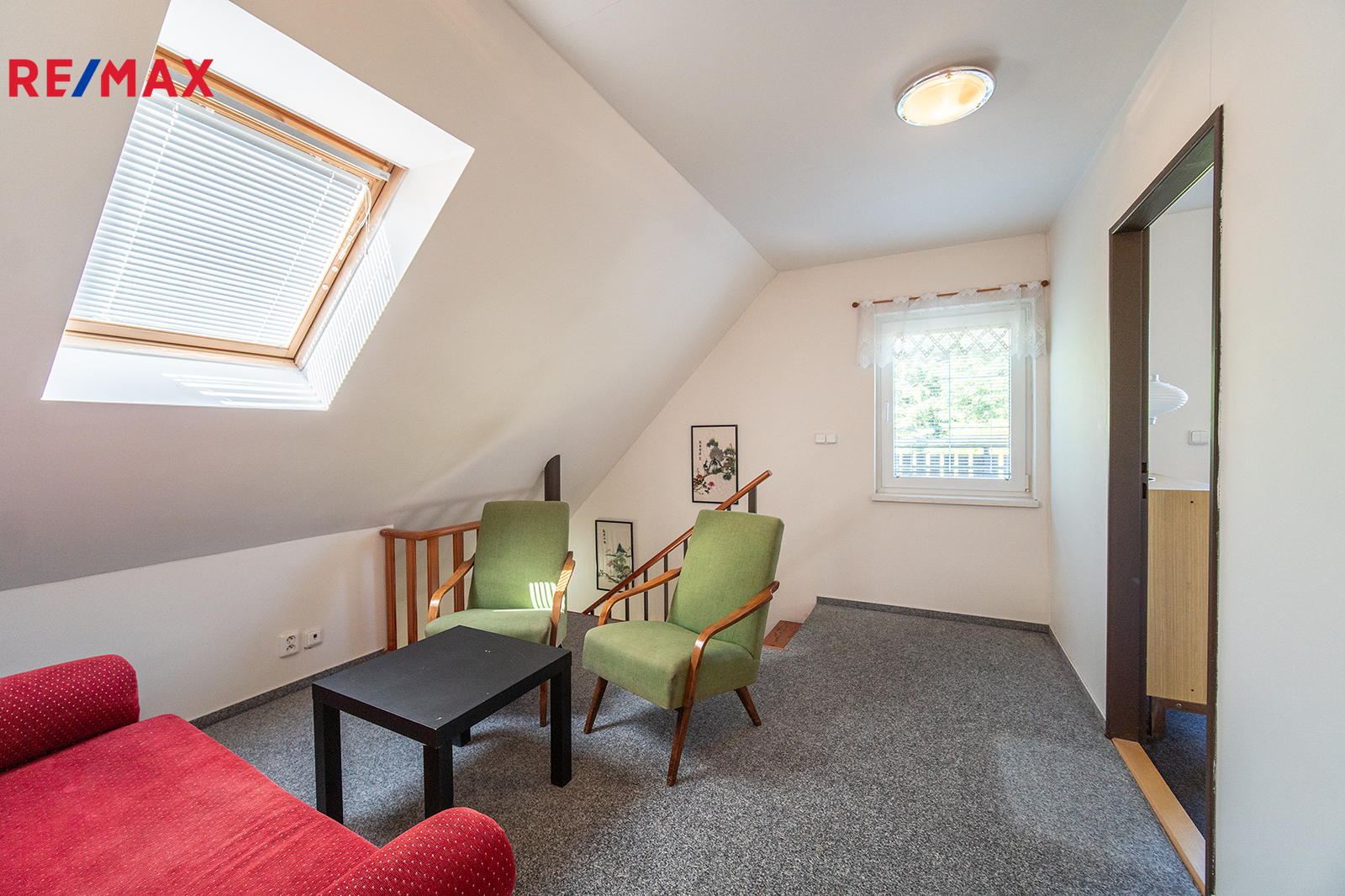 V přízemí se pak nachází další pokoj (ložnice/pracovna), koupelna, toaleta a praktická spíž. V 1.patře najdete další dva pokoje s toaletou a koupelnou. Z obou pokojů v 1.patře se dá vyjít na balkóny s výhledem do zahrady a okolní přírody. K dispozici je ještě velká půda využitelná jako úložný prostor a nebo se nabízí po úpravě možné využití jako další obytný prostor. Dům je částečně podsklepen a sklep se dá využít pro uskladnění ovoce a zeleniny.