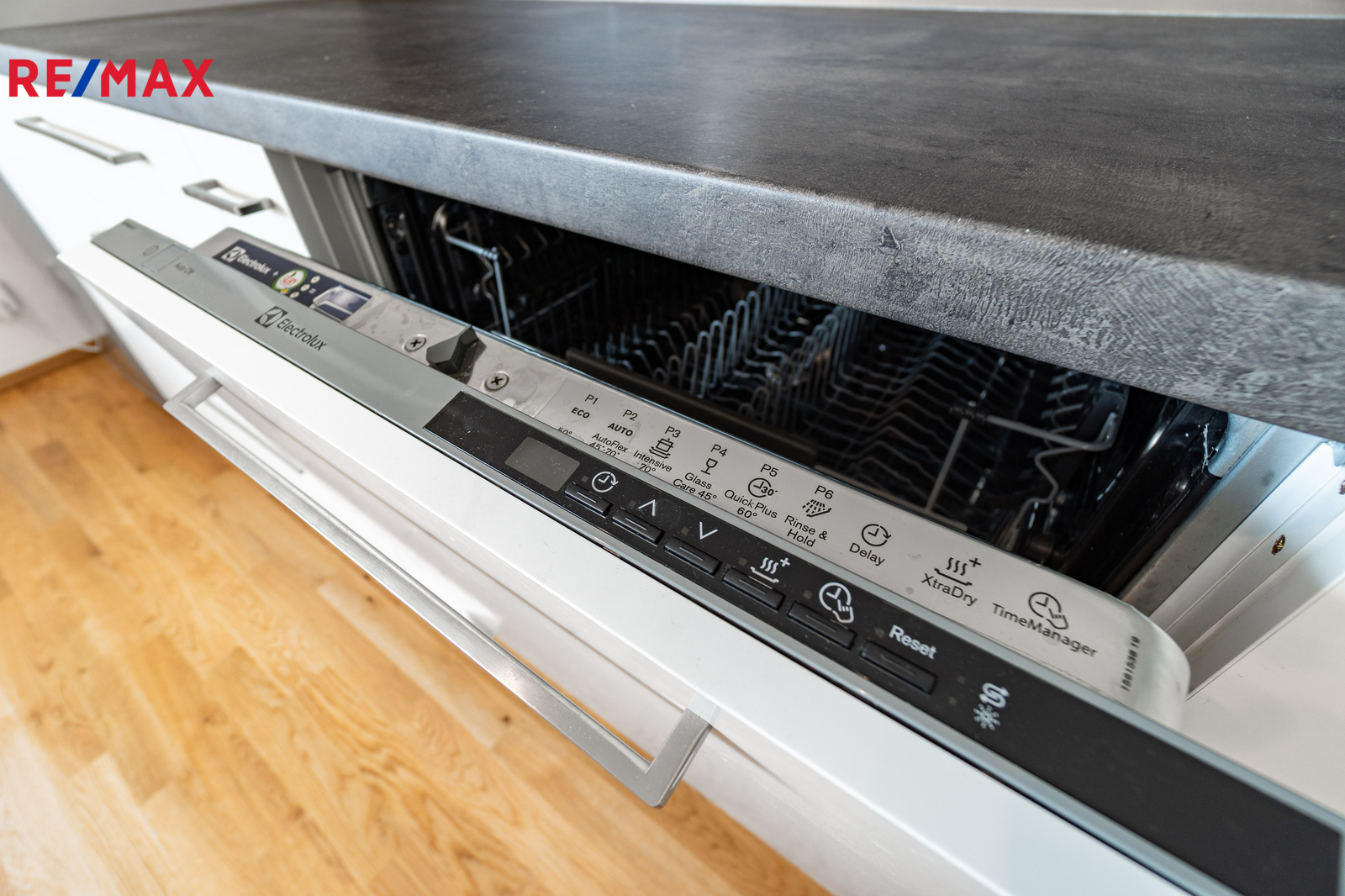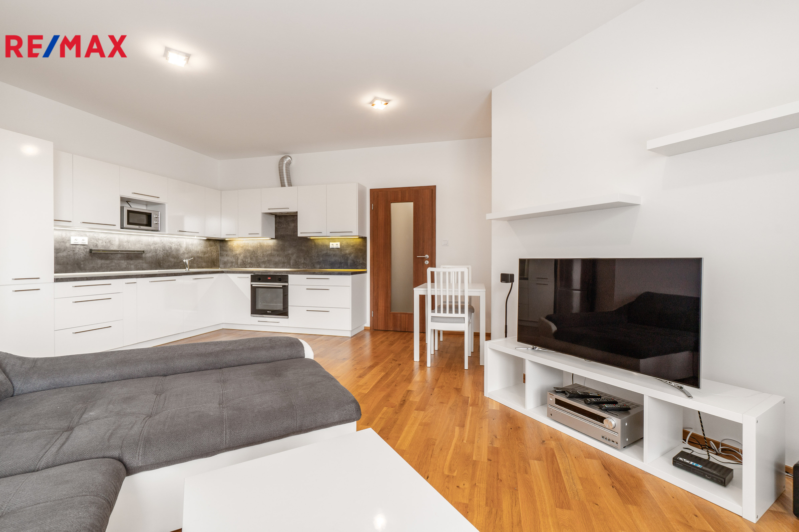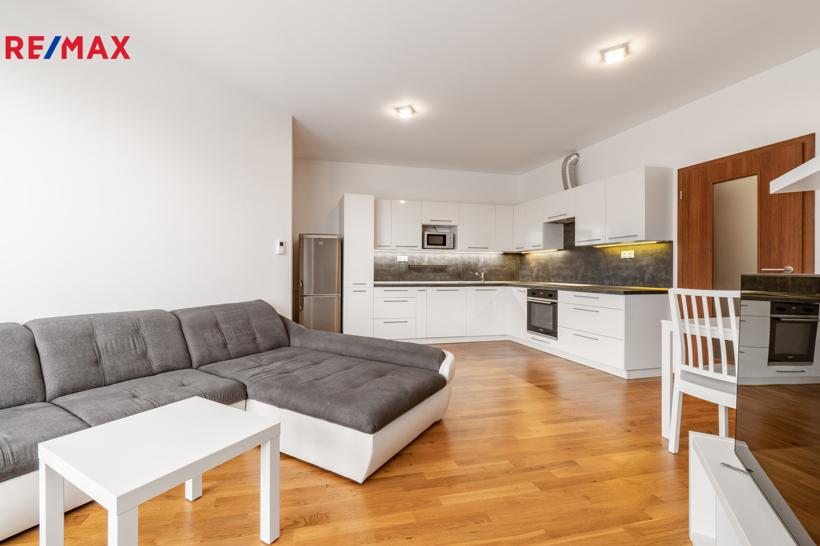• Obývací pokoj (23,79 m²) s vybaveným kuchyňským koutem včetně lednice a vestavěnými spotřebiči (velká myčka, kvalitní dřez, indukční varná deska, digestoř a elektrická trouba).