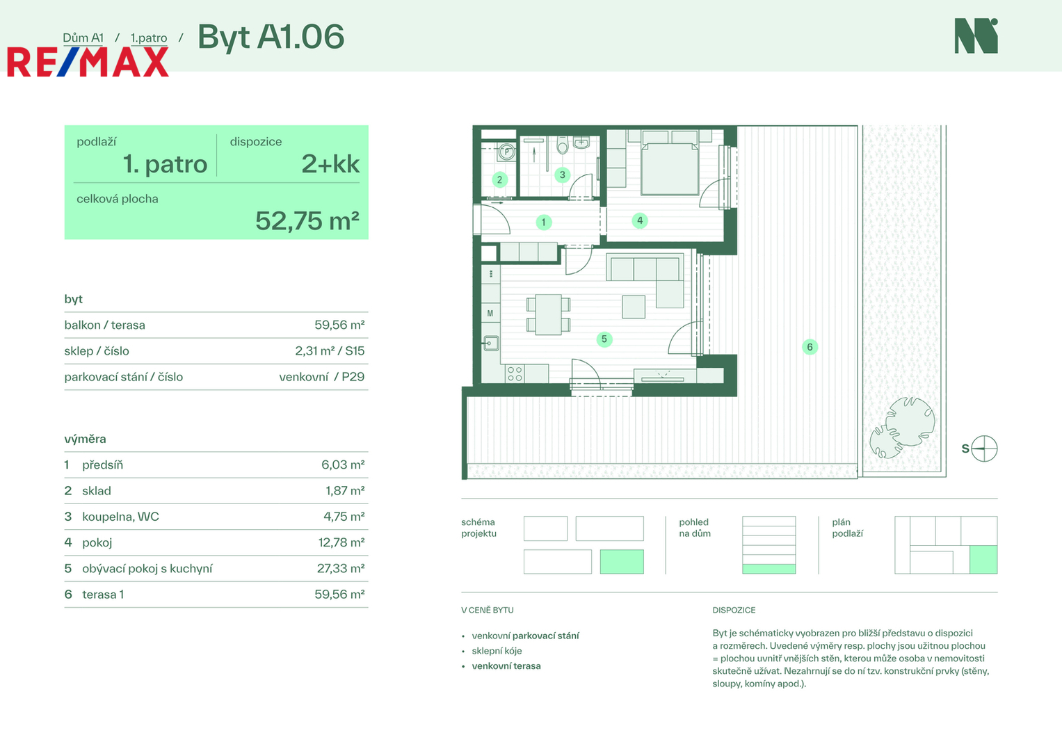 Nabízený byt A1.06 se nachází ve zvýšeném přízemí domu A1. Užitná plocha samotného bytu je 55,51 m2 plus 59,56 m2 terasy plus 2,31 m2 sklep. Slunná a prostorná terasa je orientována jihozápadním směrem. Součástí ceny je i vnější výhradní parkovací stání.