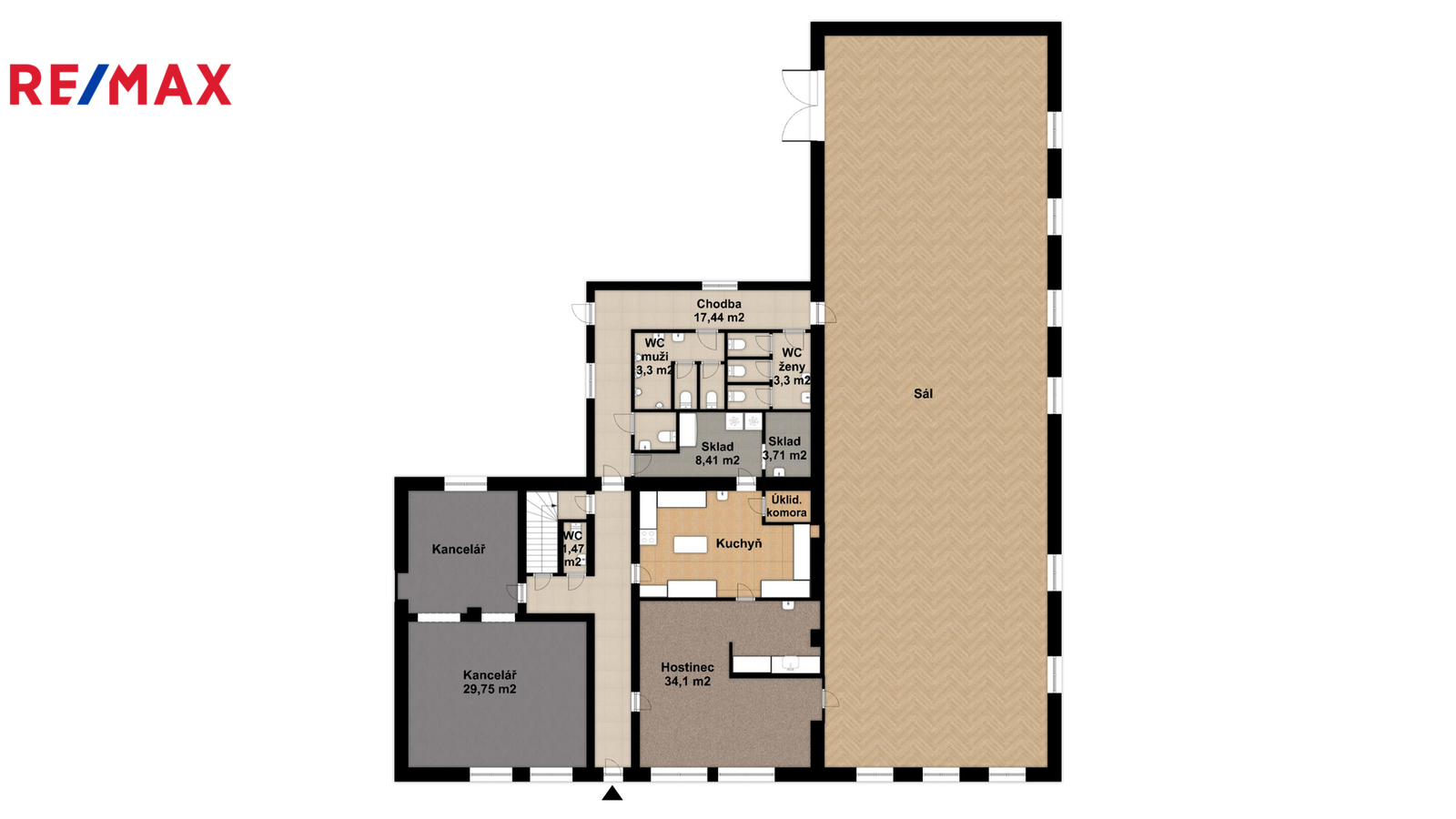 V přízemí se nachází provozní část hostince s barem, kuchyní, sklady a sociálním zázemím. Dále zde najdeme společenský sál vhodný pro pořádání akcí, školení či kulturních událostí.