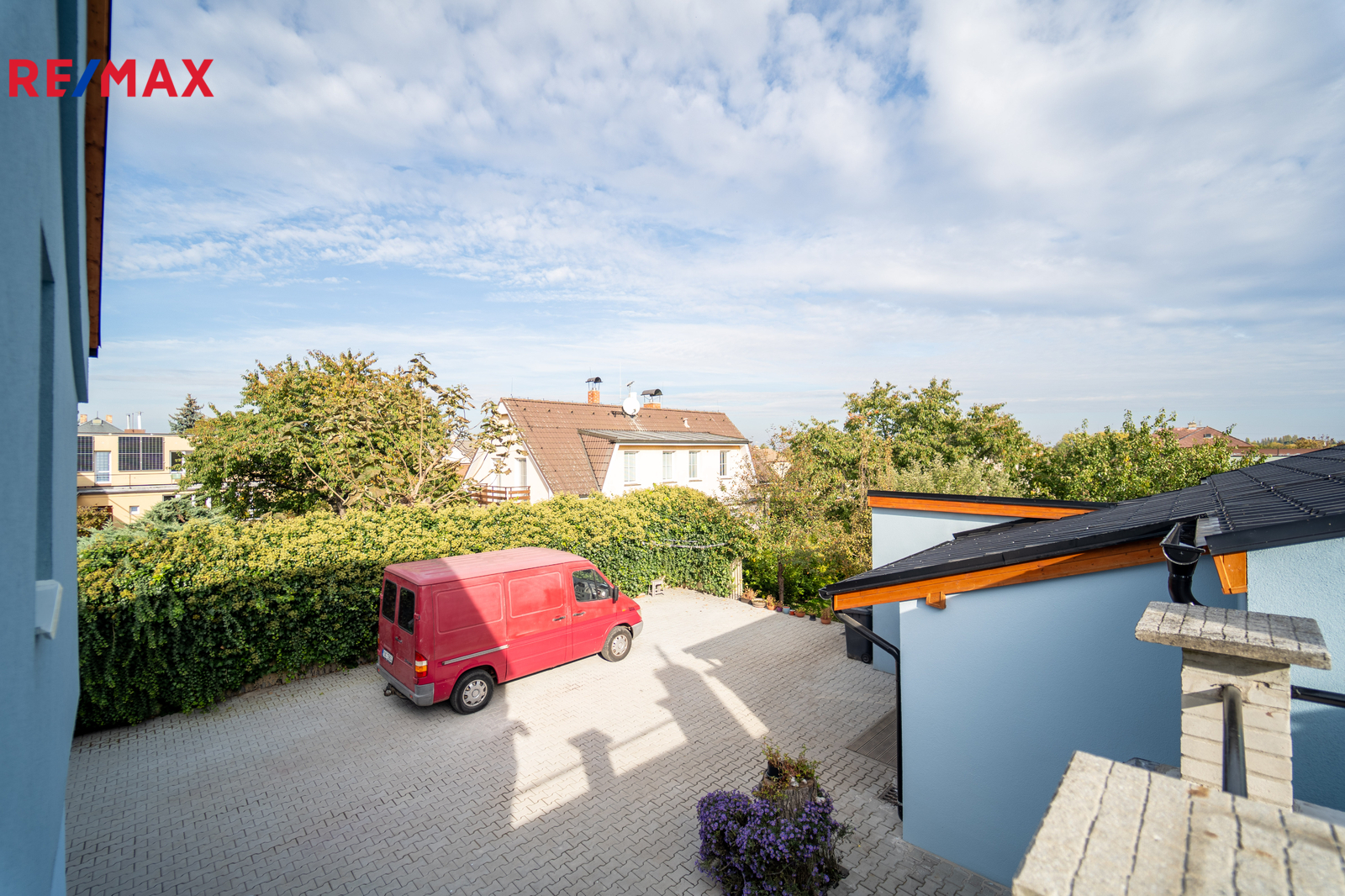 Zastavěná plocha a nádvoří domu o velikosti 358 m2 je osazeno zámkovou dlažbou a umožňuje vjezd na pozemek přímo z ulice Legionářů