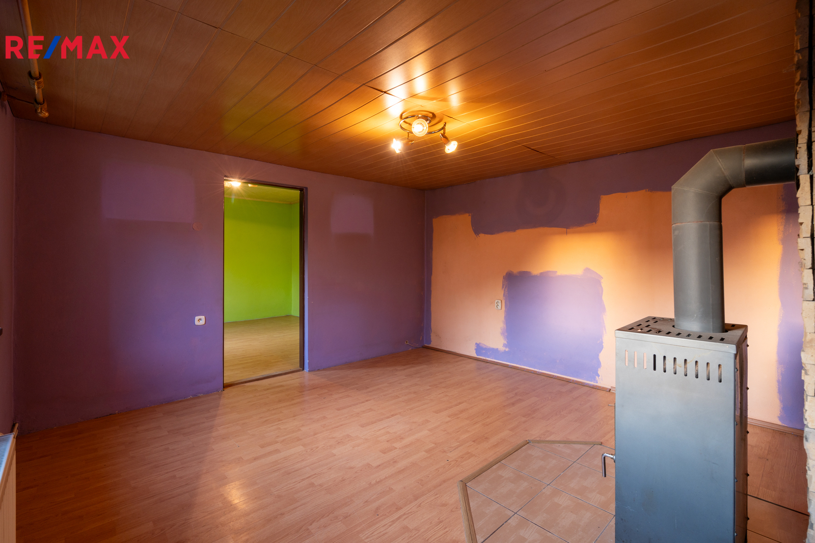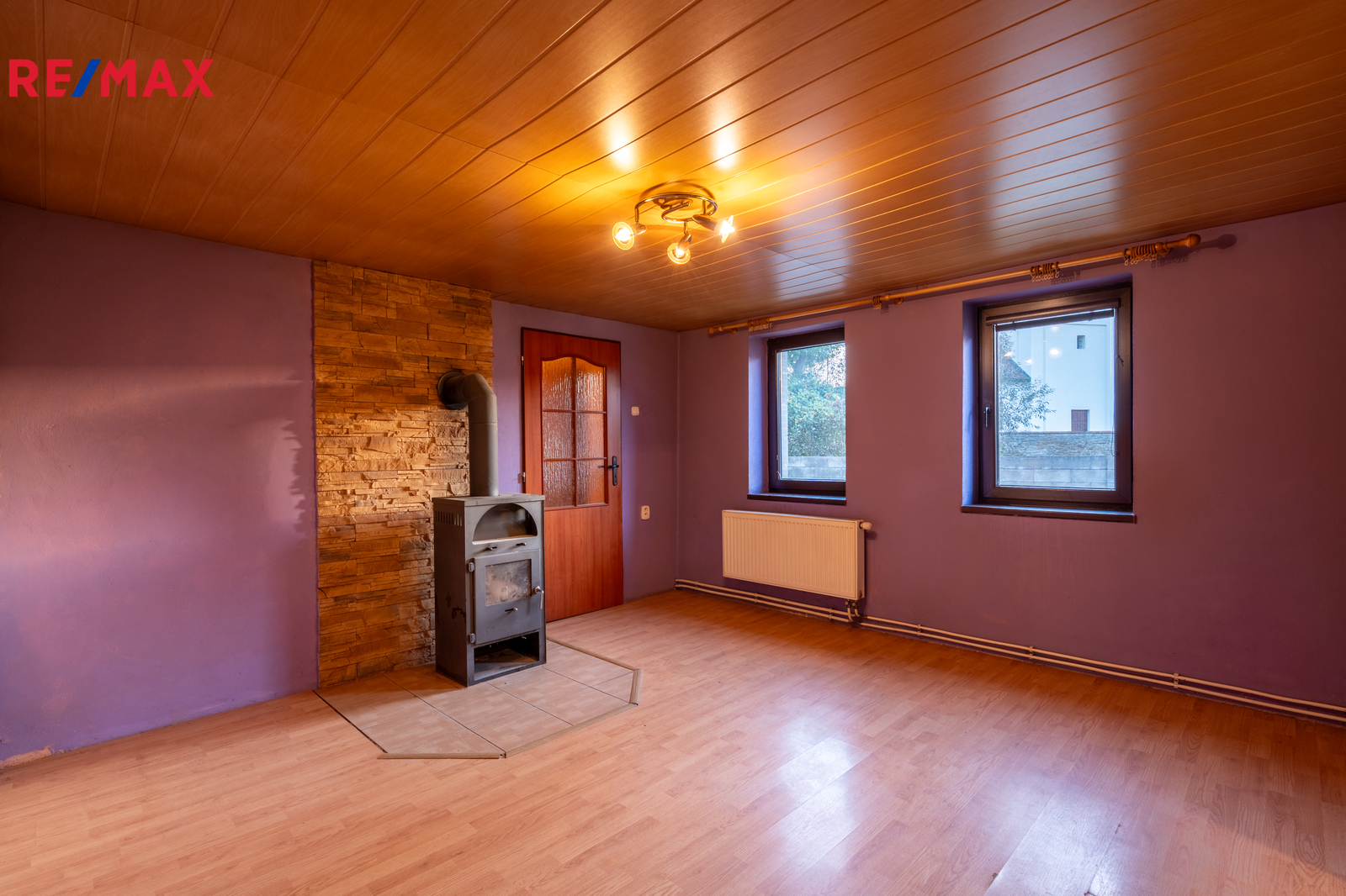 Dům je částečně vybavený – k dispozici je kuchyňská linka a krbová kamna, která dodávají interiéru útulnou atmosféru.