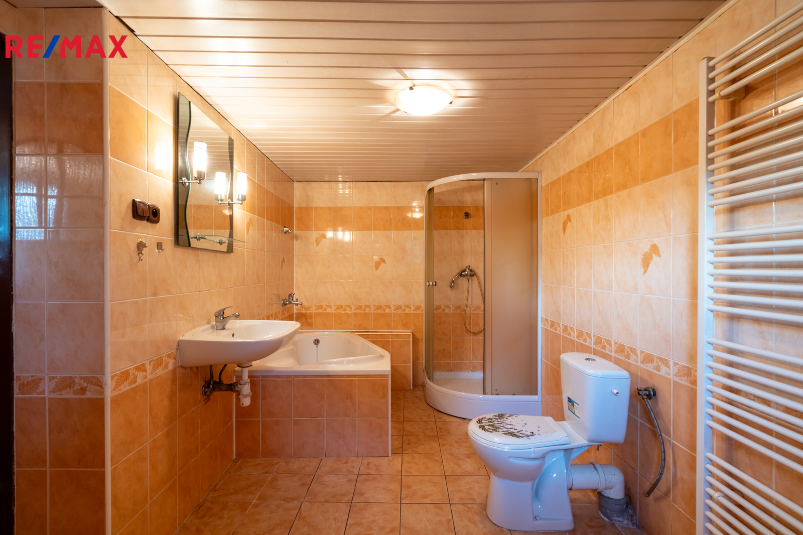 V koupelně najdete vanu, sprchový kout a WC.