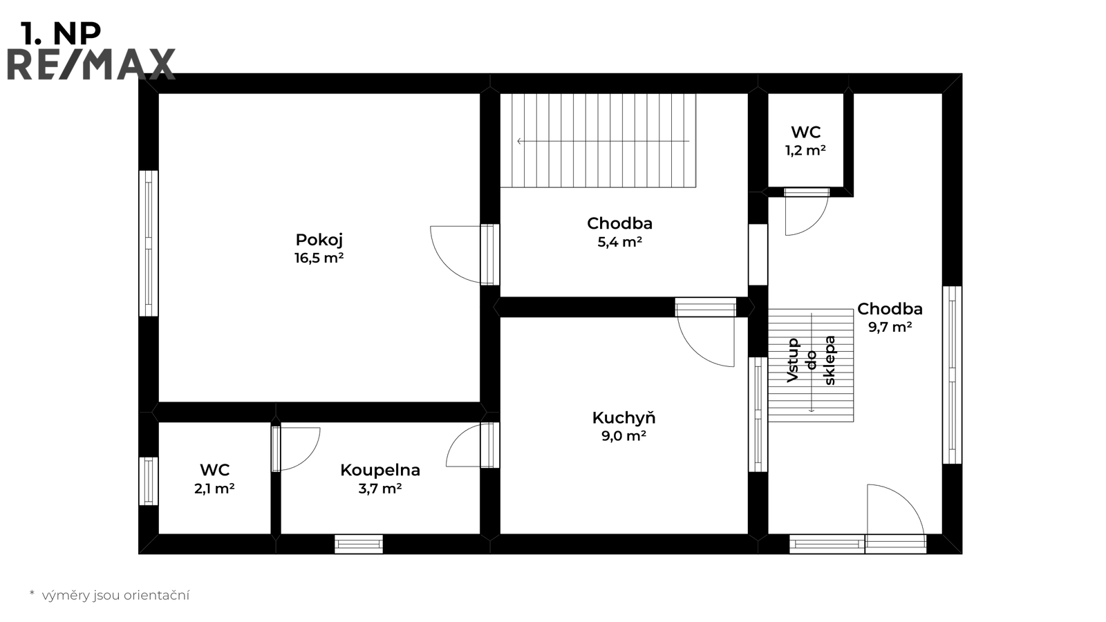 1.NP – prostorné zádveří se vstupem do sklepa, pokoj, kuchyně, koupelna s vanou, 2 x samostatná toaleta, 2x spíž