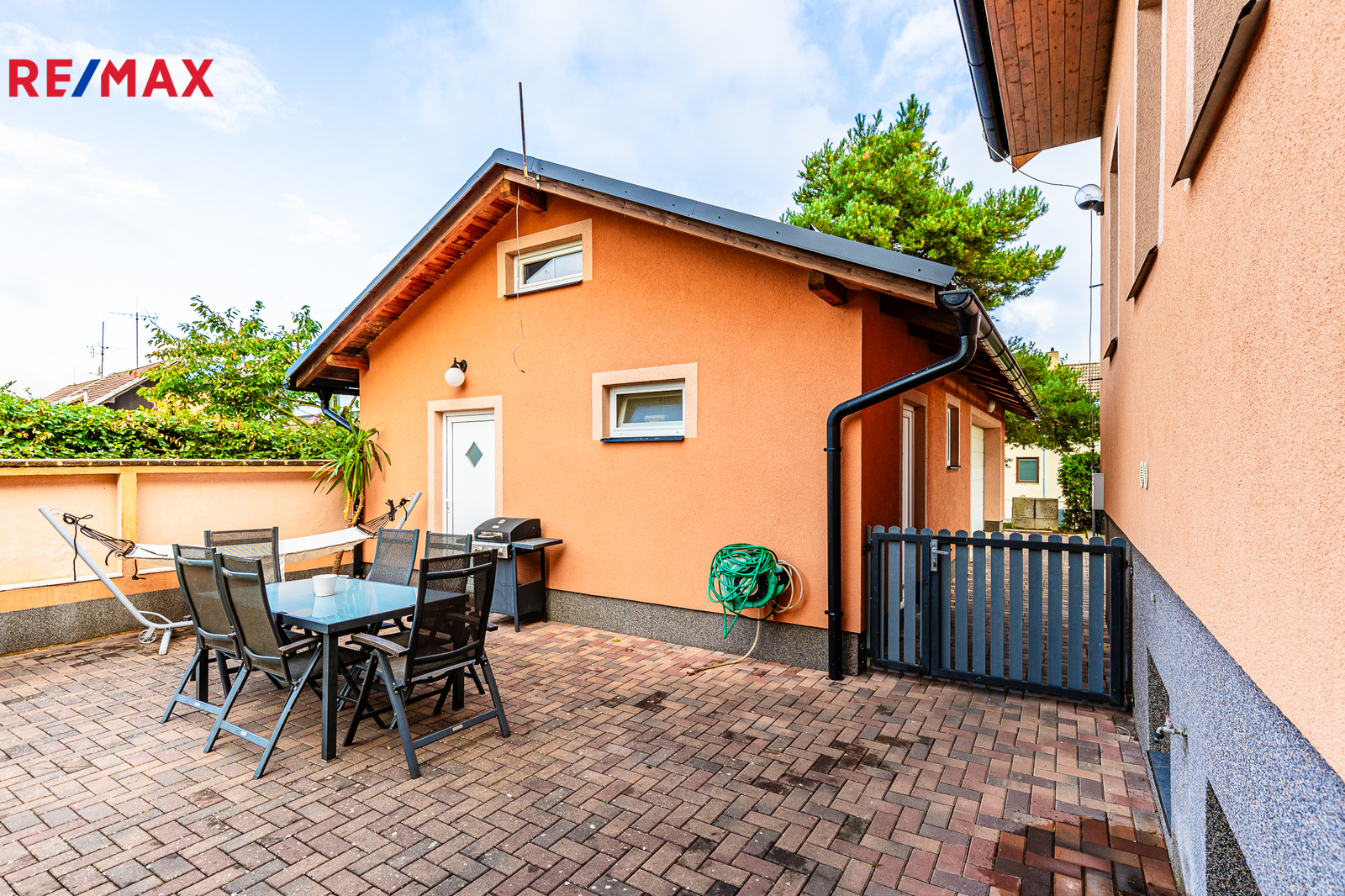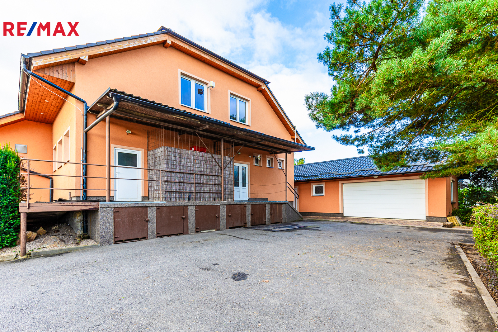 Pozemek kolem domu působí upraveně a klidně. Najdete zde garáž o velikosti 71 m², dostatek parkovacích ploch a prostor se vzrostlými stromy, který přirozeně propojuje dům s přírodou. Zahradní část doplňuje praktické venkovní zázemí – toaleta a umyvadlo, ideální pro letní posezení nebo menší akce.