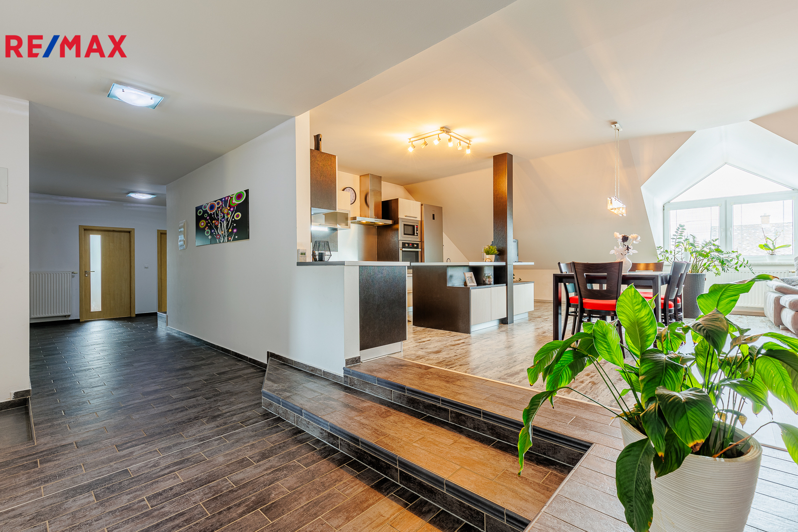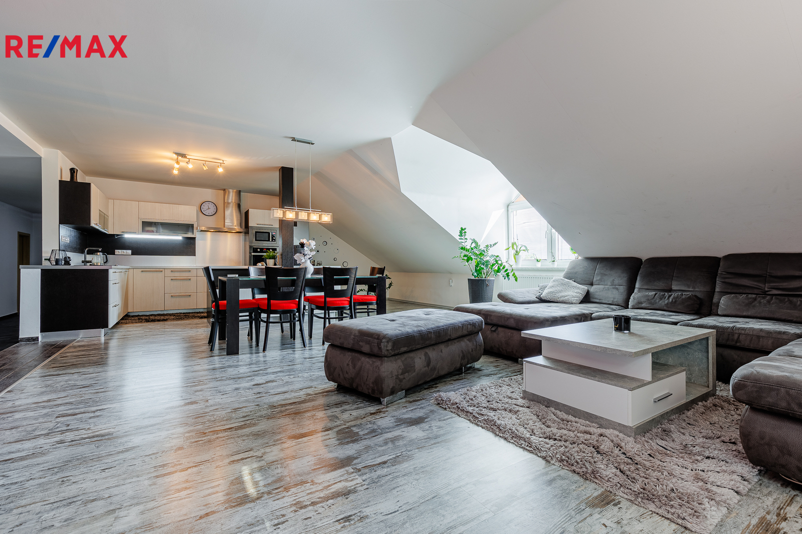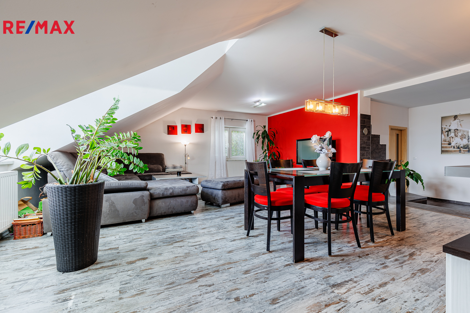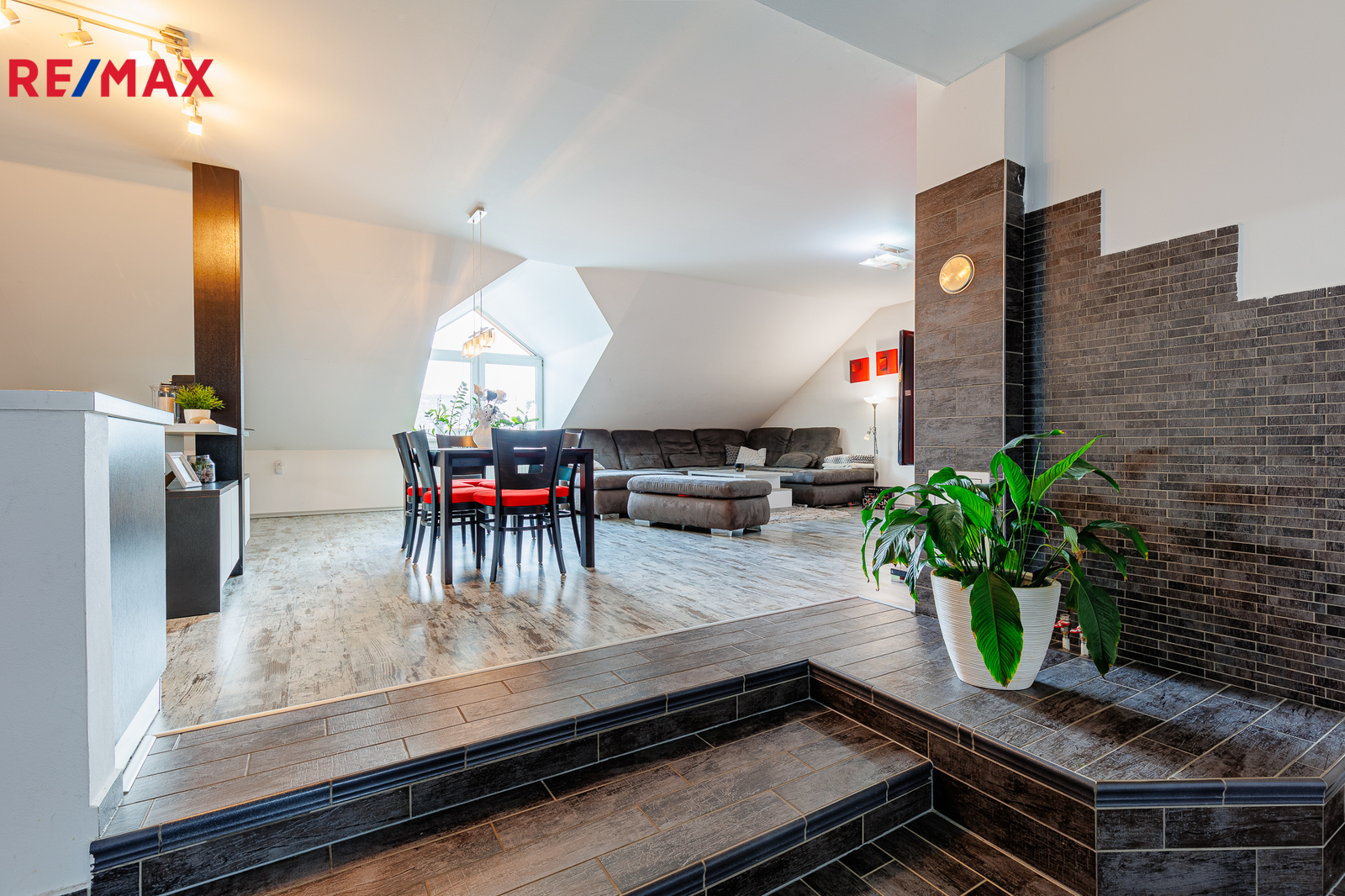 V patře, které bylo dostavěno v roce 2010, se nachází prostorný byt o dispozici 6+kk a celkové užitné ploše 174 m². Dominantou bytu je velký obývací pokoj s kuchyňským koutem, který působí vzdušně a nabízí spoustu prostoru pro rodinu i přátele. Dále jsou zde čtyři samostatné ložnice, pracovna, koupelna s vanou i sprchovým koutem, oddělené WC a komora. Byt je nadstandardně vybaven, světlý a pečlivě navržený do posledního detailu, aby poskytoval maximální komfort pro rodinné bydlení i případné pronájmy.