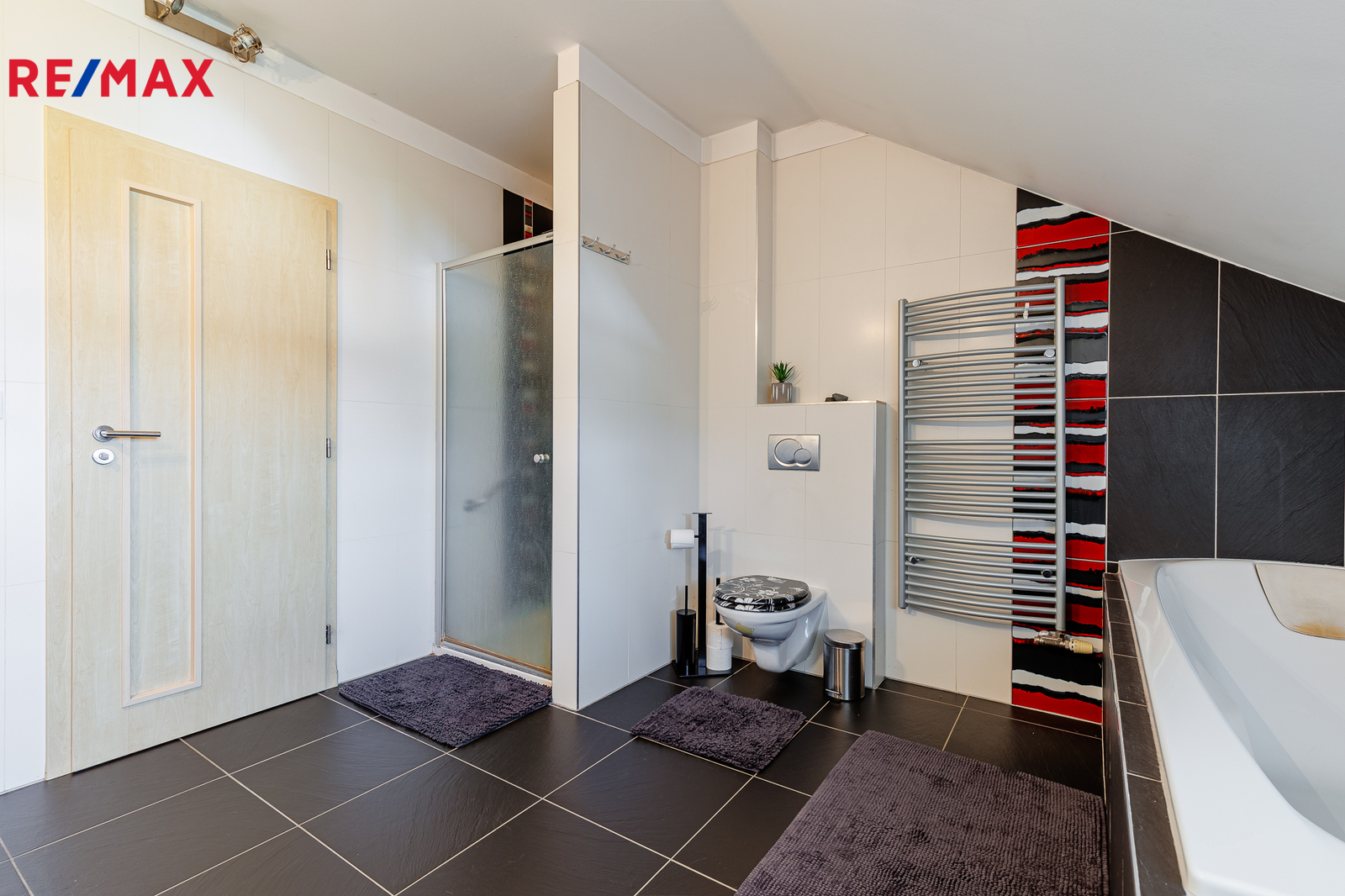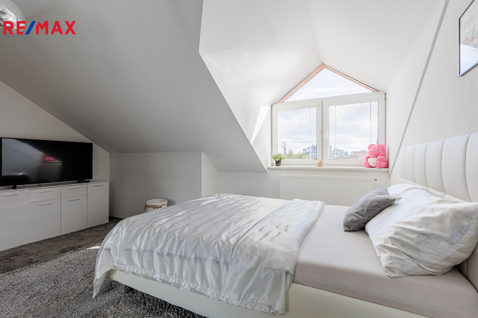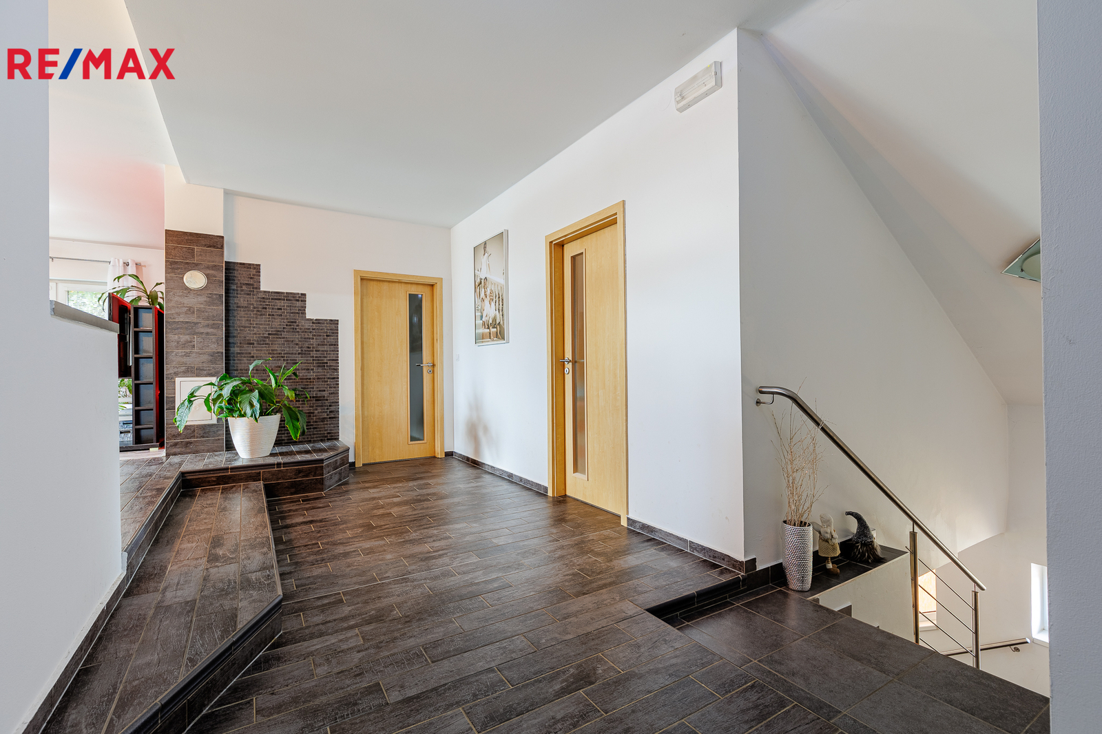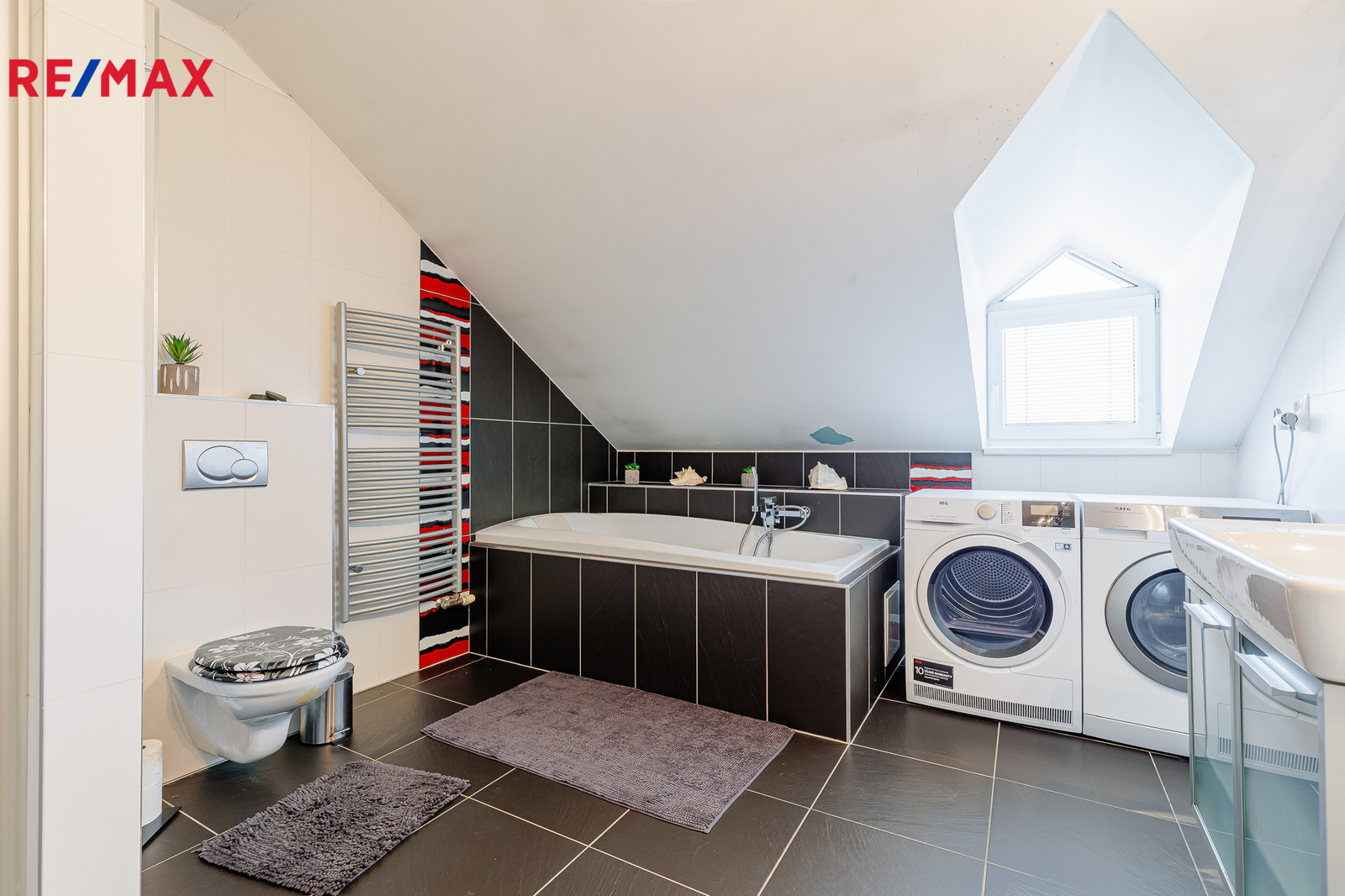 V patře, které bylo dostavěno v roce 2010, se nachází prostorný byt o dispozici 6+kk a celkové užitné ploše 174 m². Dominantou bytu je velký obývací pokoj s kuchyňským koutem, který působí vzdušně a nabízí spoustu prostoru pro rodinu i přátele. Dále jsou zde čtyři samostatné ložnice, pracovna, koupelna s vanou i sprchovým koutem, oddělené WC a komora. Byt je nadstandardně vybaven, světlý a pečlivě navržený do posledního detailu, aby poskytoval maximální komfort pro rodinné bydlení i případné pronájmy.