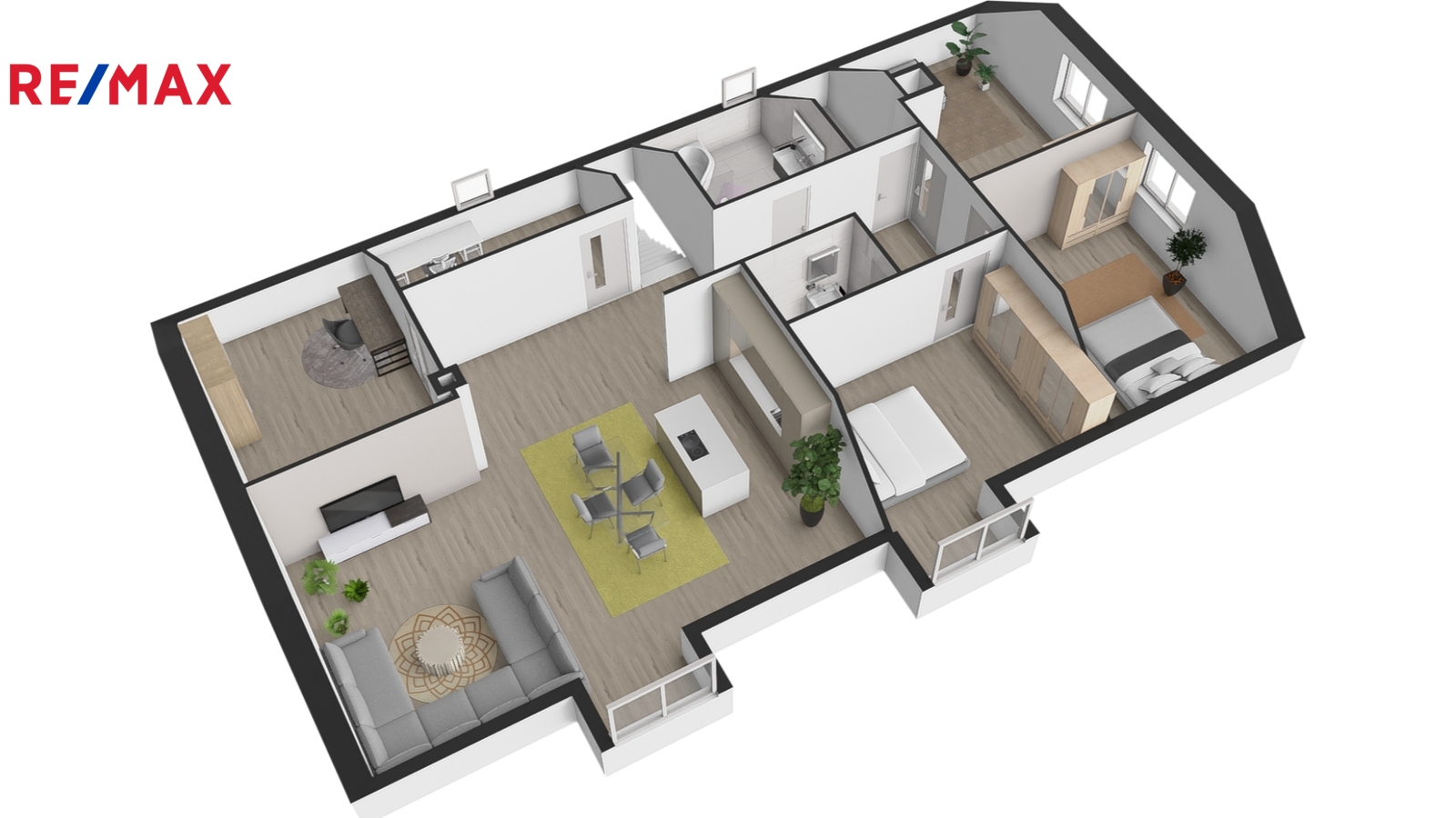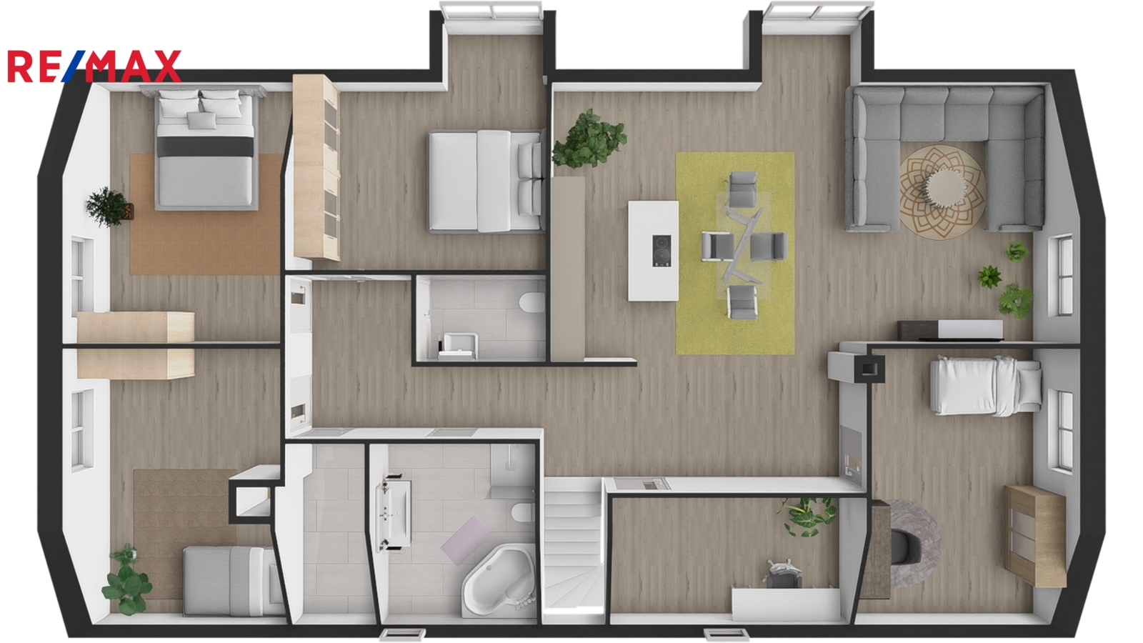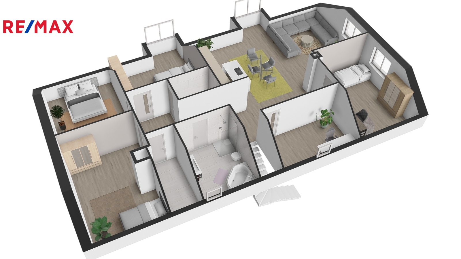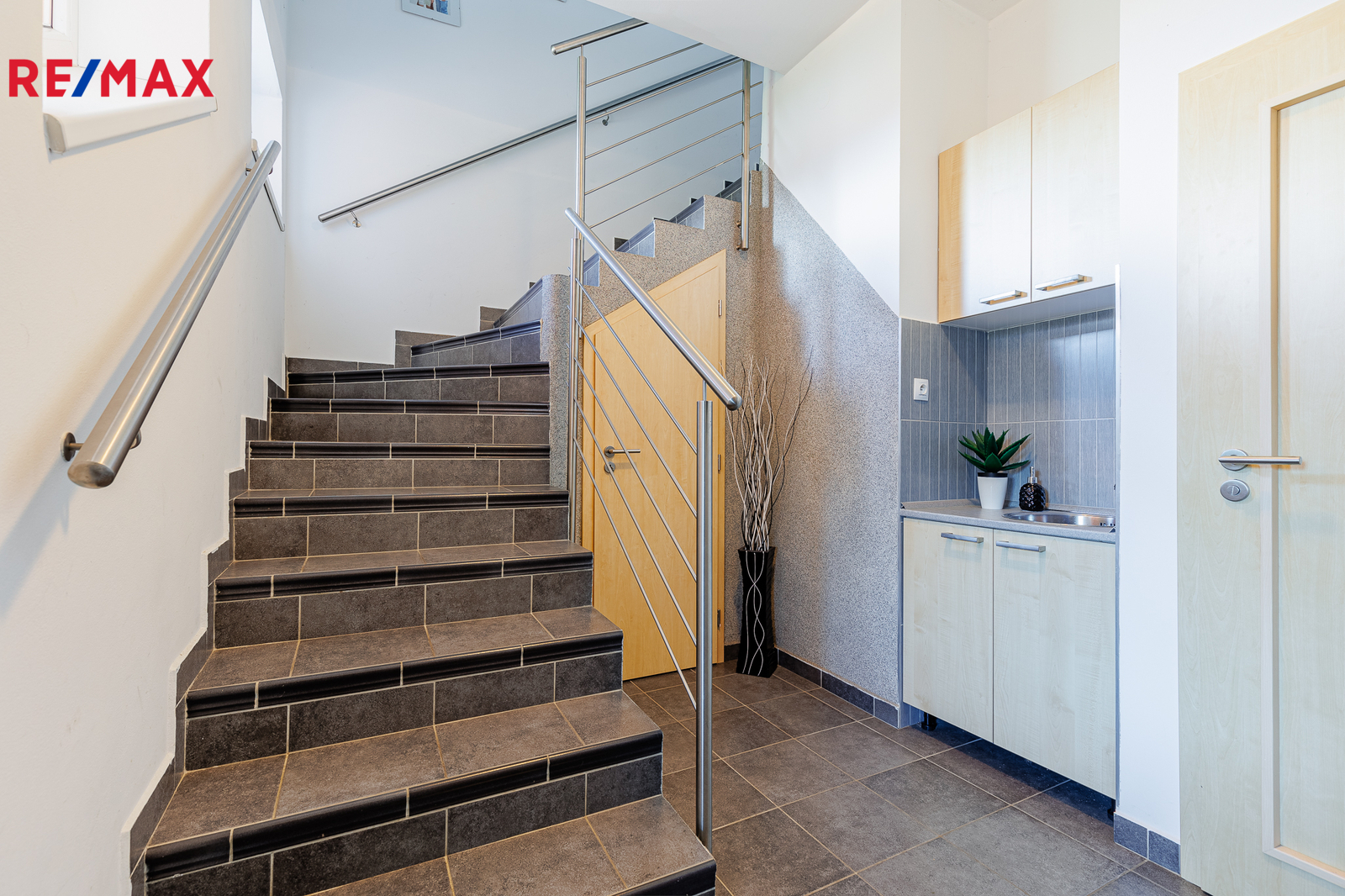 V patře, které bylo dostavěno v roce 2010, se nachází prostorný byt o dispozici 6+kk a celkové užitné ploše 174 m². Dominantou bytu je velký obývací pokoj s kuchyňským koutem, který působí vzdušně a nabízí spoustu prostoru pro rodinu i přátele. Dále jsou zde čtyři samostatné ložnice, pracovna, koupelna s vanou i sprchovým koutem, oddělené WC a komora. Byt je nadstandardně vybaven, světlý a pečlivě navržený do posledního detailu, aby poskytoval maximální komfort pro rodinné bydlení i případné pronájmy.