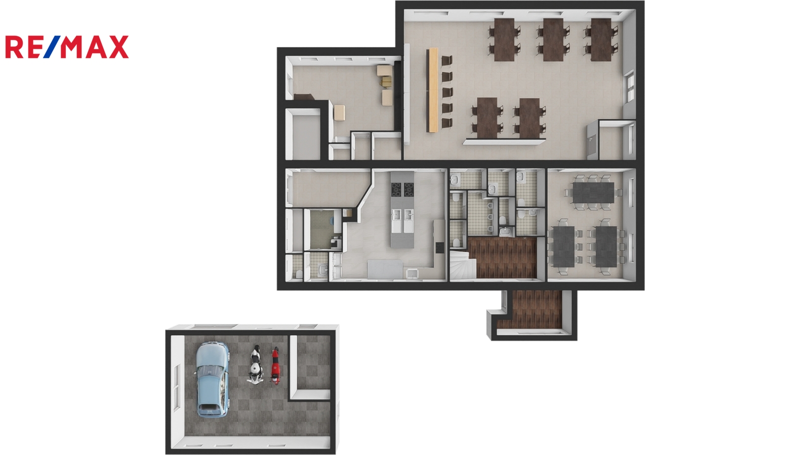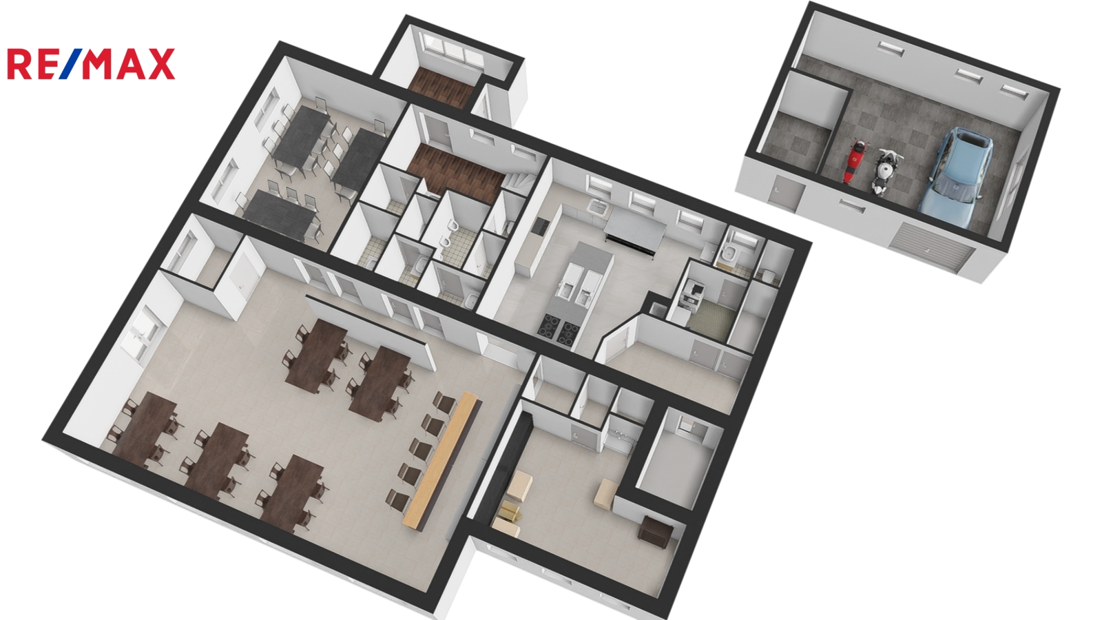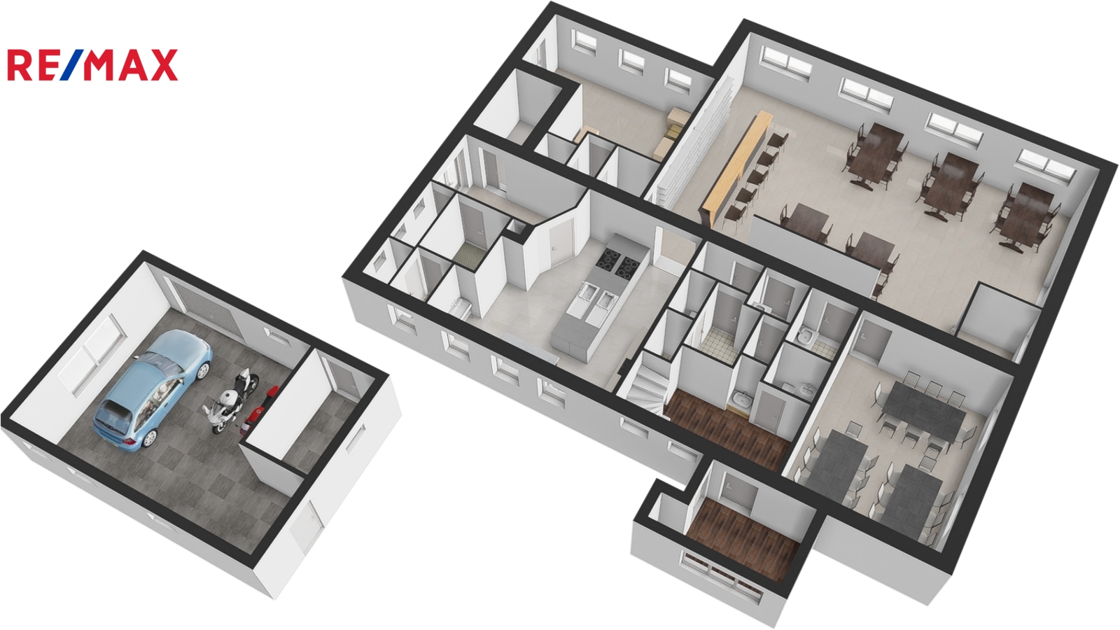 V přízemí se nachází bývalá restaurace, kterou majitelé provozovali řadu let. Provoz byl ukončen z osobních důvodů, ale prostor zůstal kompletně vybavený a ve velmi dobrém stavu. Díky samostatnému vstupu, kuchyňskému zázemí a sociálnímu zařízení lze na podnikání snadno navázat, případně prostor upravit pro jiný účel – například kavárnu, menší penzion, firemní sídlo nebo showroom.
