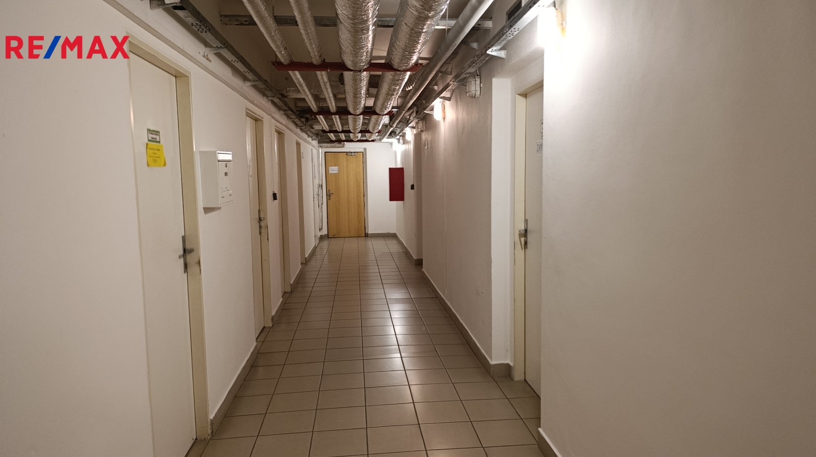 Z propojovací chodby mezi vchody 21 a 23 vedou uzavíratelné dveře do další chodby, která je osvětlena.