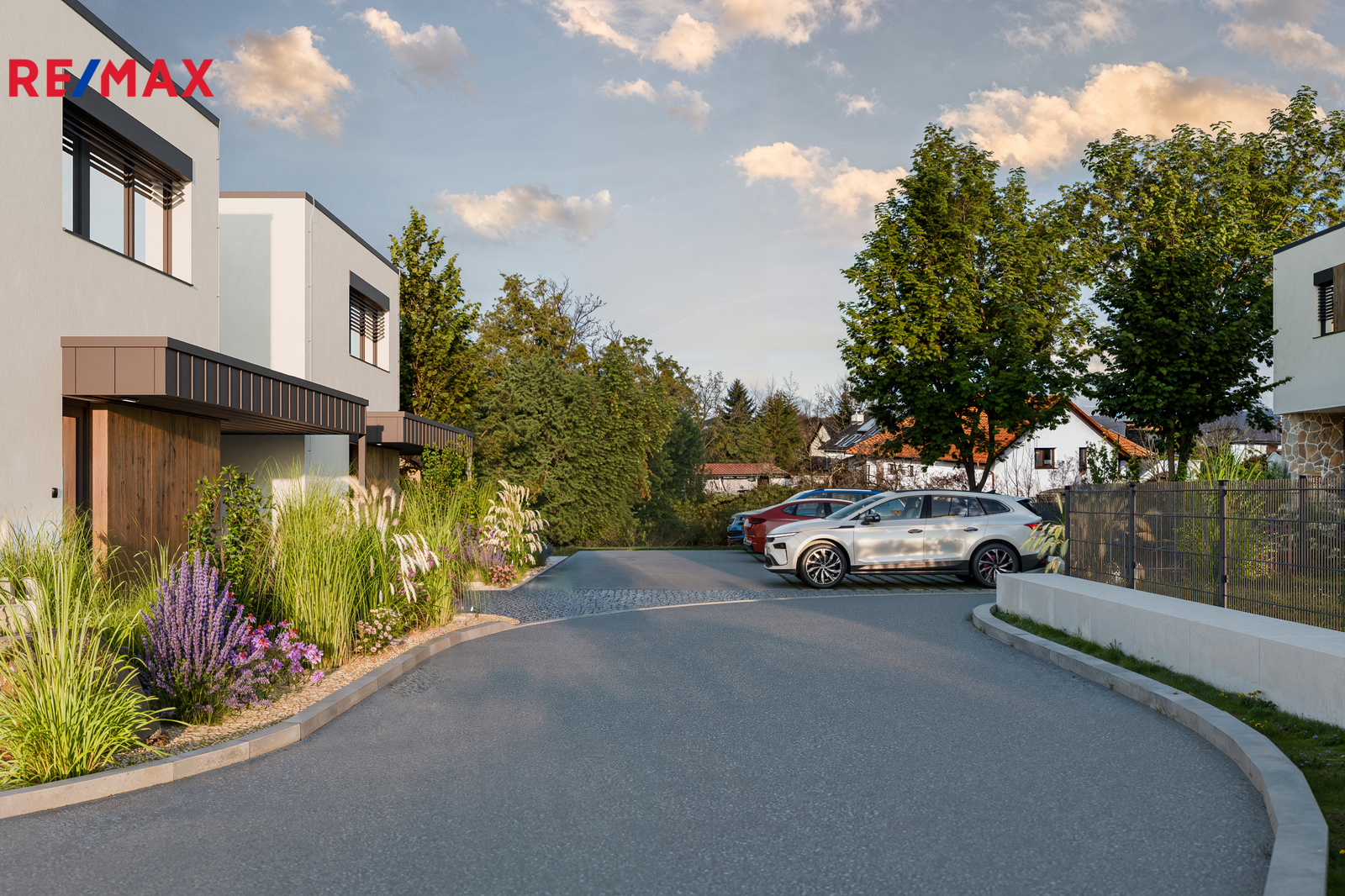 Součástí ceny je dokončený exteriér. Pozemek je oplocen svařovaným antracitovým plotem. Přední část pozemku je upravena zelení a doplněna o venkovní osvětlení se soumrakovým čidlem. Kryté parkovací stání je připraveno pro instalaci nabíjecího zařízení pro elektromobil.