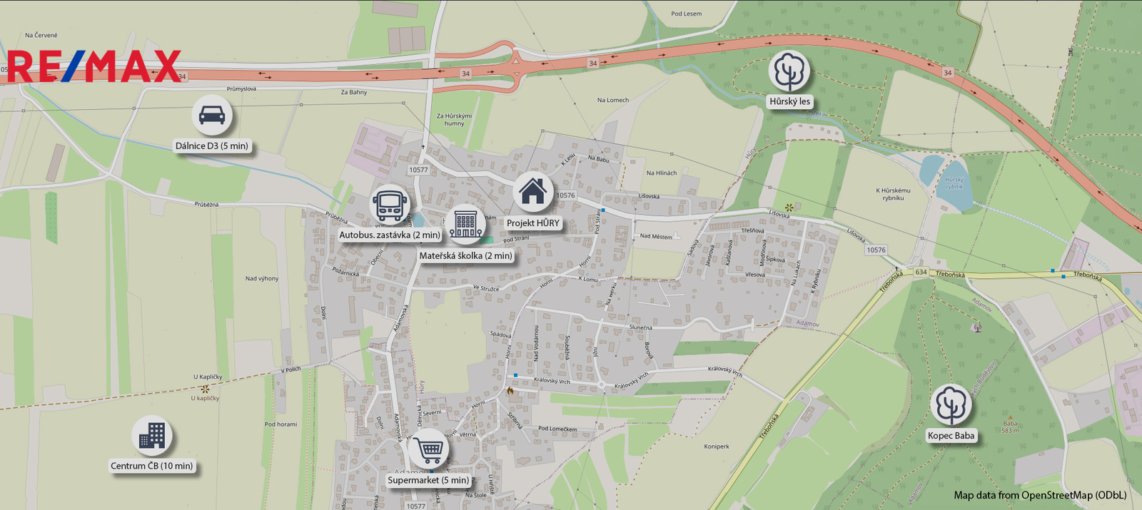 Nemovitost se nachází v obci Hůry, která nabízí klidné bydlení s dobrou dostupností do Českých Budějovic. Vzdálenost do centra města je přibližně 6 km, nájezd na dálnici D3 je dostupný do 5 minut jízdy. V obci je mateřská škola a zajištěna autobusová dopravní obslužnost.