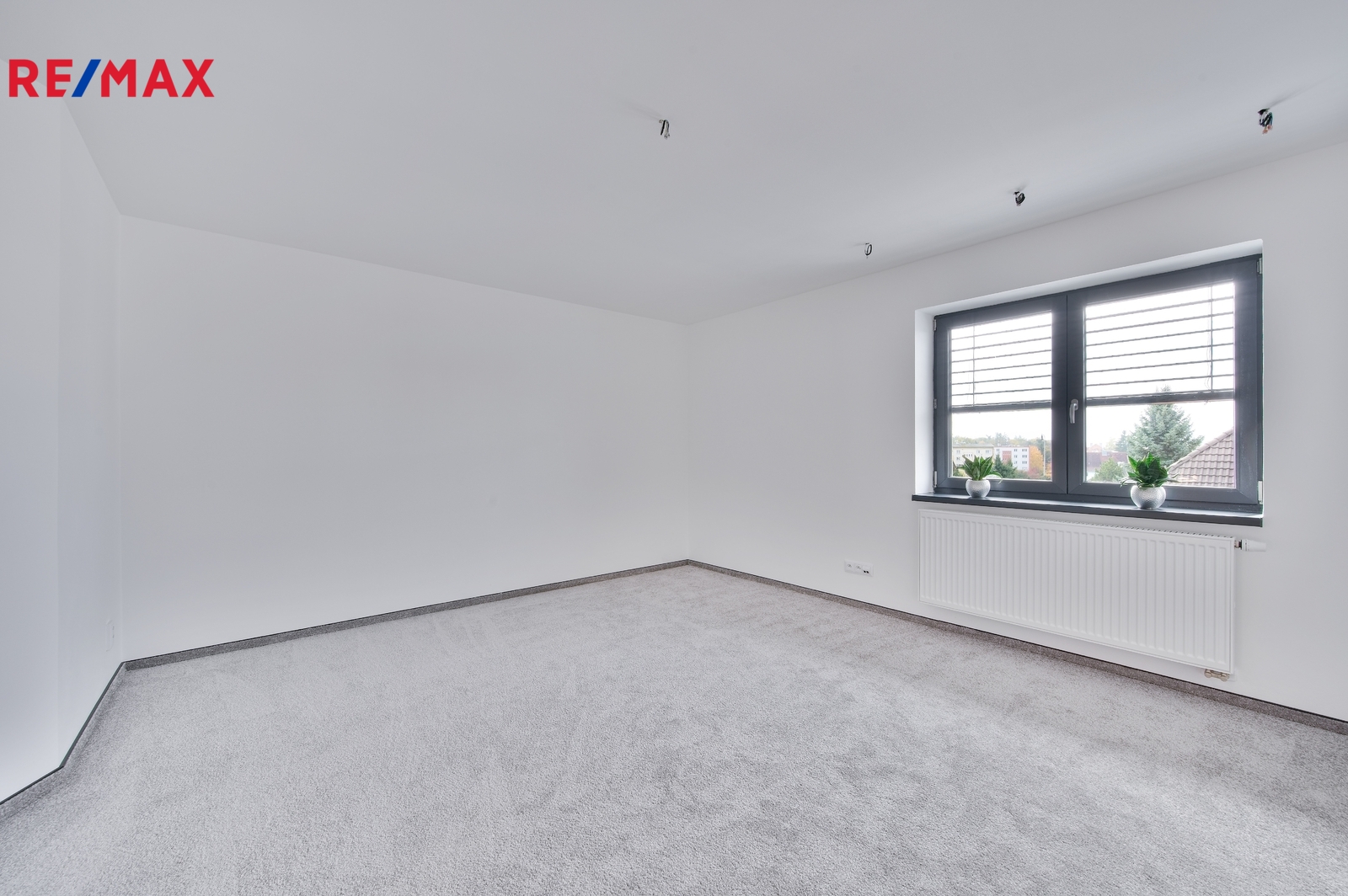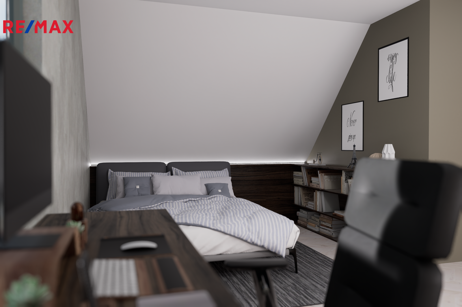 V patře domu jsou umístěny dvě velké ložnice, každá s vlastní šatnou, a další moderní koupelna, tentokrát vybavená sprchovým koutem. Prostor u schodiště je ideální pro vytvoření útulného čtecího koutu nebo domácí kanceláře.