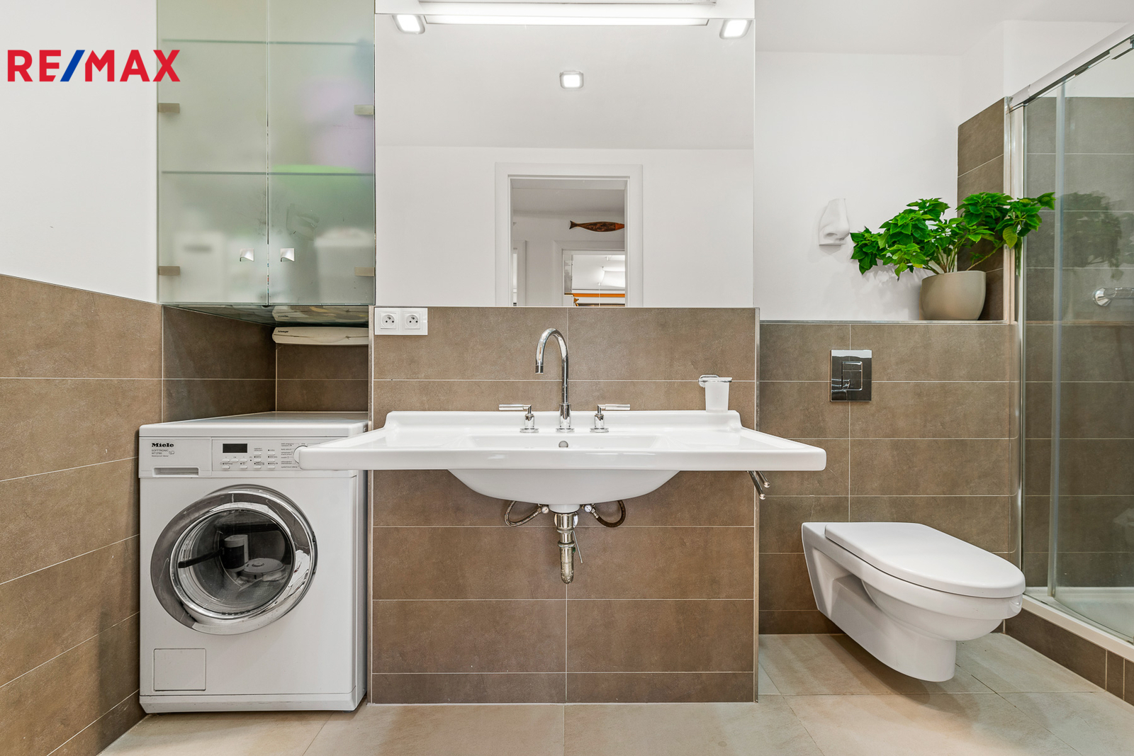 Interiér bytu je laděn do světlých přírodních tónů a byl zařízen s důrazem na vkus, kvalitu a nadčasový design. Byt nabízí výborně řešenou dispozici s prostorným obývacím pokojem, kuchyní a jídelní částí, oddělenou klidovou zónou se dvěma ložnicemi a třemi koupelnami. Každý detail byl promyšlen — od rozšířených dveřních otvorů po dokonalé technické vybavení.