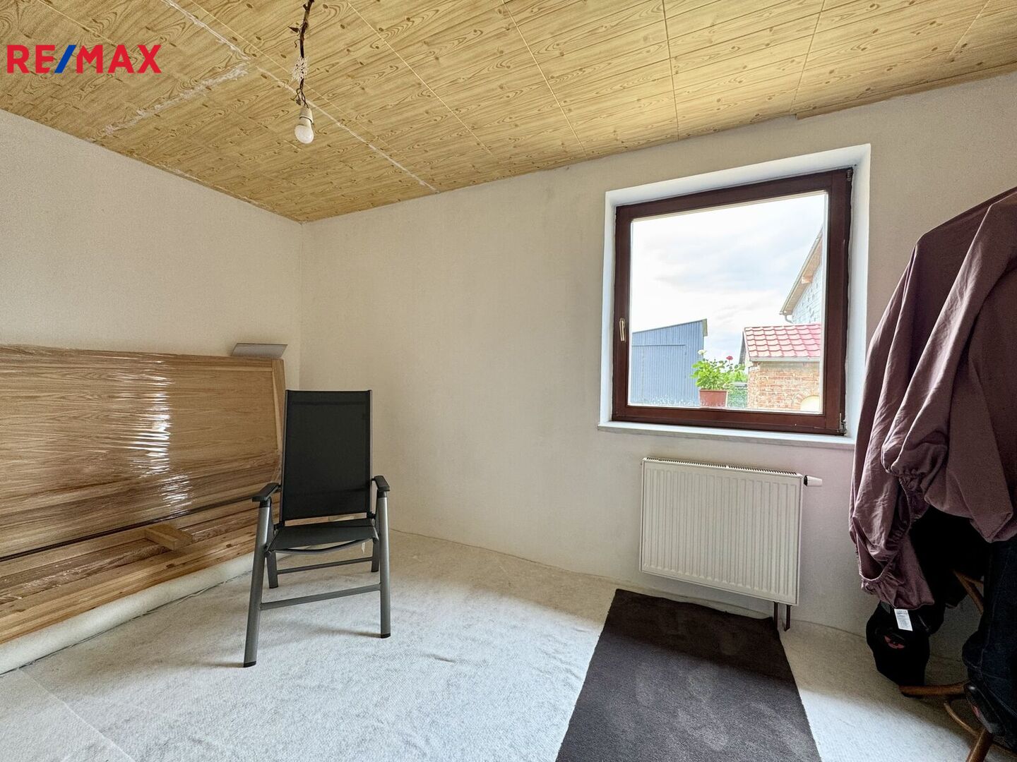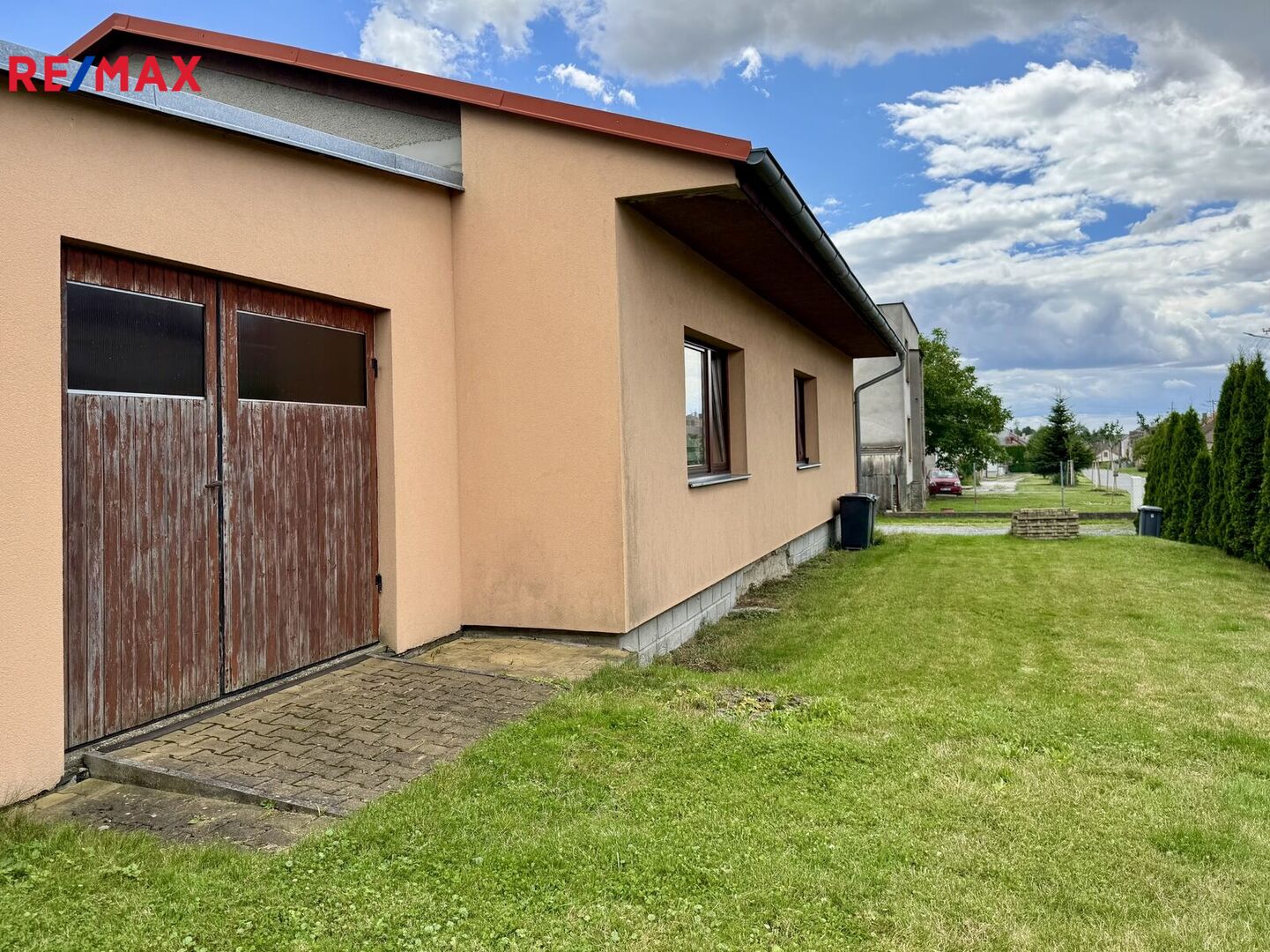 Rodinný dům je z cihel, zateplený 10 cm polystyrenem a má Euro okna. Vstup po schodišti do místnosti, která může být vstupní místností nebo pokojem, pokud by se změnil způsob vstupu do domu chodbou. Dlouhou chodbou jsou vstupy na WC, do koupelny s vanou a sprchovým koutem, pokoje, který je nutné ještě dobudovat (podlaha), ložnice, obývacího pokoje, kuchyně. Z kuchyně je vstup do spíže. V domě je technická místnost s východem na zahradu. V technické místnosti jsou kamna na TP, plynový kotel a nádrže na vodu. Podlahy v domě jsou dlažba a plovoucí podlahy v pokojích. V předsíni výklenek na vestavěné skříně. Dispozičně 3+1 a v případě změny vstupních dveří 4+1. K domu přiléhá garáž s elektrickými vraty a výminek 1+kk, který není zateplený a má plastová i dřevěná okna.