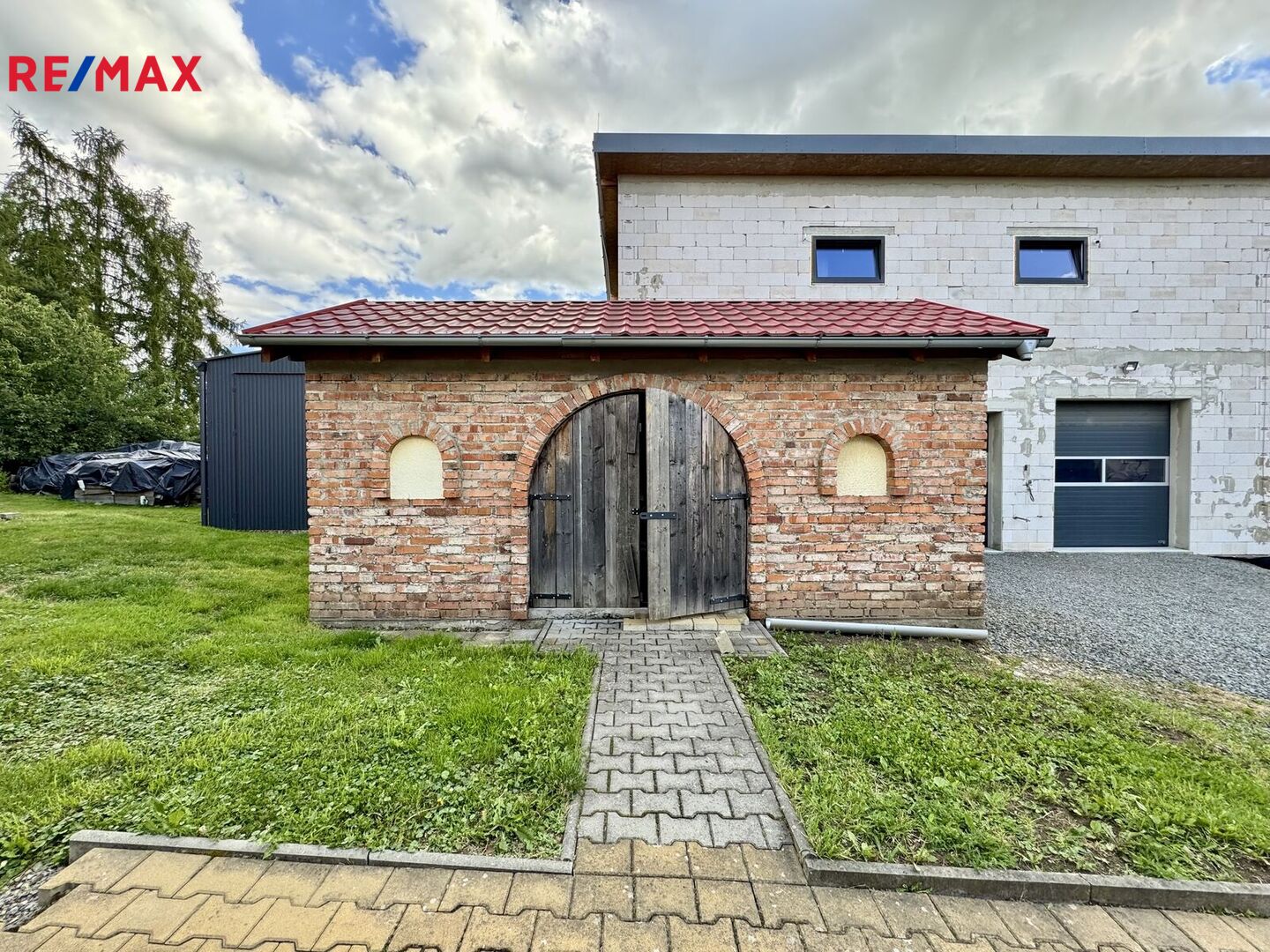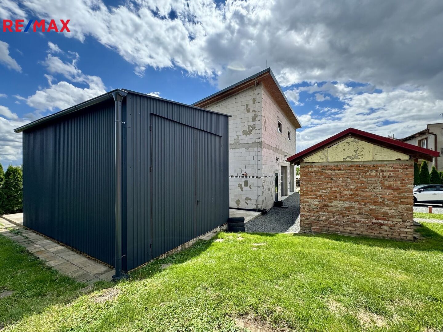 Na pozemek je vjezd elektrickými vraty na větší parkovací plochu, kde je vjezd přímo k autodílně. Autodílna je dvoupodlažní, vjezd dvěma elektrickými vraty a vstup dveřmi. V přízemí, které má 100 m2, je plně vybavená dílna se 3 zvedáky a dalšími přístroji včetně náhradních autodílů. K dispozici WC s umyvadlem. Ve 2.NP je sklad, kde je možné vybudovat zázemí. Stavba je z tvárnic, střecha zateplená foukanou izolací. K dodělání strop a zateplení s fasádou. Dílna je vytápěna z kotelny domu. Na bočních stěnách dílny jsou fotovoltaické panely a elektřinu je možné využít i v domě.
